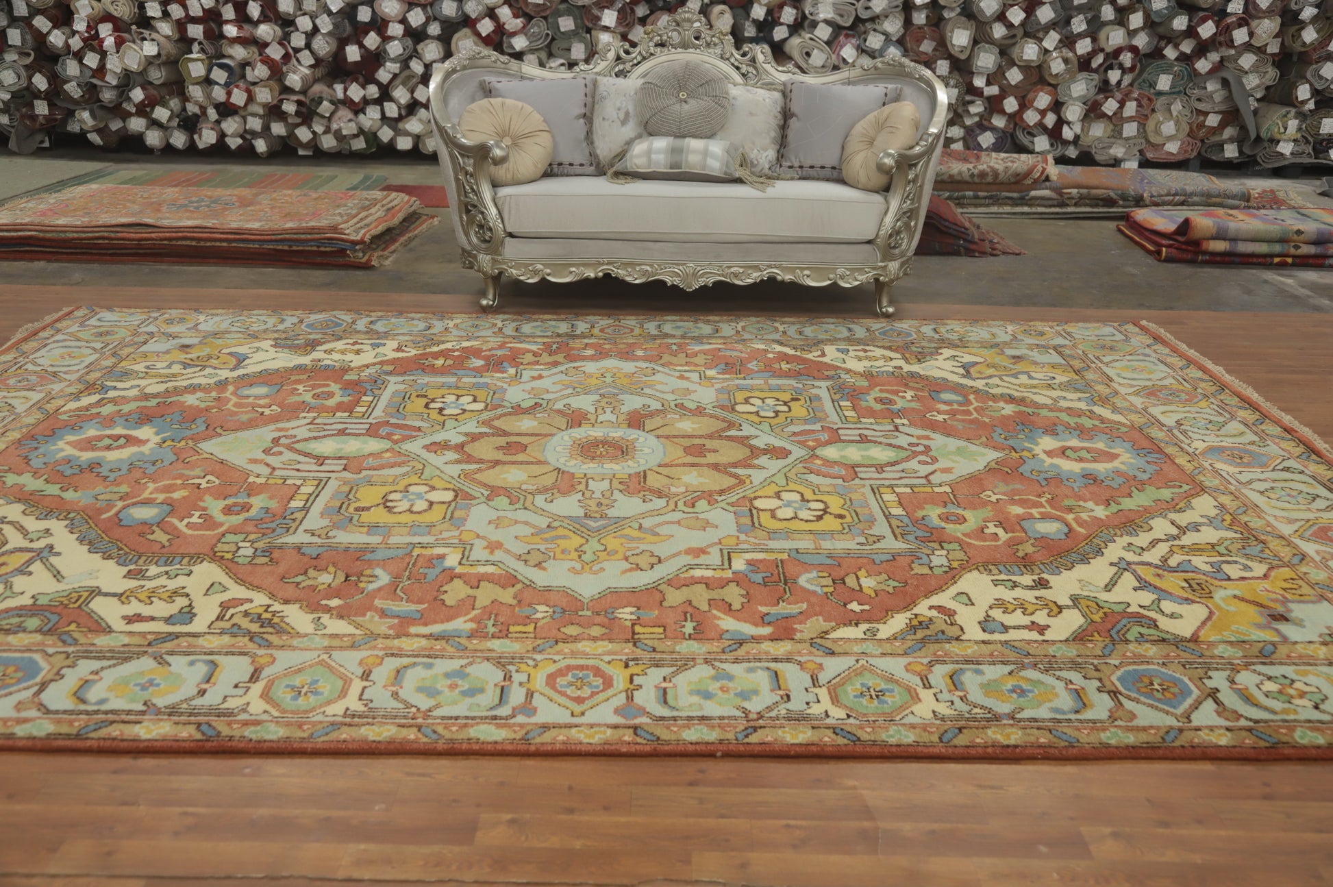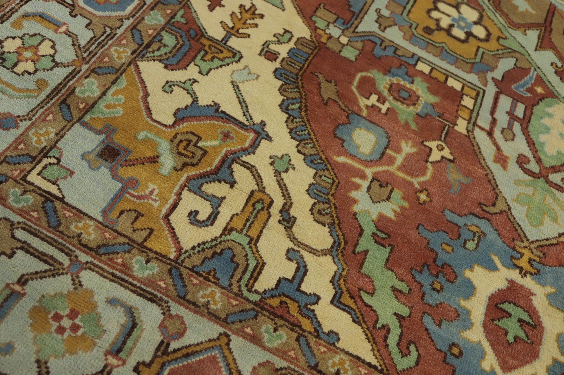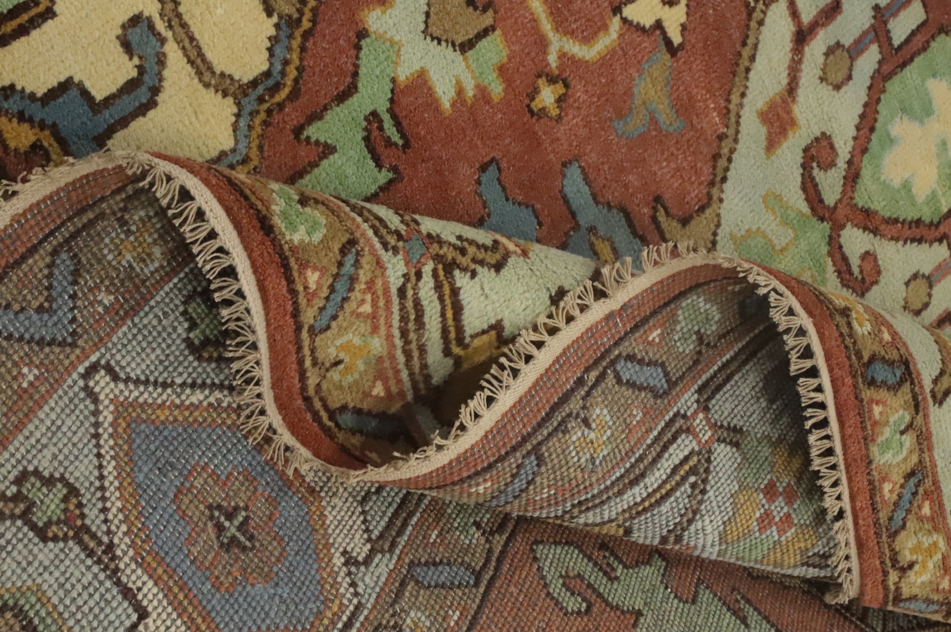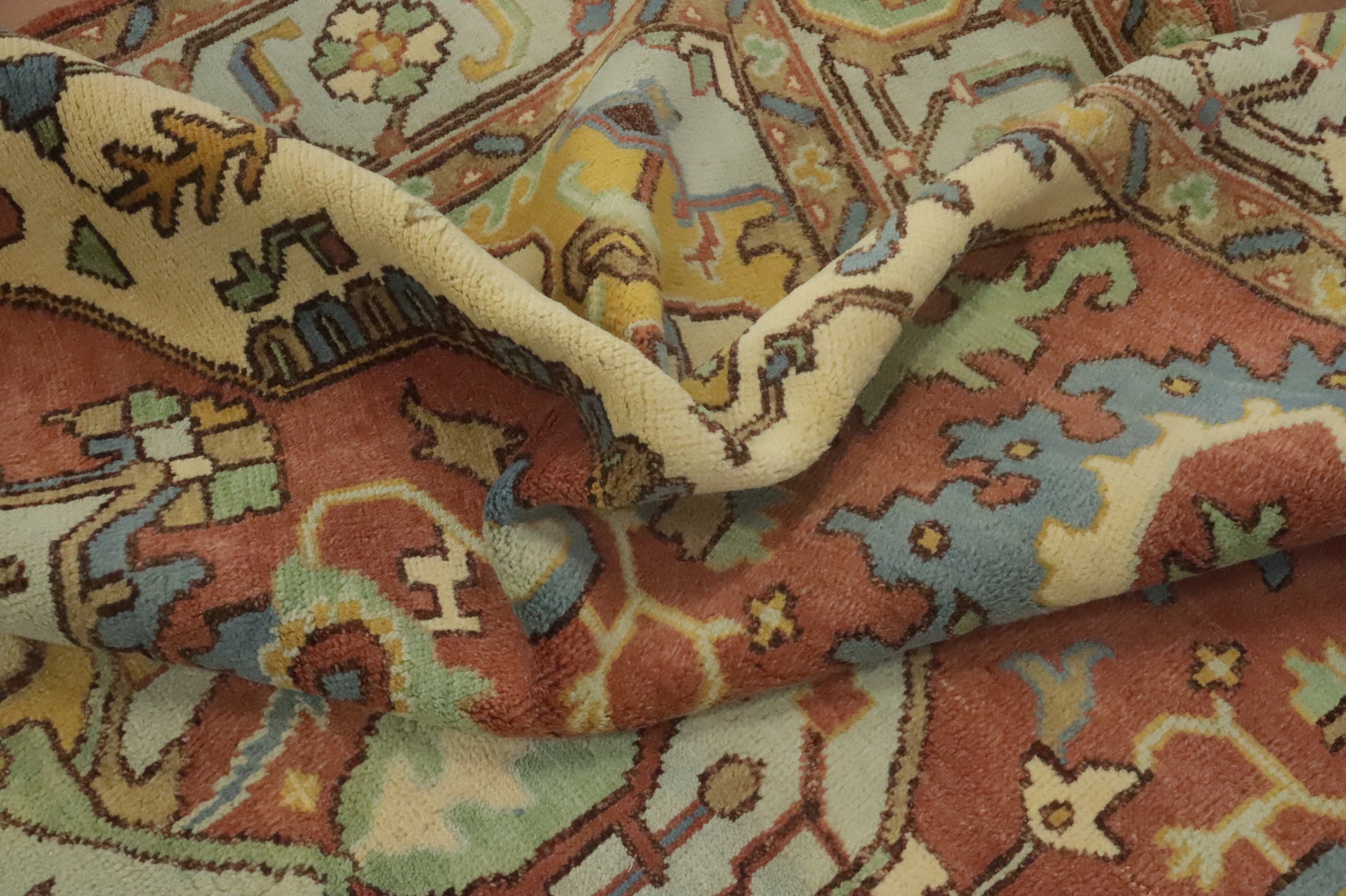 A Beautiful Genuine India Heriz (serapi) rug is Hand Knotted by skillful weavers in India with 100% Wool Material. This rug is in New, First Quality condition. dimensions are 14' 3'' X 9' 10'' in foot and 434 X 300 in centimeter. the primary color is Oranges & Rust.