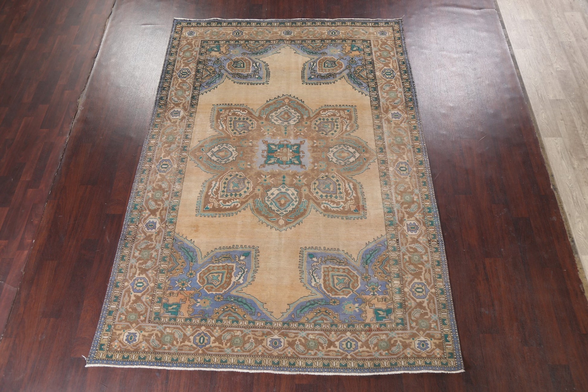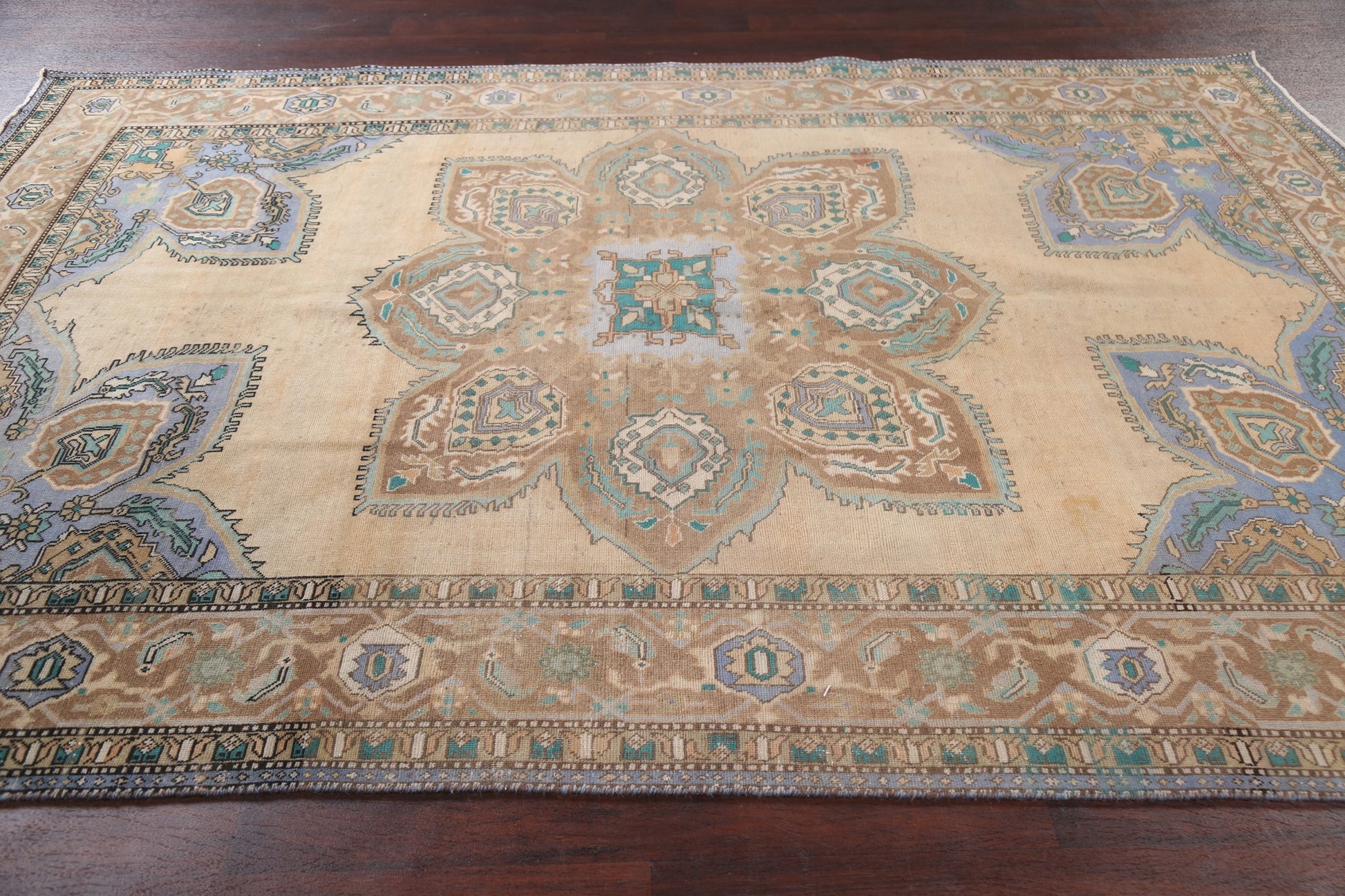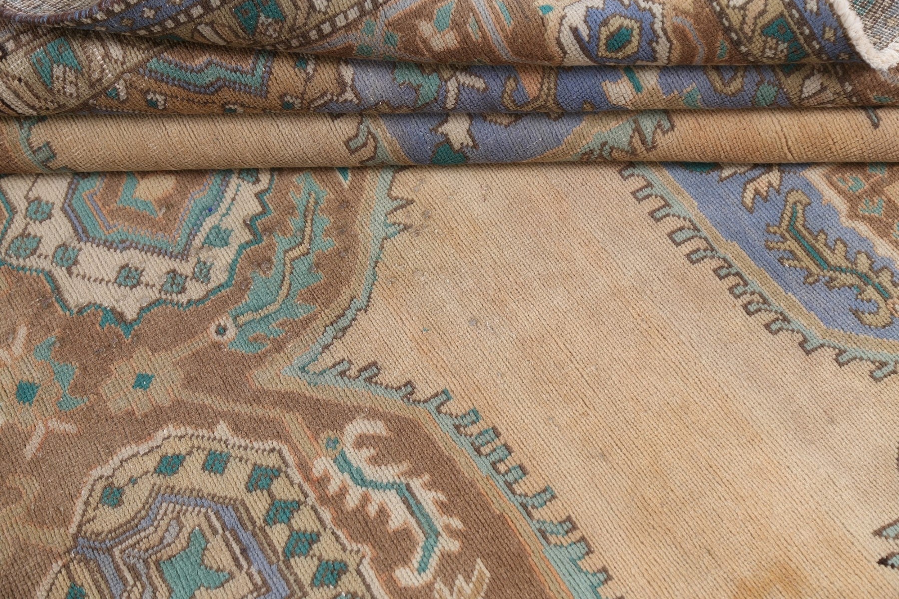 A Beautiful Genuine Persia ( Persia ) Heriz (serapi) rug is Hand Knotted by skillful weavers in Persia ( Persia ) with 100% Wool Material. This rug is in Very Good (Low Pile Spots) condition. dimensions are 10' 4'' X 7' 3'' in foot and 315 X 221 in centimeter. the primary color is Peach.