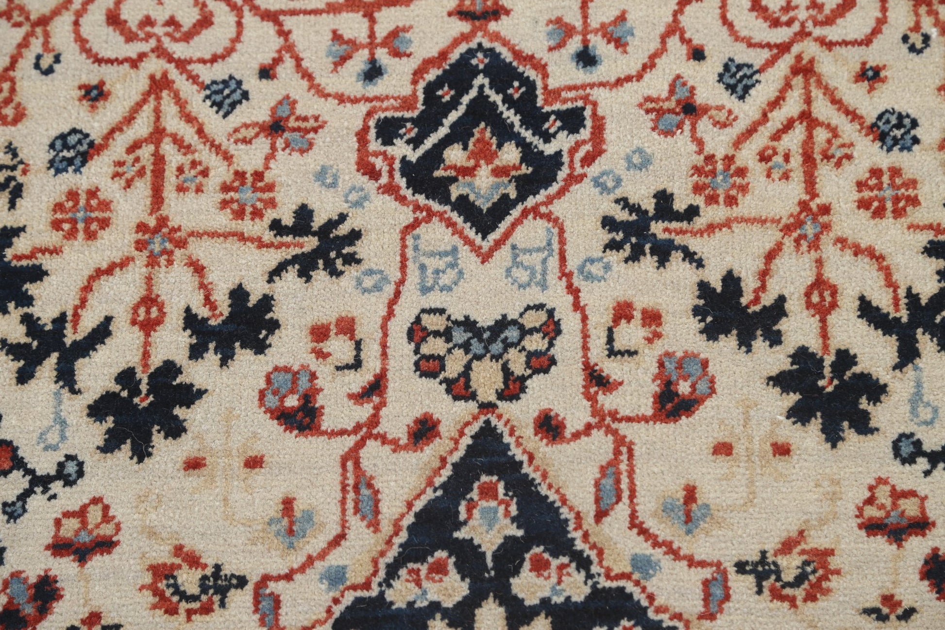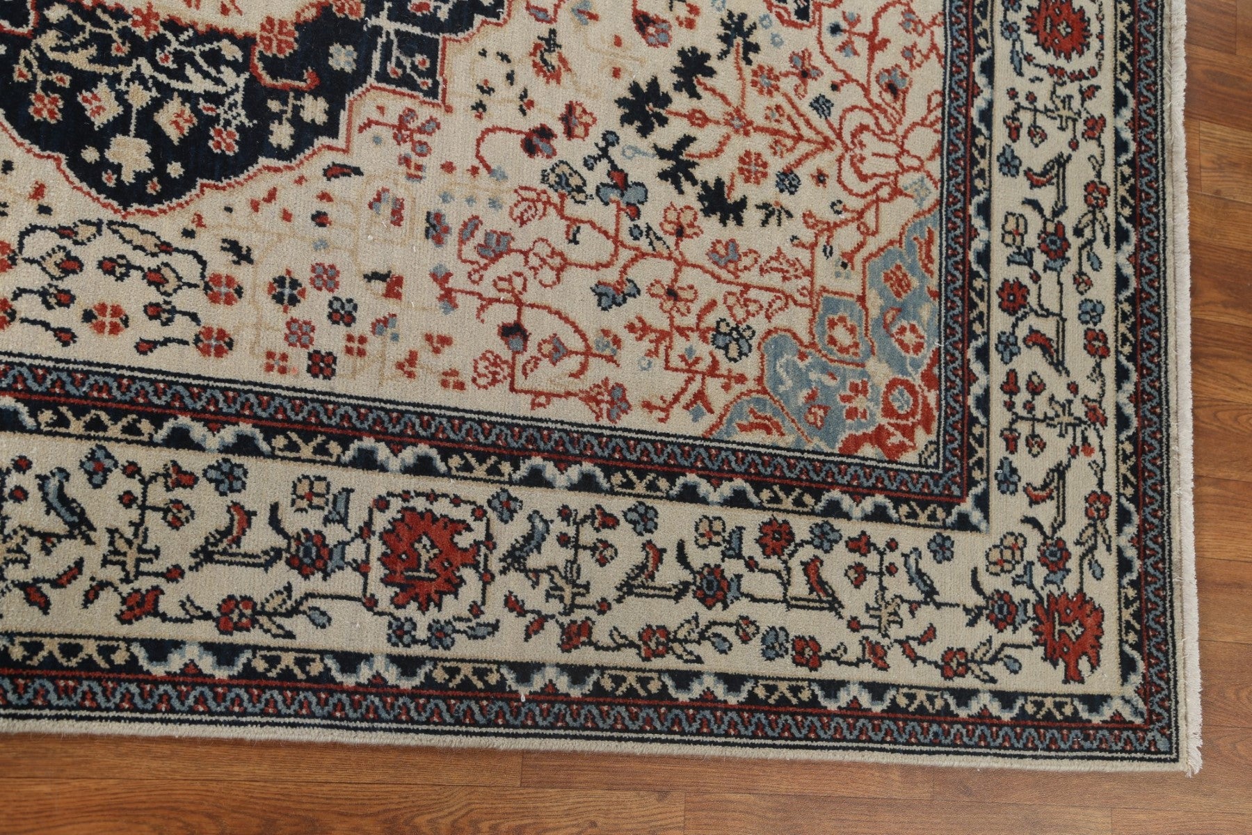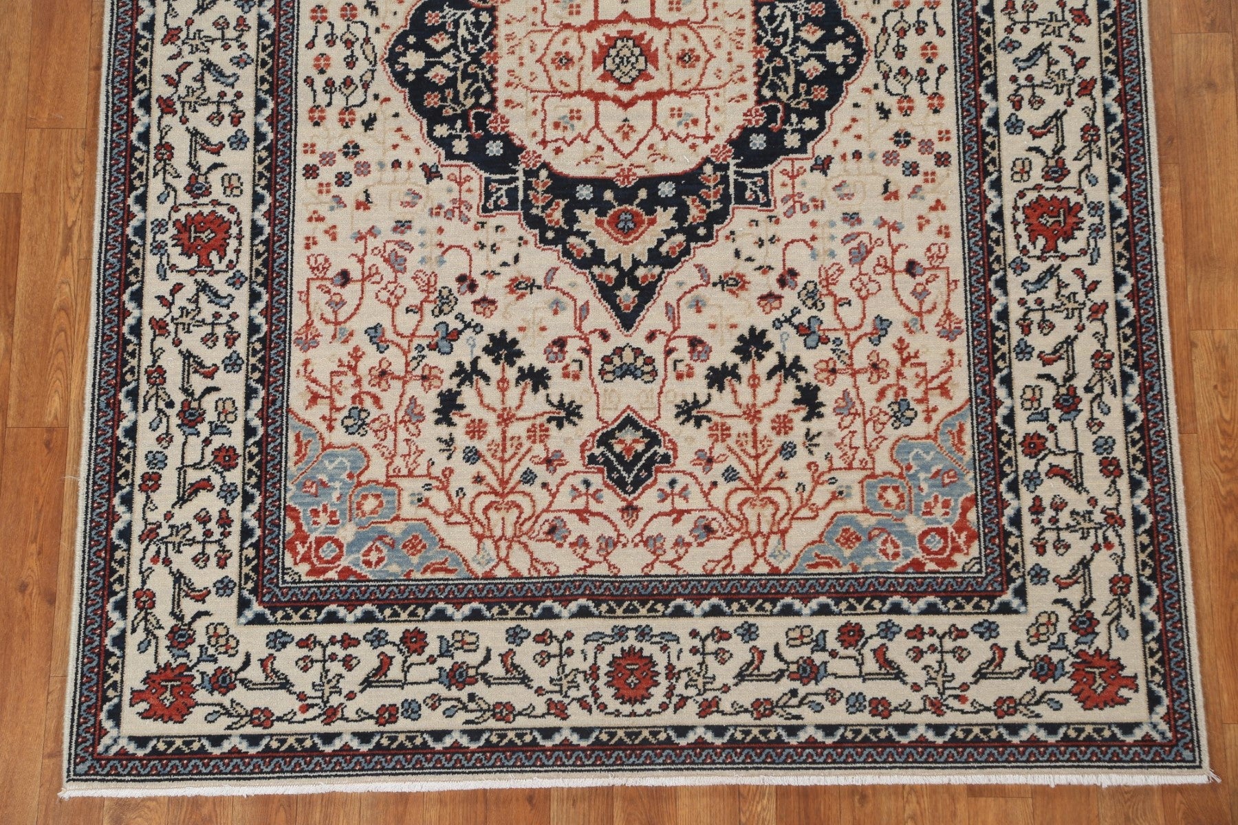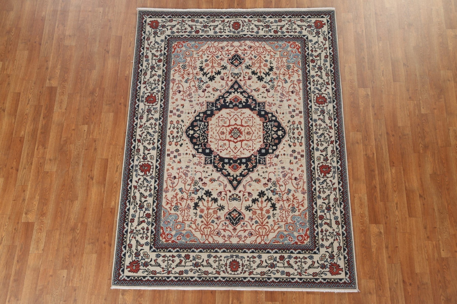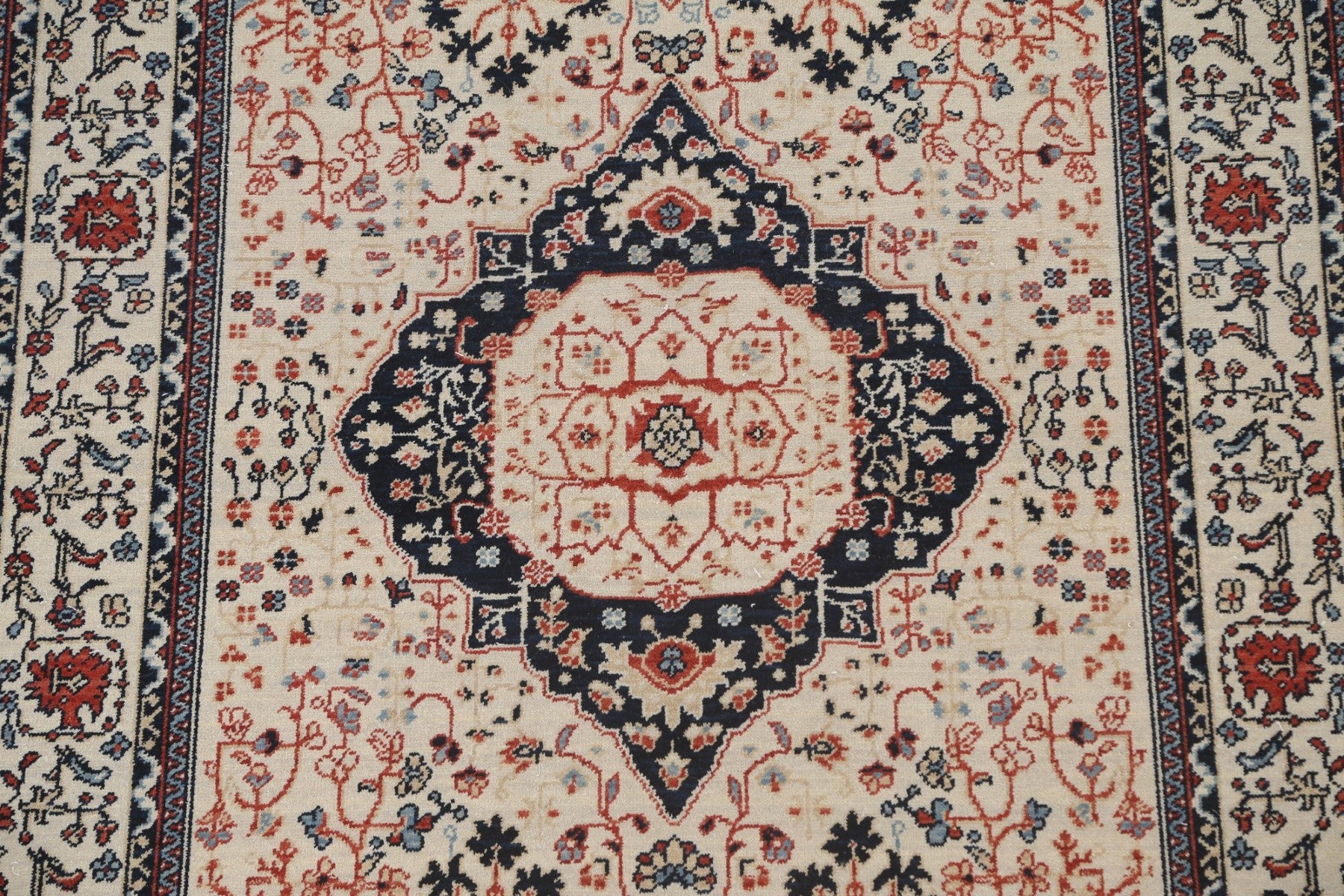 A Beautiful Genuine Turkey Kashan (Mohtasham) rug is Hand Knotted by skillful weavers in Turkey with 100% Wool Material. This rug is in New, First Quality condition. dimensions are 6' 10'' X 5' 0'' in foot and 208 X 152 in centimeter. the primary color is Beige & Ivories.