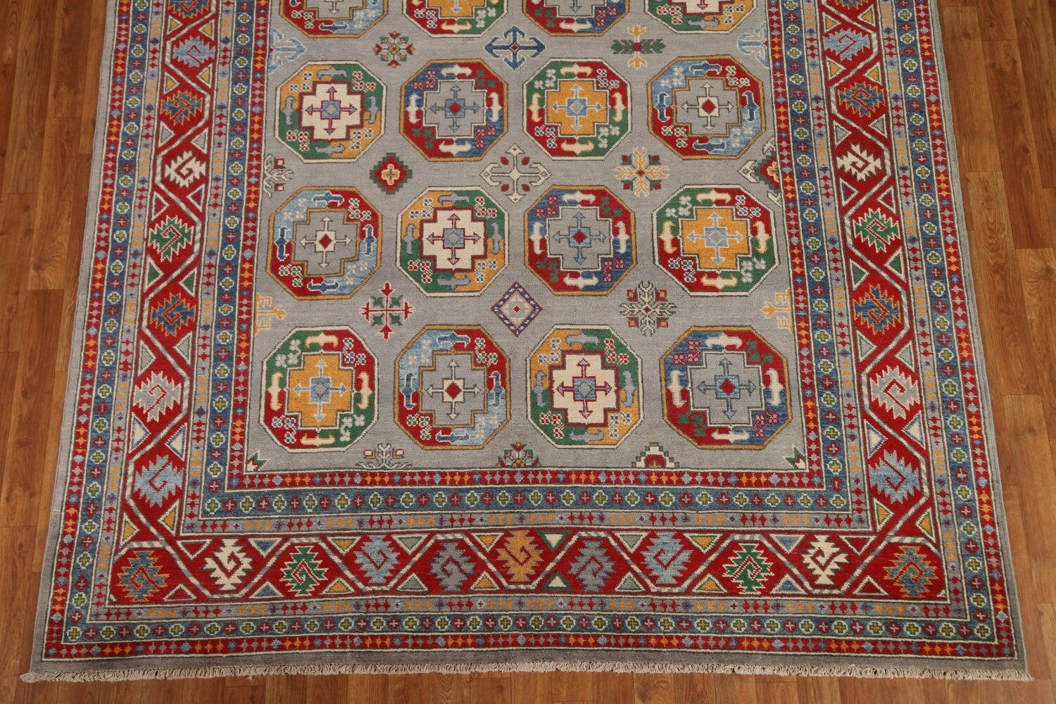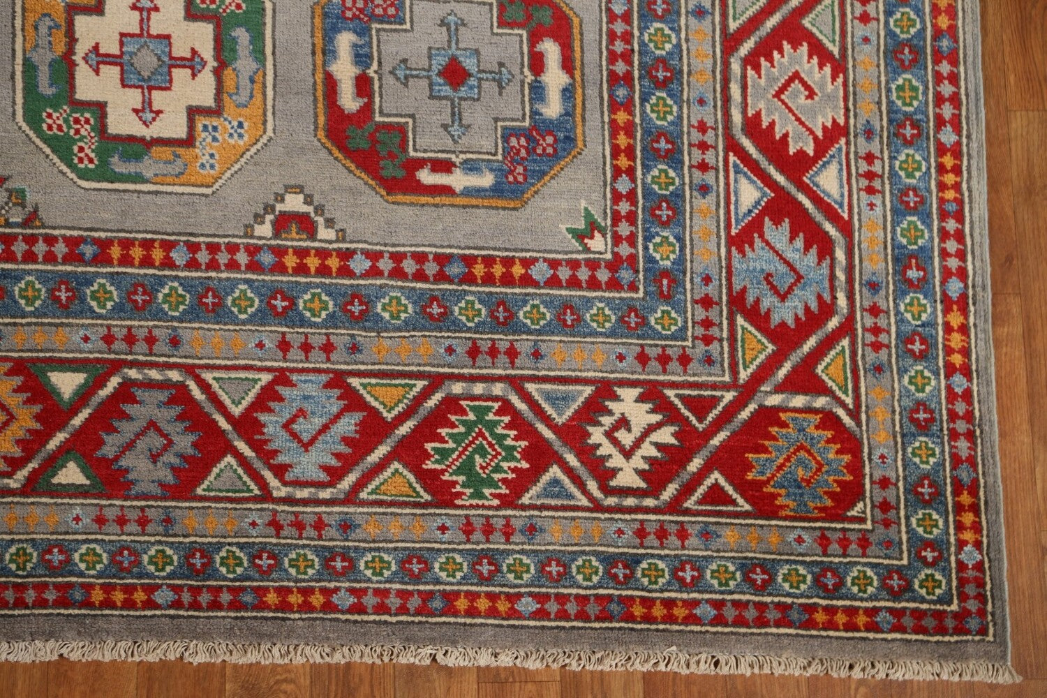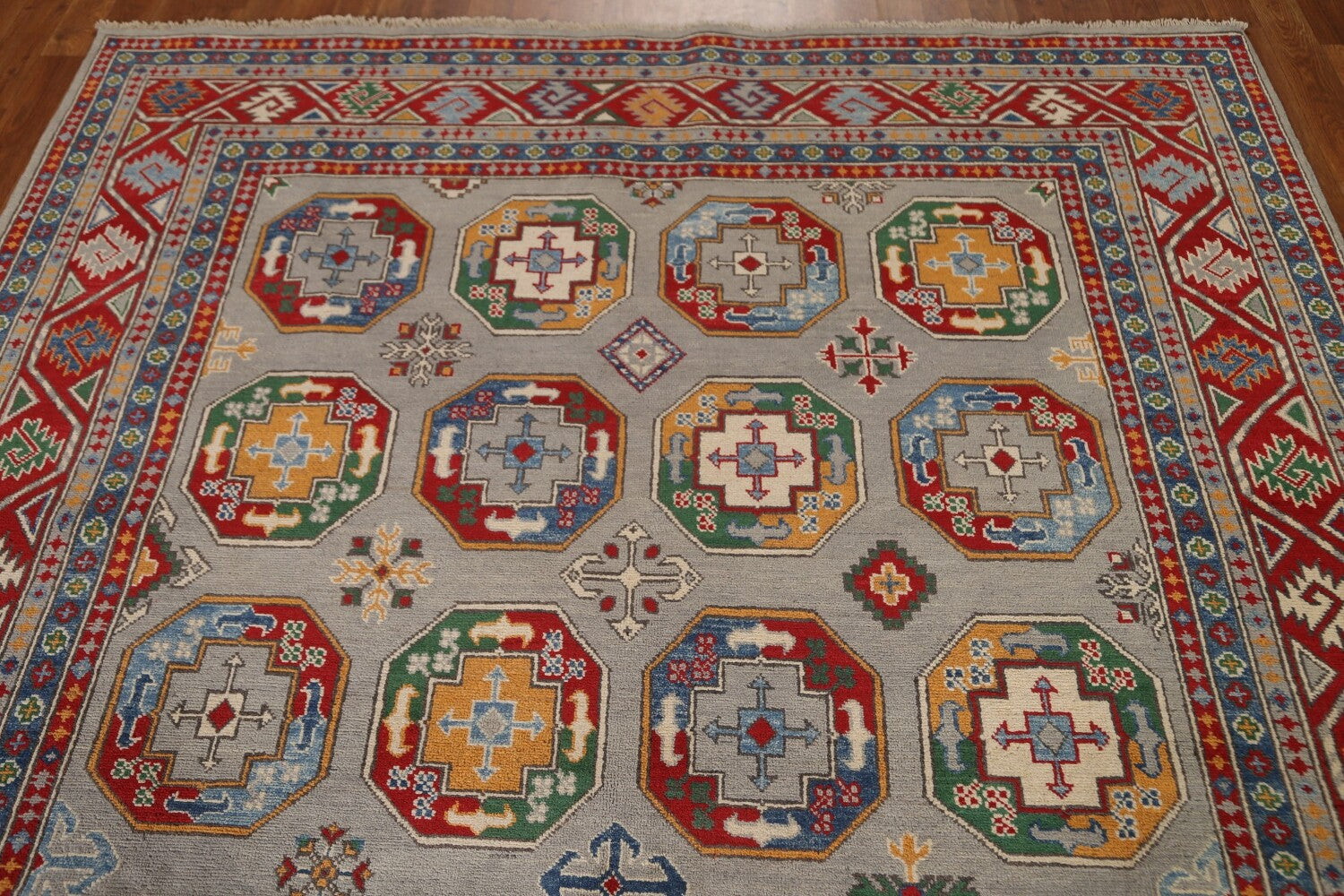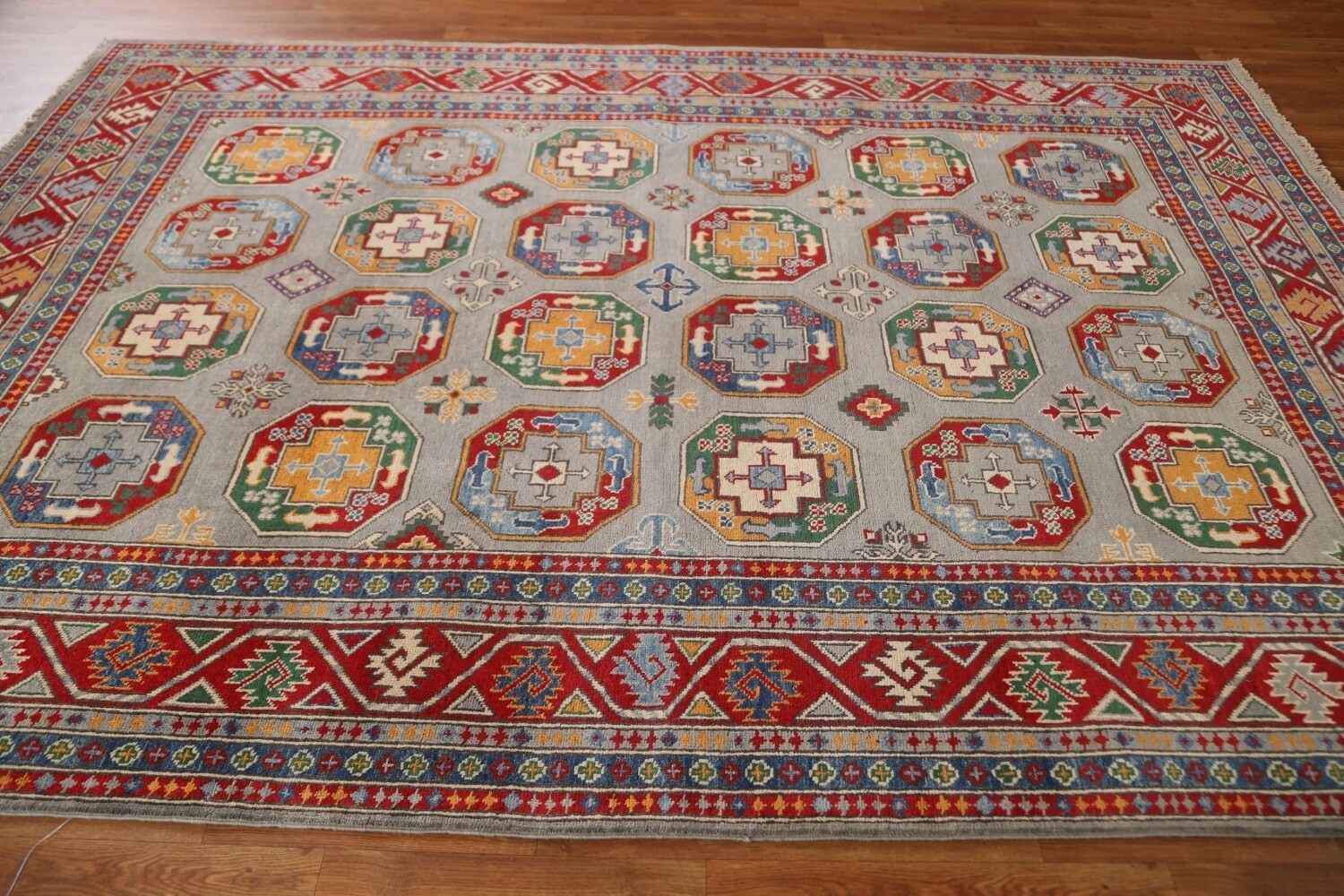A Beautiful Genuine Pakistan Kazak rug is Hand Knotted by skillful weavers in Pakistan with 100% Wool Material. This rug is in condition. dimensions are 9' 8'' X 6' 9'' in foot and 295 X 206 in centimeter. the primary color is Greys & Charcoal.