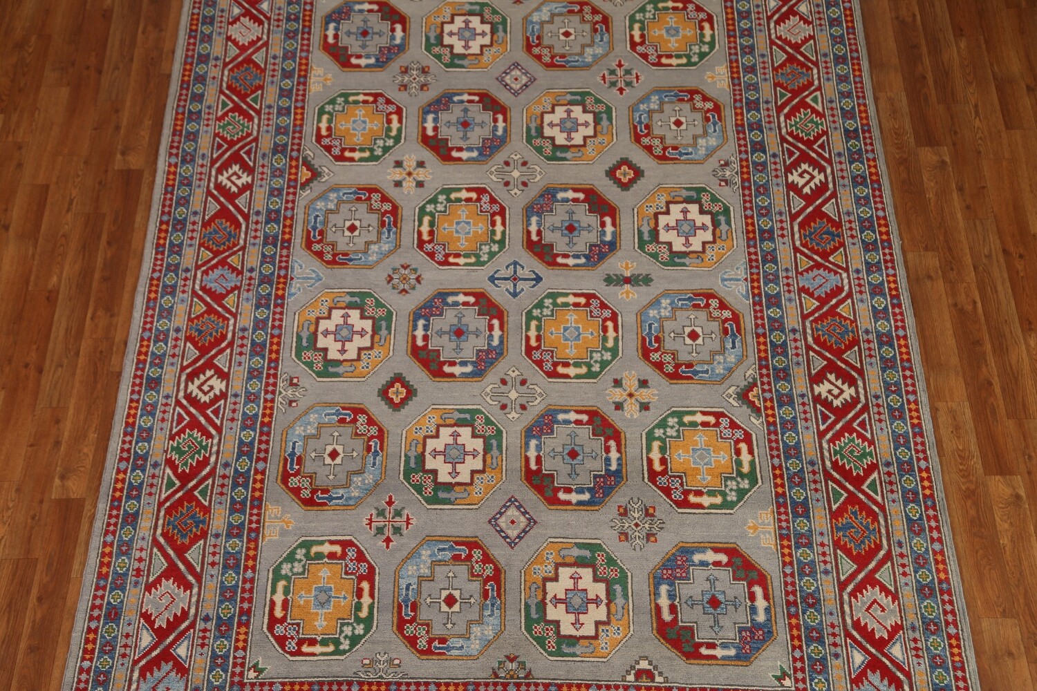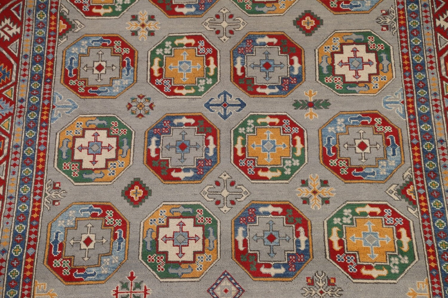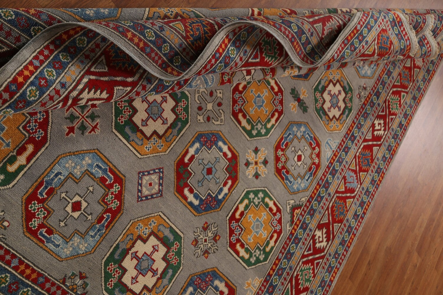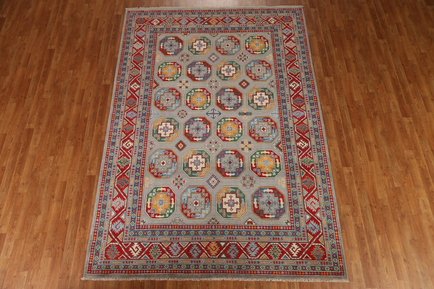 A Beautiful Genuine Pakistan Kazak rug is Hand Knotted by skillful weavers in Pakistan with 100% Wool Material. This rug is in condition. dimensions are 9' 8'' X 6' 9'' in foot and 295 X 206 in centimeter. the primary color is Greys & Charcoal.