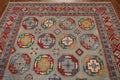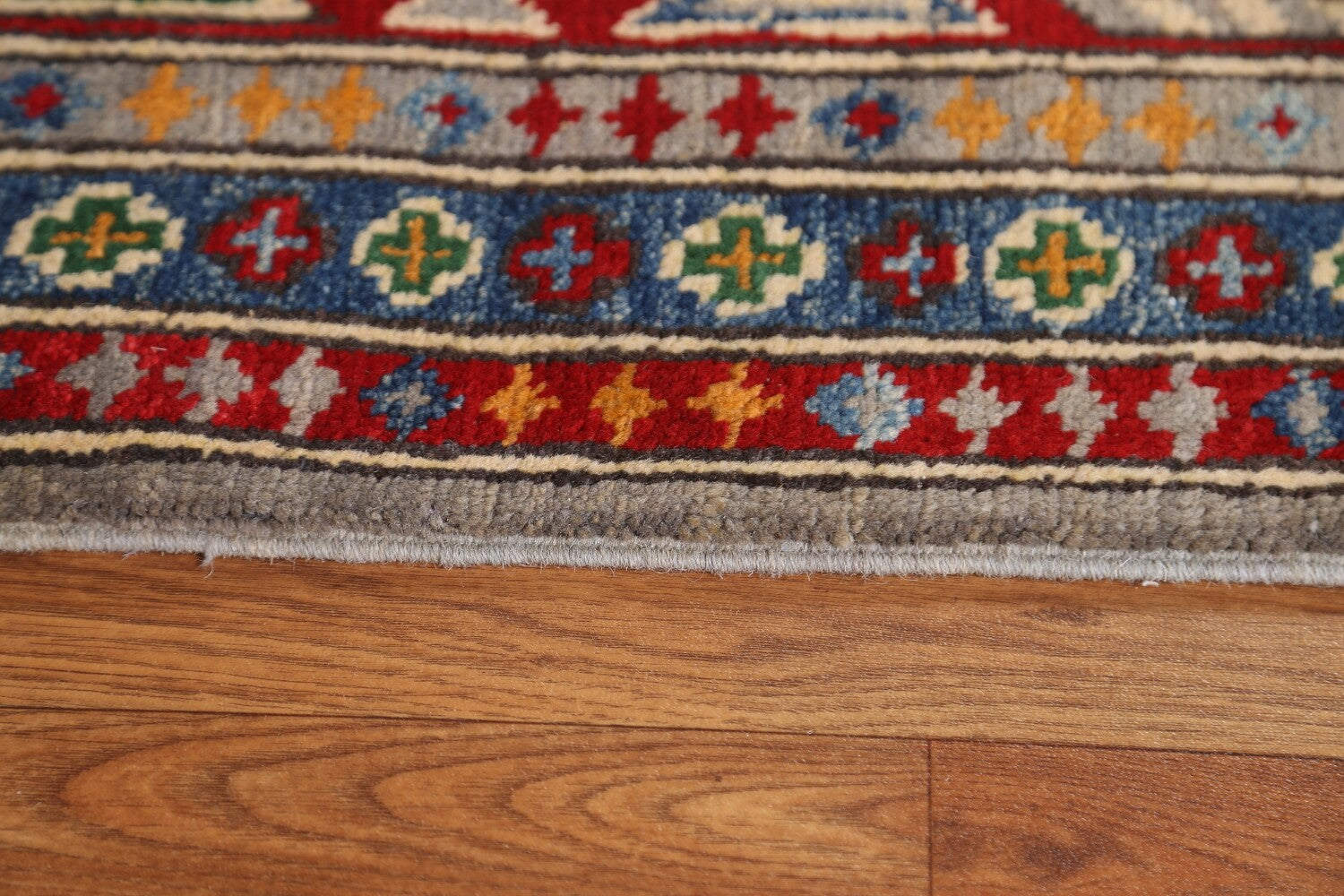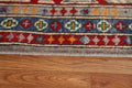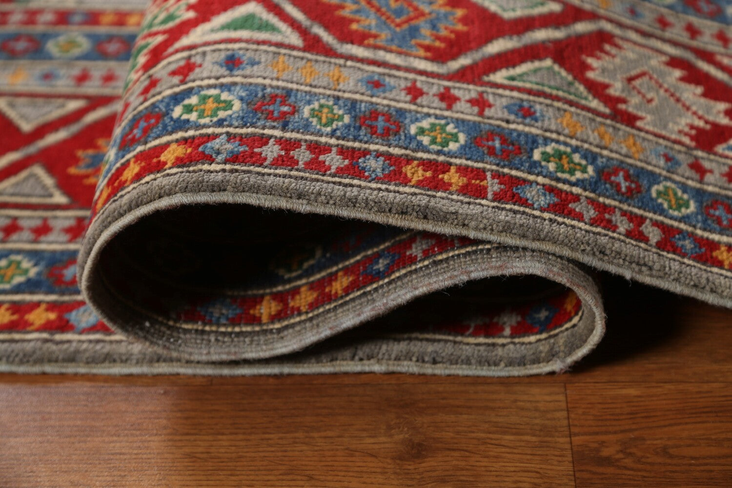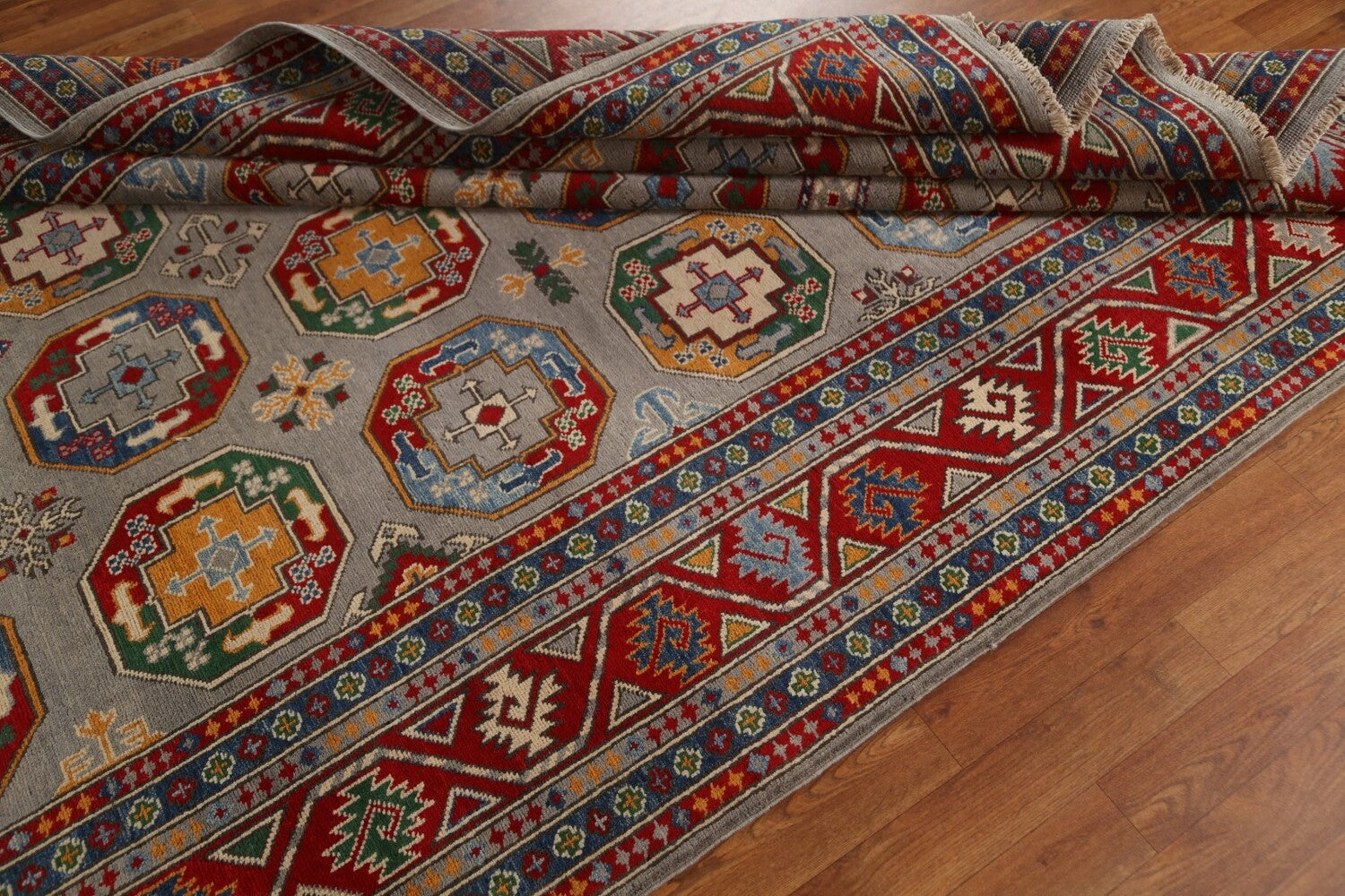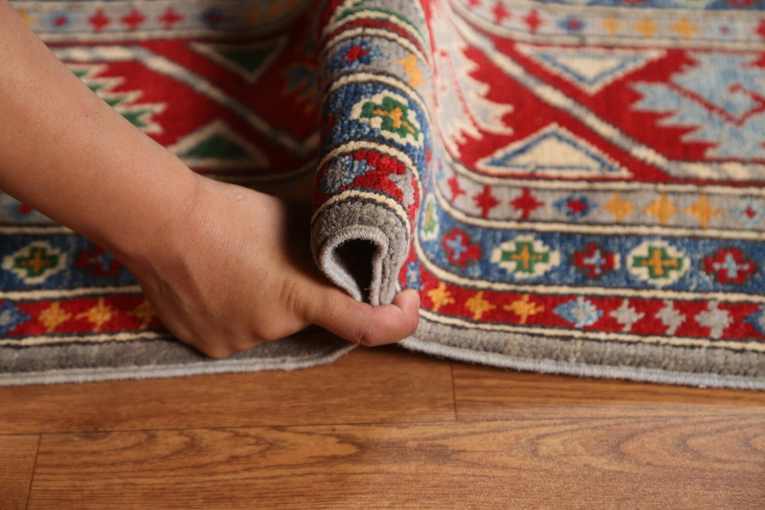 A Beautiful Genuine Pakistan Kazak rug is Hand Knotted by skillful weavers in Pakistan with 100% Wool Material. This rug is in condition. dimensions are 9' 8'' X 6' 9'' in foot and 295 X 206 in centimeter. the primary color is Greys & Charcoal.