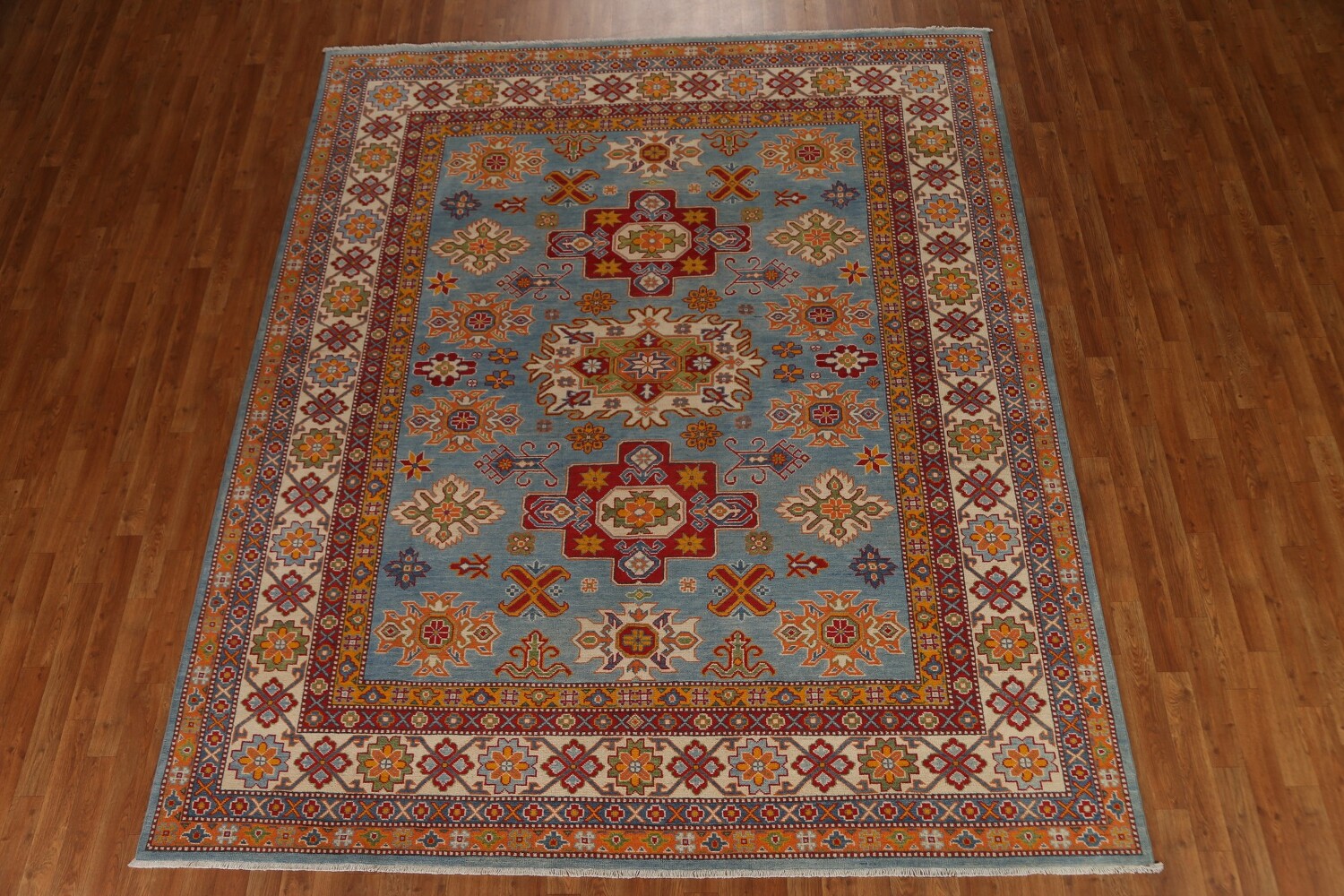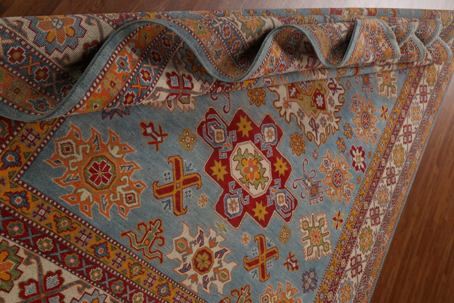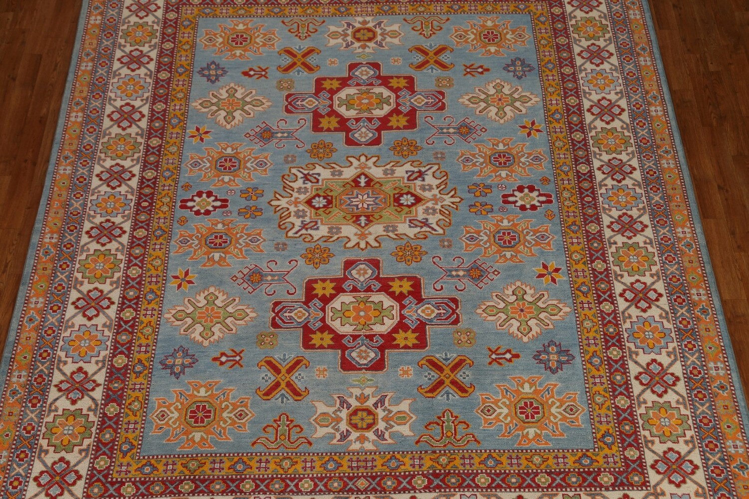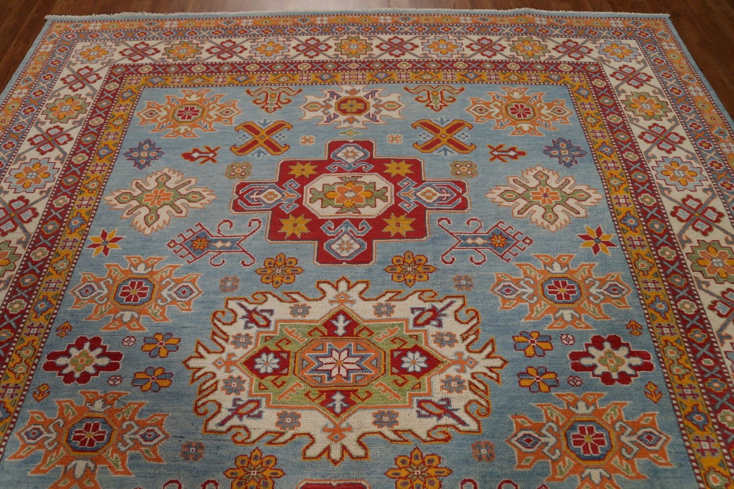 A Beautiful Genuine Pakistan Kazak rug is Hand Knotted by skillful weavers in Pakistan with 100% Wool Material. This rug is in New, First Quality condition. dimensions are 9' 9'' X 8' 3'' in foot and 297 X 251 in centimeter. the primary color is Navy Blue & Blues.