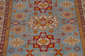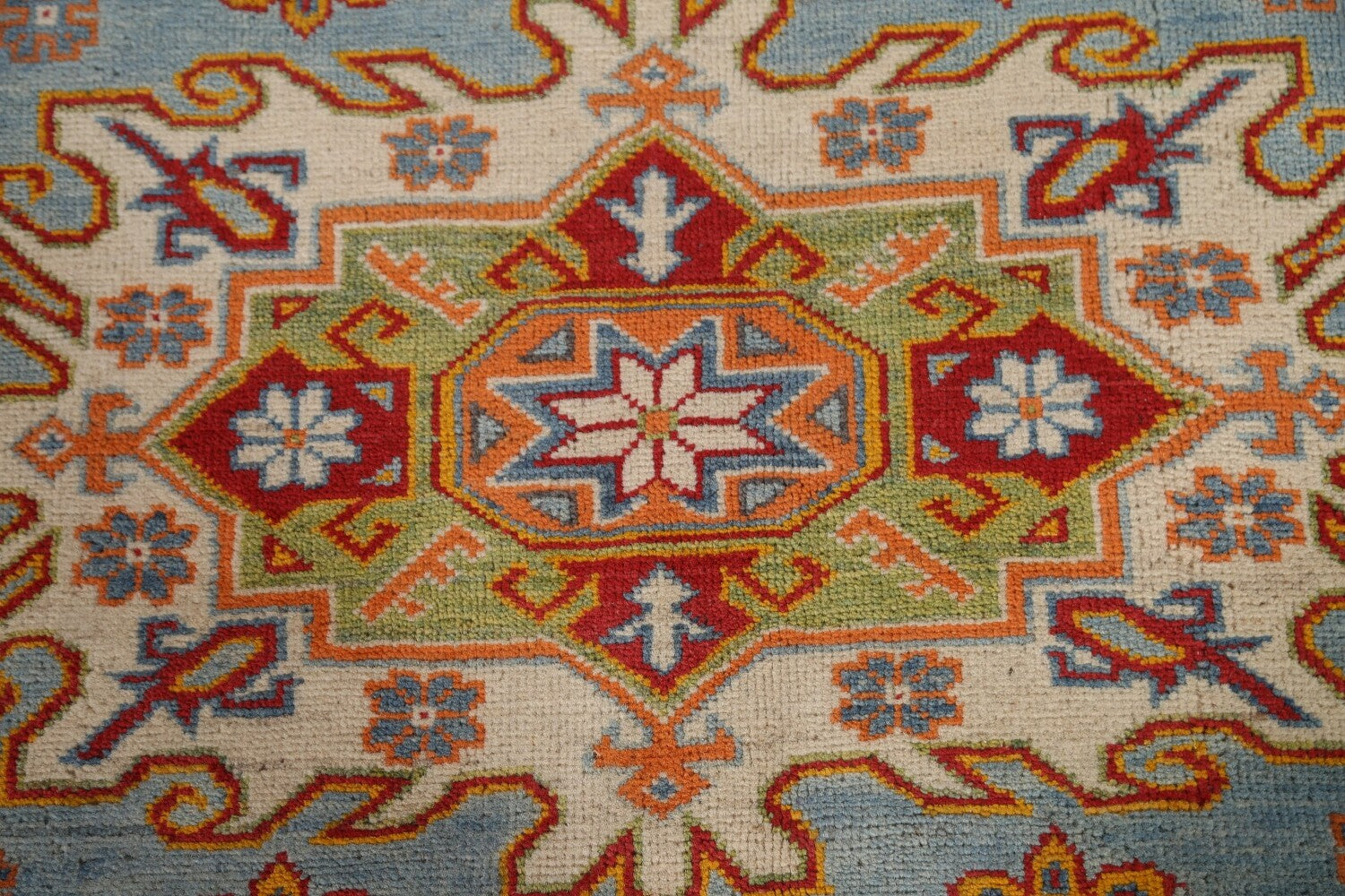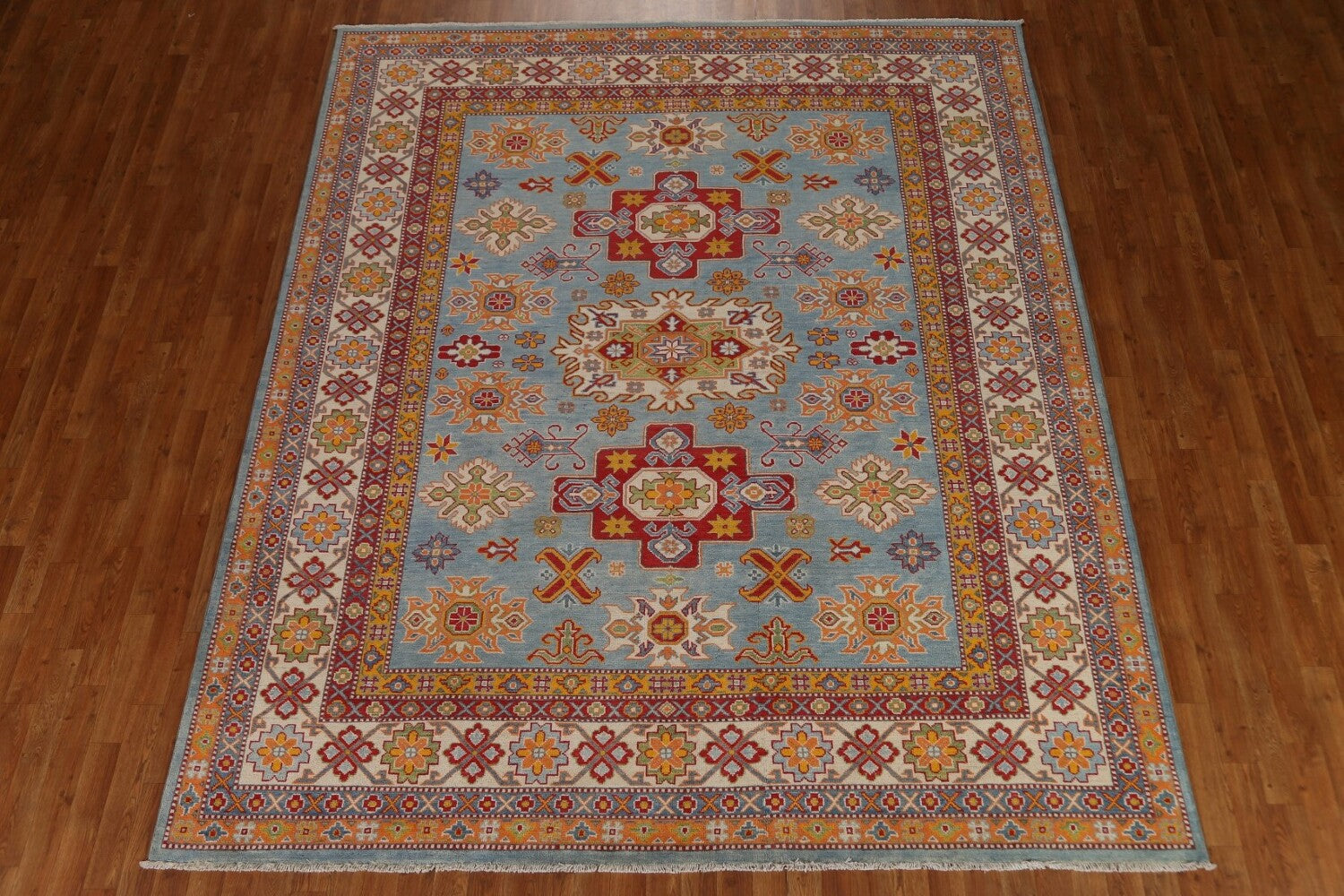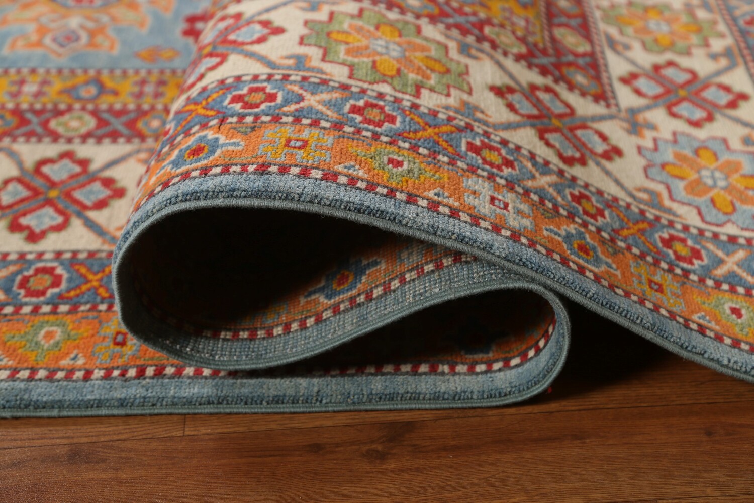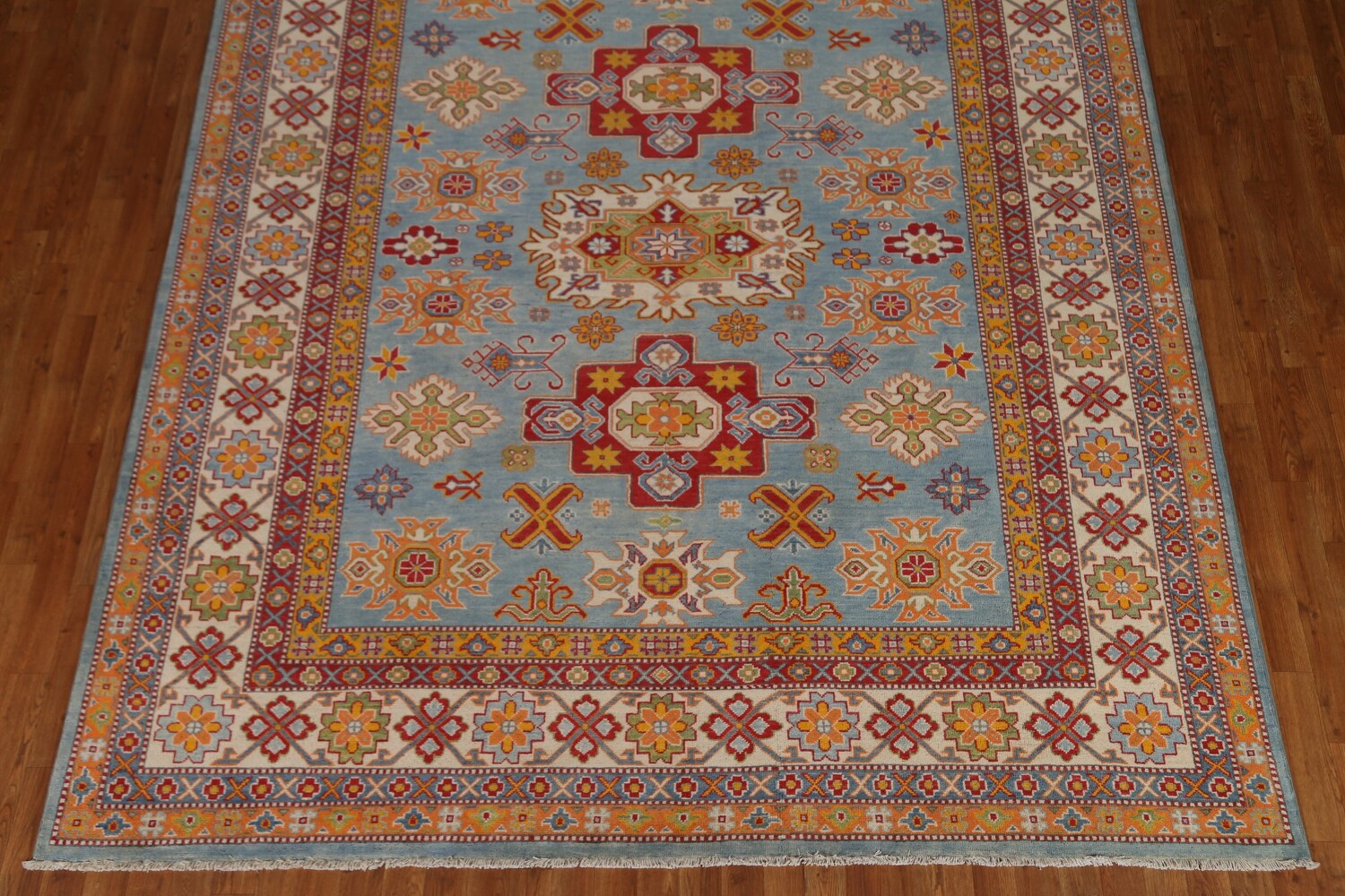 A Beautiful Genuine Pakistan Kazak rug is Hand Knotted by skillful weavers in Pakistan with 100% Wool Material. This rug is in New, First Quality condition. dimensions are 9' 9'' X 8' 3'' in foot and 297 X 251 in centimeter. the primary color is Navy Blue & Blues.