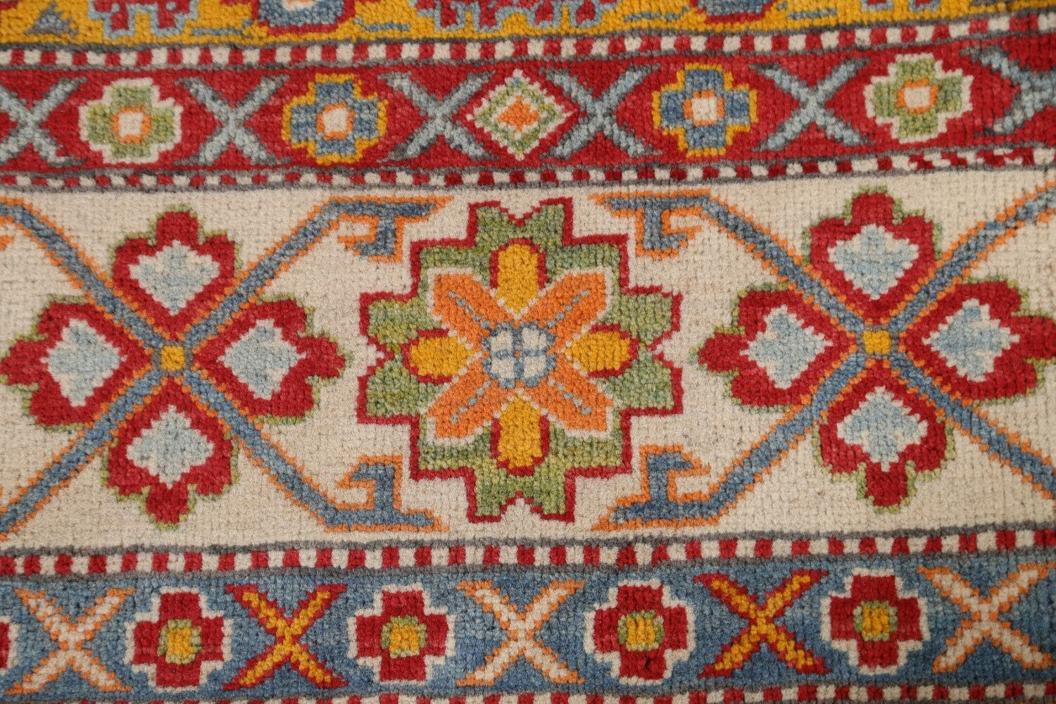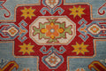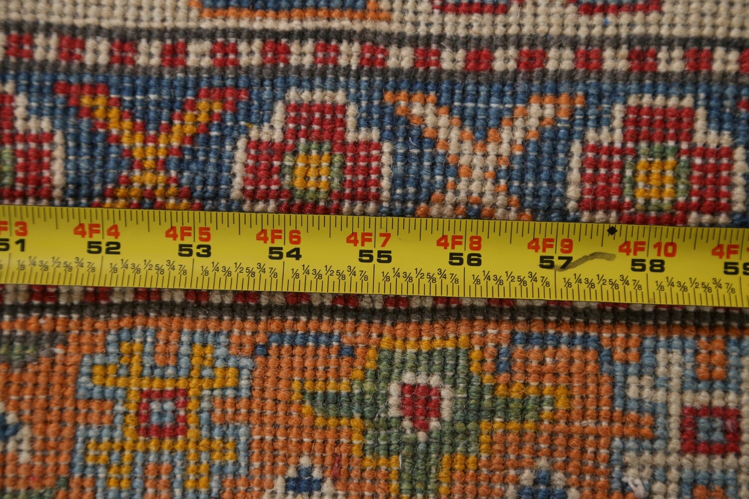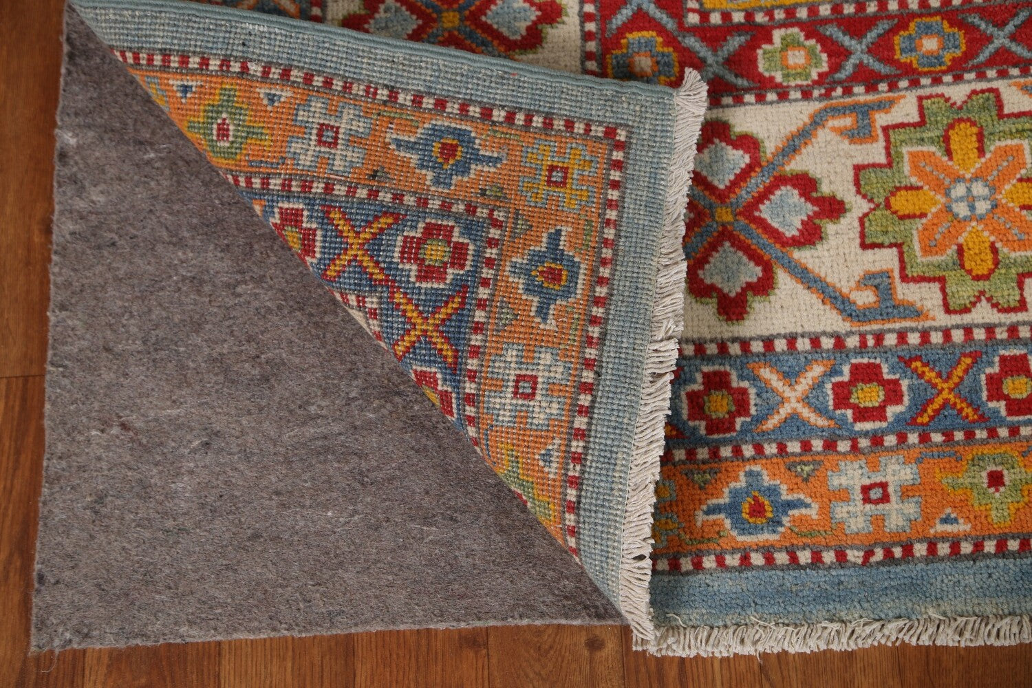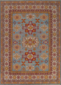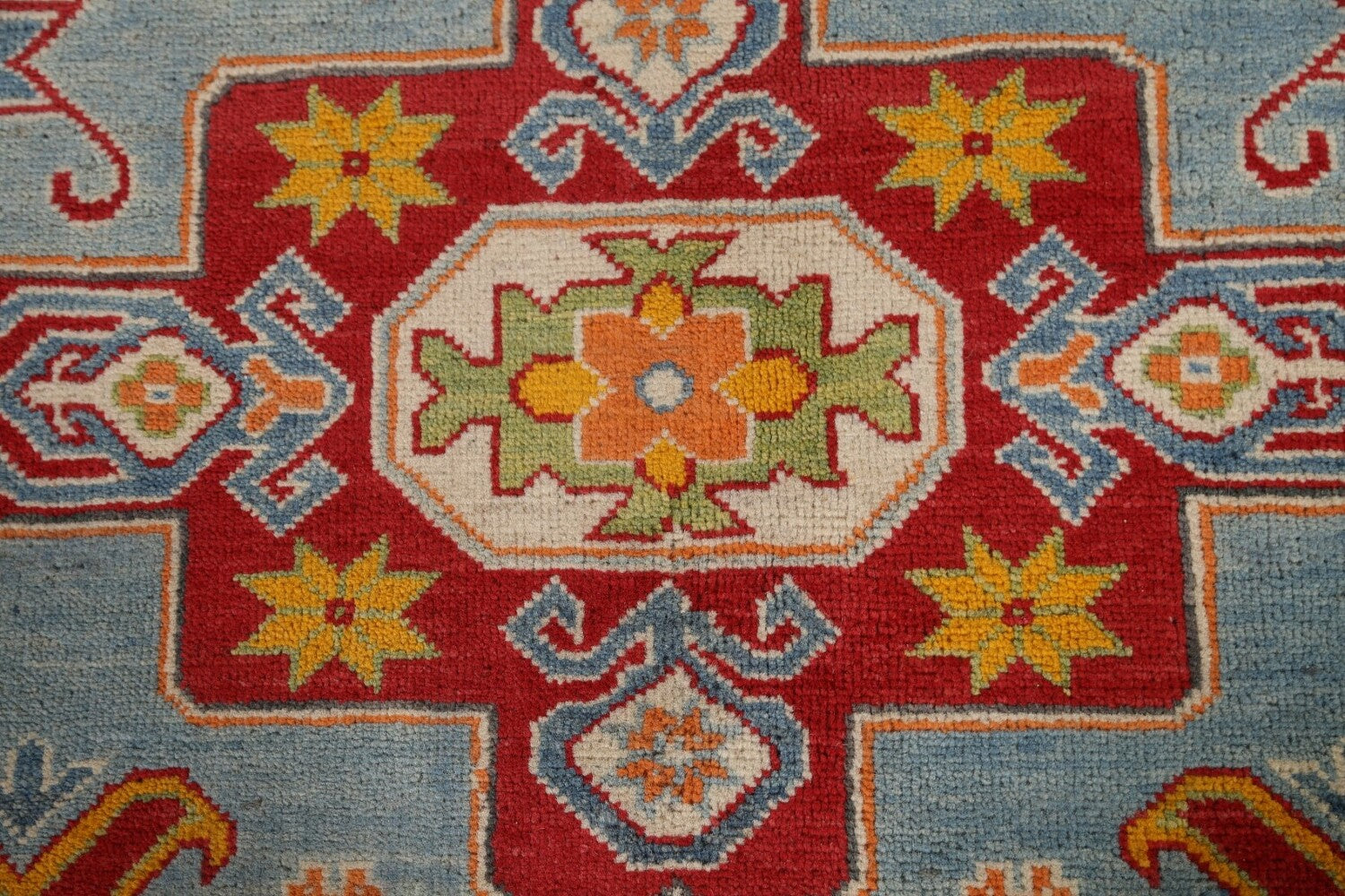 A Beautiful Genuine Pakistan Kazak rug is Hand Knotted by skillful weavers in Pakistan with 100% Wool Material. This rug is in New, First Quality condition. dimensions are 9' 9'' X 8' 3'' in foot and 297 X 251 in centimeter. the primary color is Navy Blue & Blues.