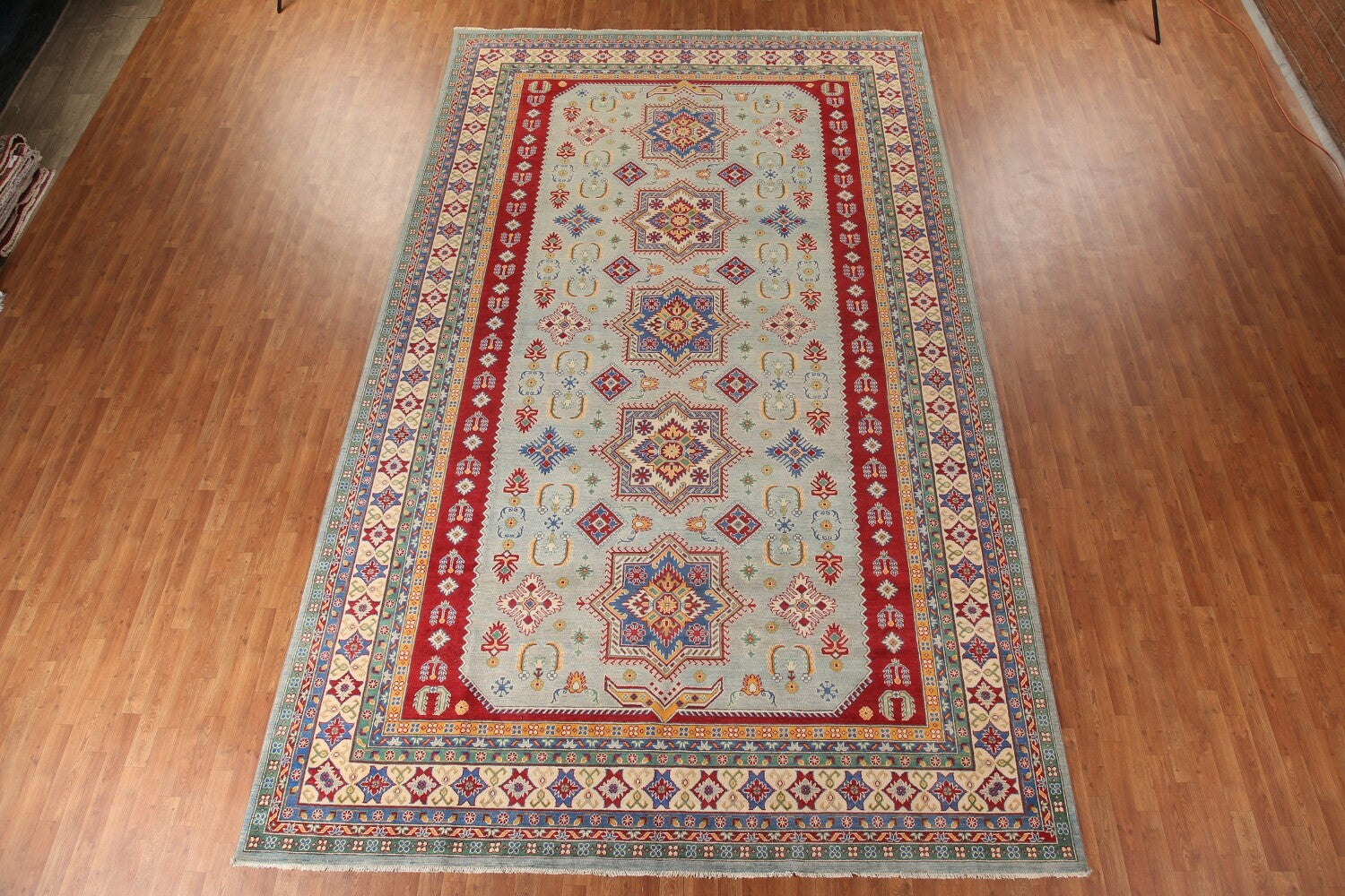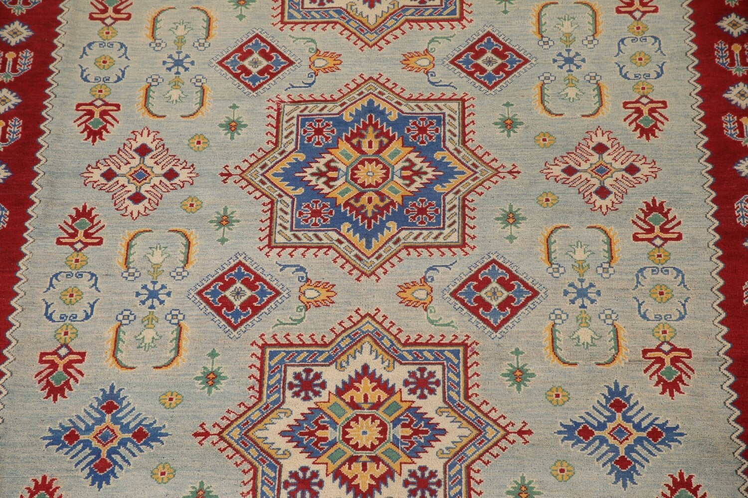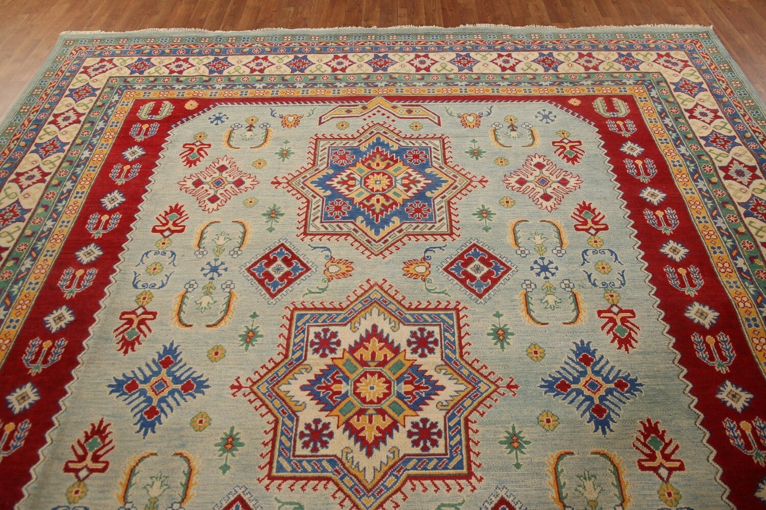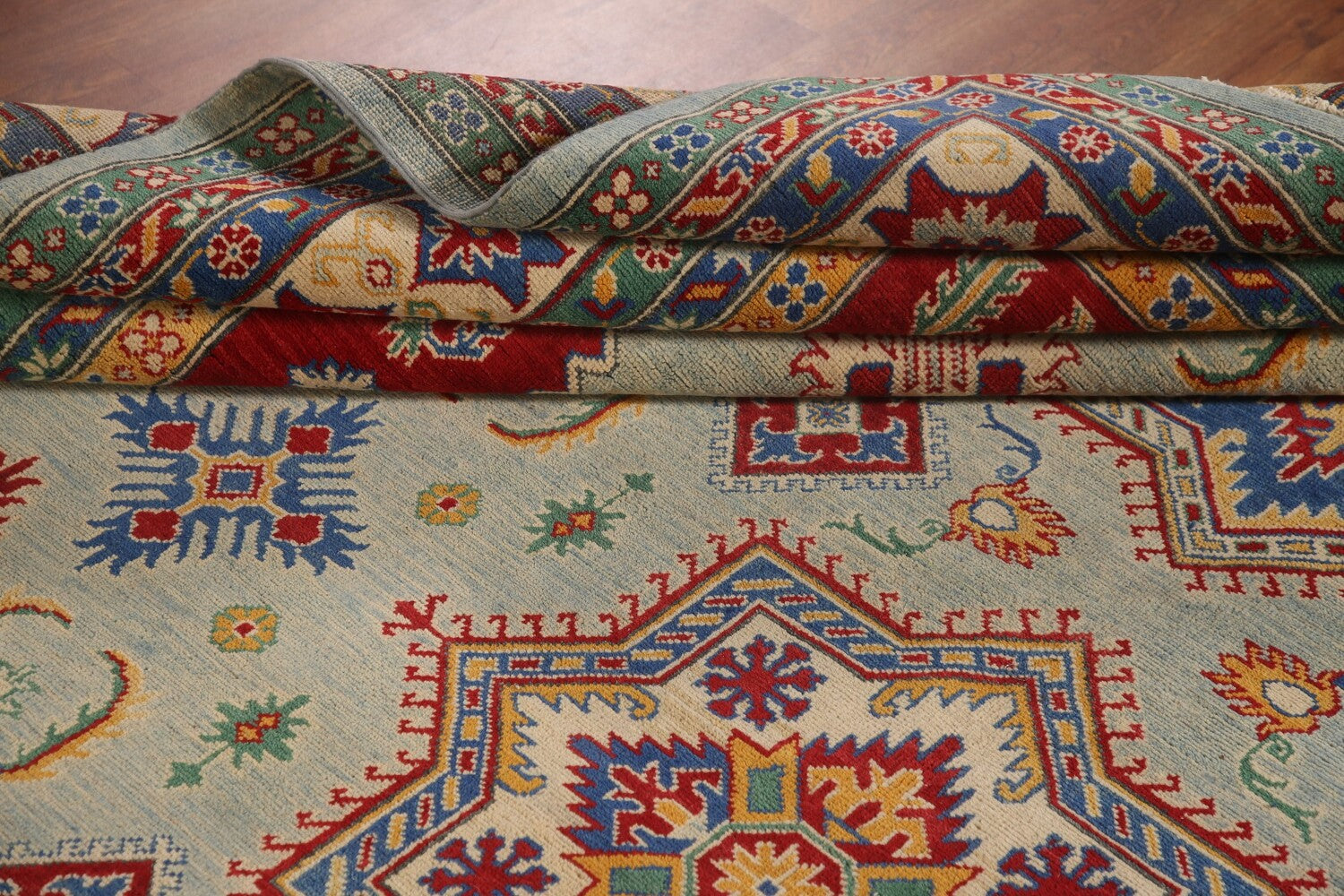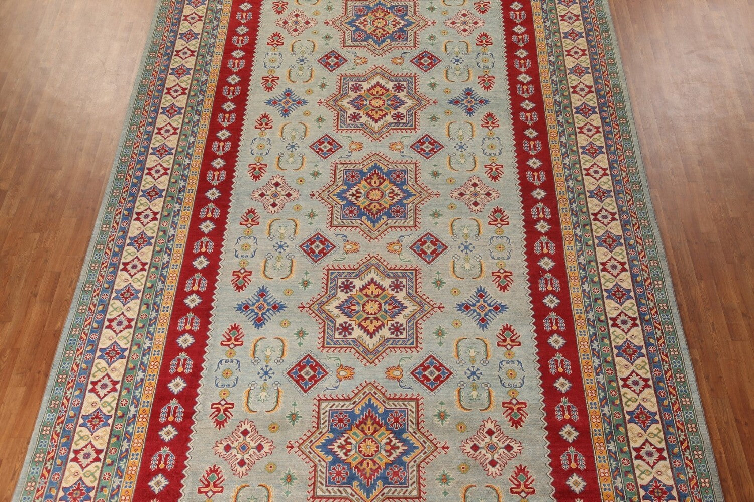 A Beautiful Genuine Pakistan Kazak rug is Hand Knotted by skillful weavers in Pakistan with 100% Wool Material. This rug is in New, First Quality condition. dimensions are 16' 2'' X 9' 9'' in foot and 493 X 297 in centimeter. the primary color is Navy Blue & Blues.