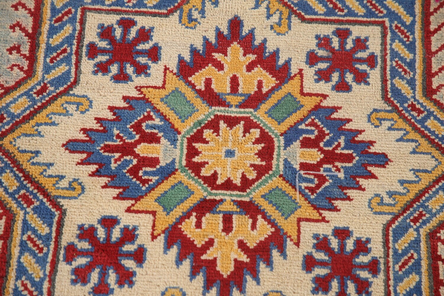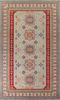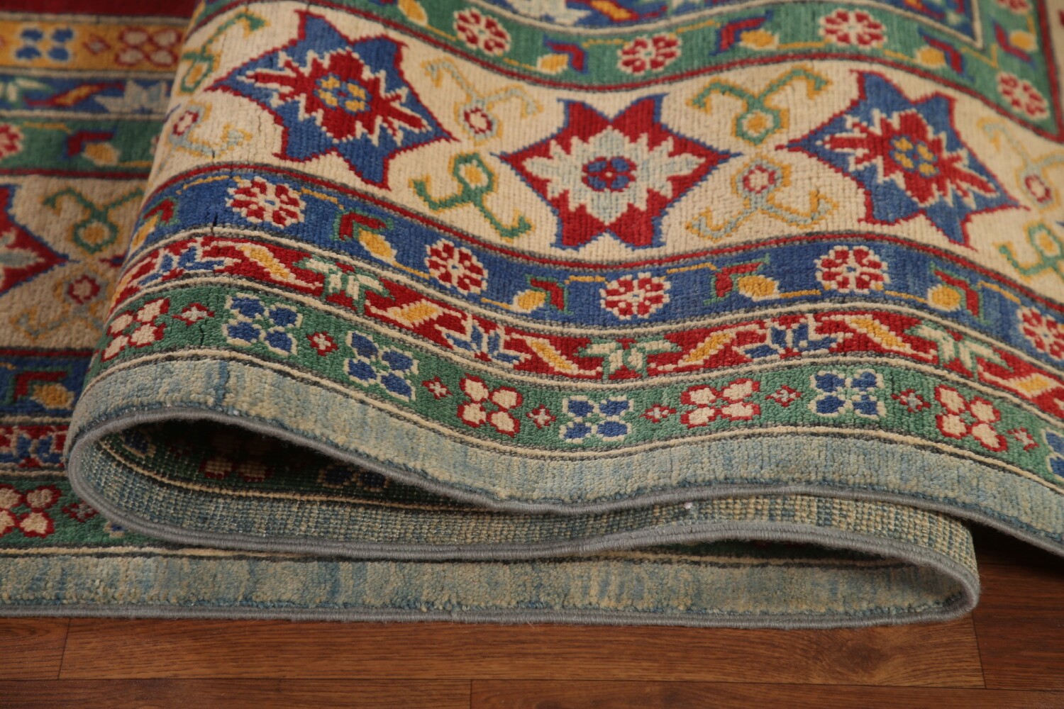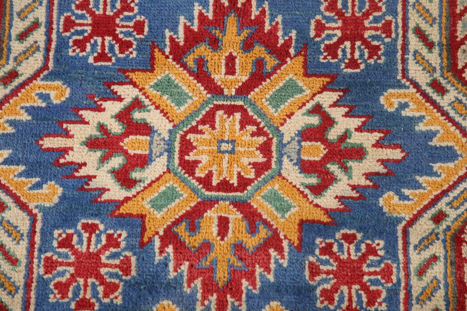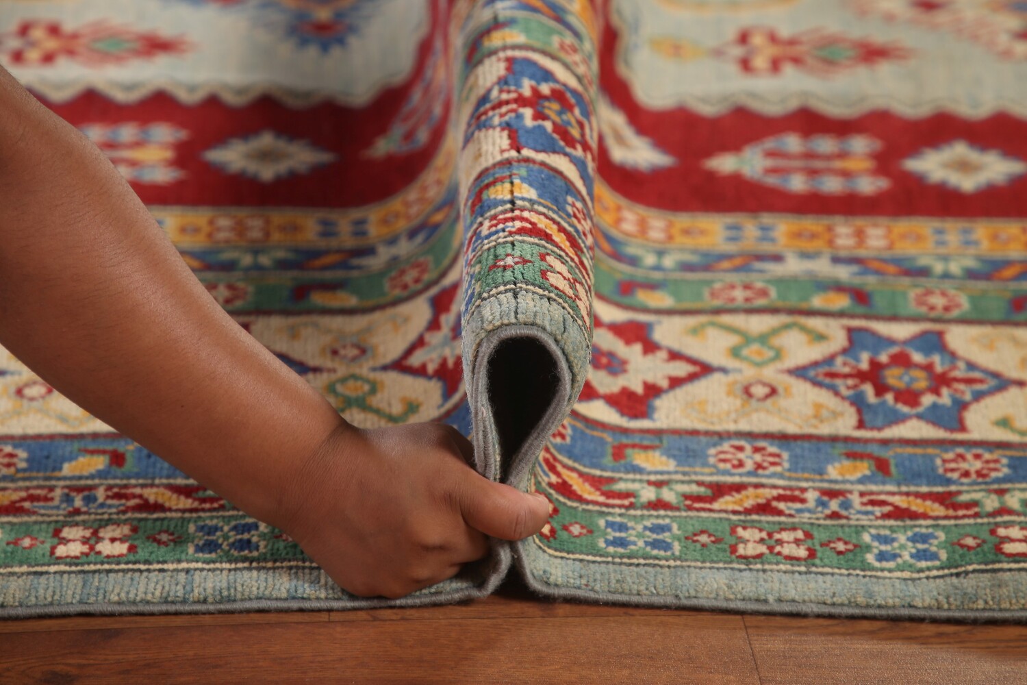 A Beautiful Genuine Pakistan Kazak rug is Hand Knotted by skillful weavers in Pakistan with 100% Wool Material. This rug is in New, First Quality condition. dimensions are 16' 2'' X 9' 9'' in foot and 493 X 297 in centimeter. the primary color is Navy Blue & Blues.