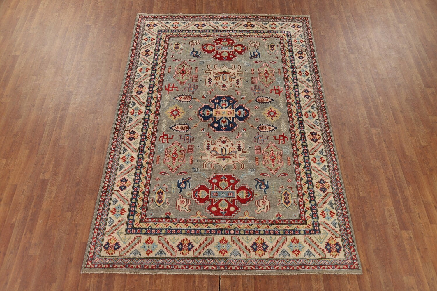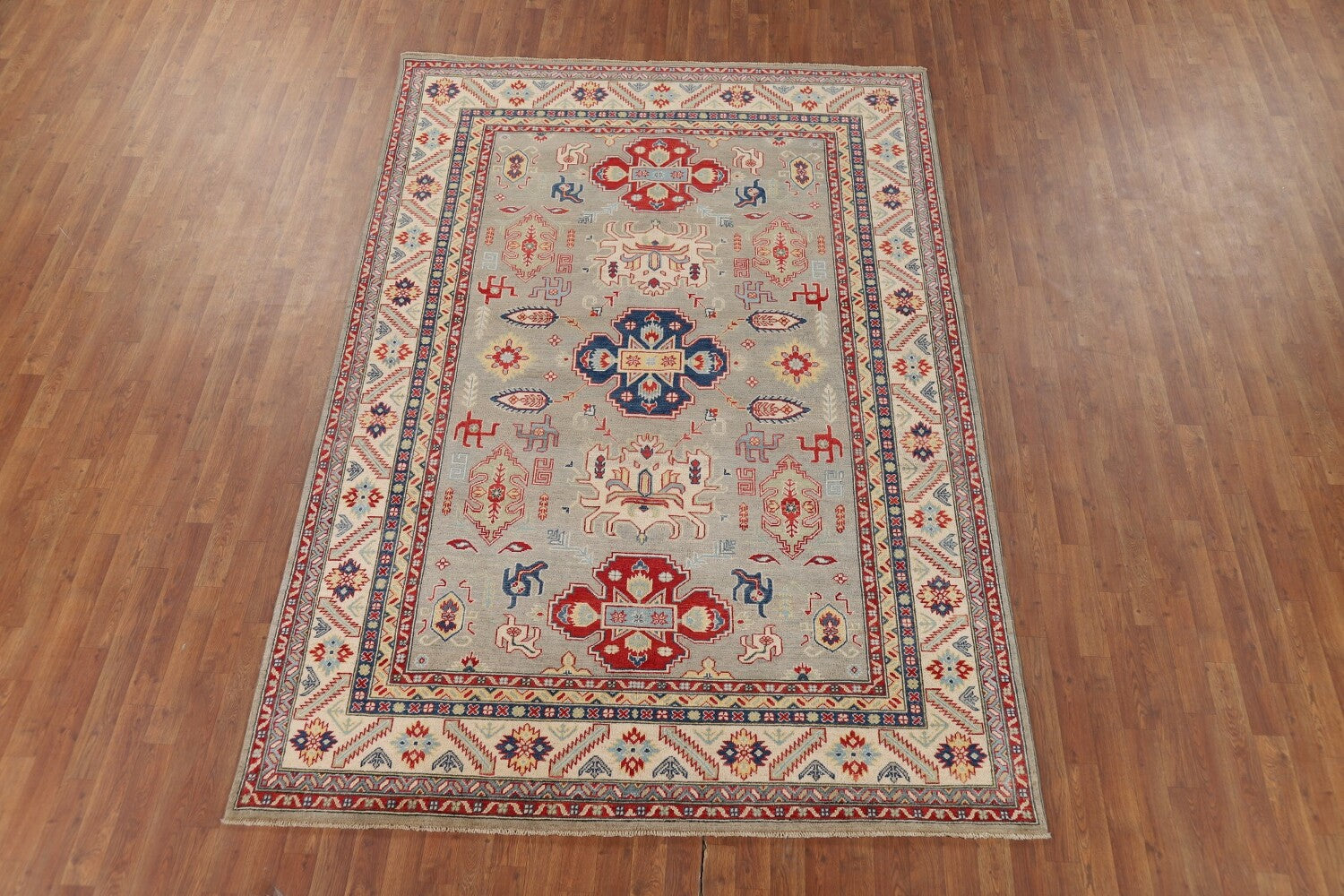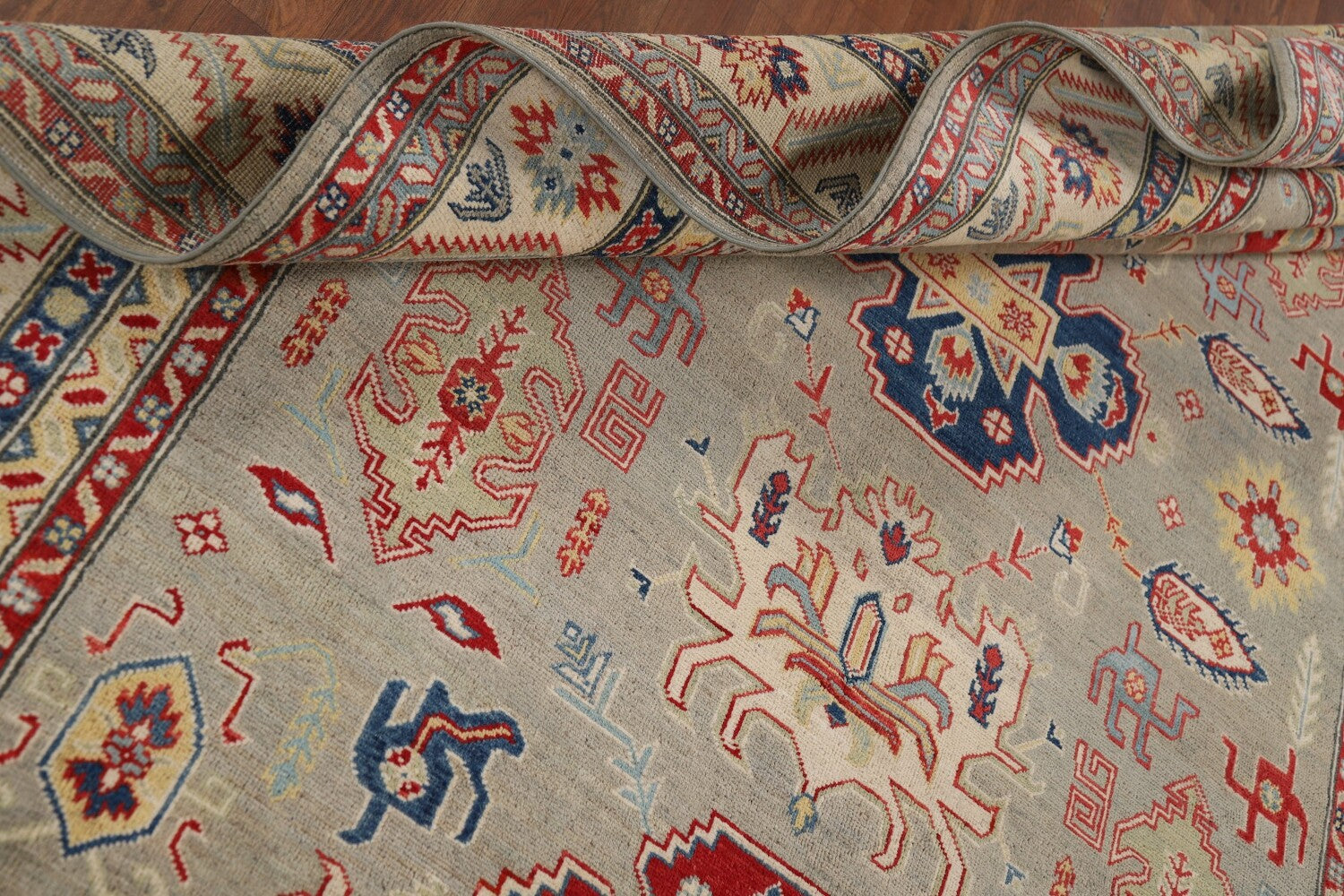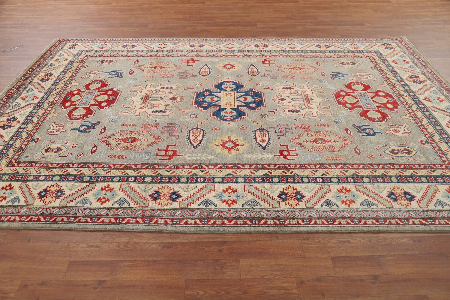 A Beautiful Genuine Pakistan Kazak rug is Hand Knotted by skillful weavers in Pakistan with 100% Wool Material. This rug is in New, First Quality condition. dimensions are 9' 9'' X 6' 7'' in foot and 297 X 201 in centimeter. the primary color is Greys & Charcoal.