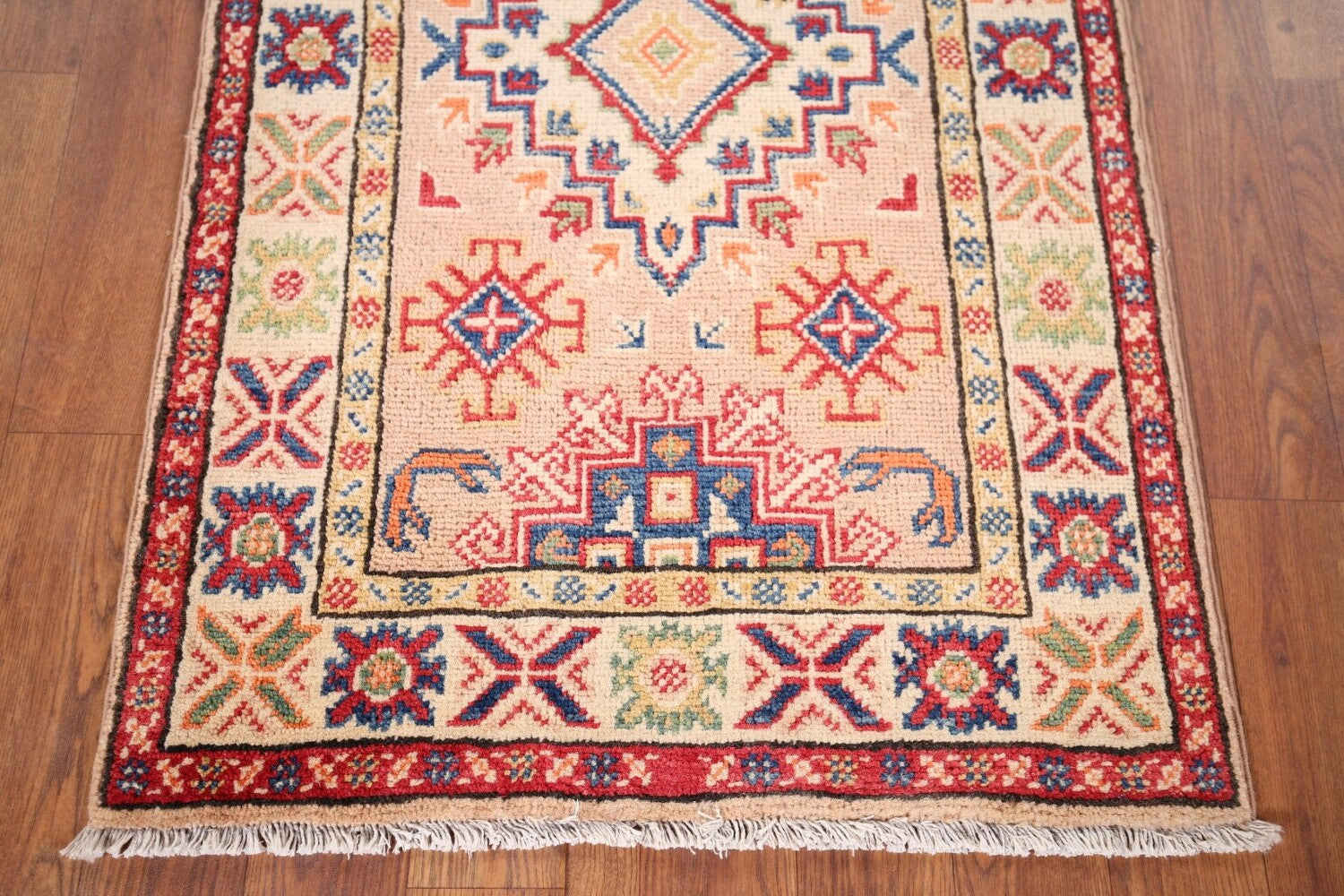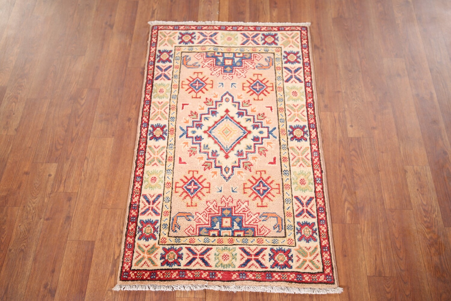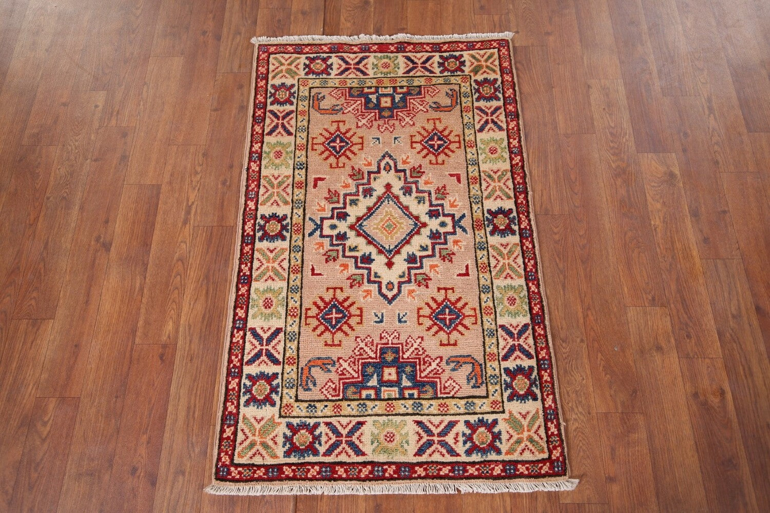 A Beautiful Genuine Pakistan Kazak rug is Hand Knotted by skillful weavers in Pakistan with 100% Wool Material. This rug is in New, First Quality condition. dimensions are 3' 2'' X 2' 0'' in foot and 97 X 61 in centimeter. the primary color is Peach.