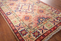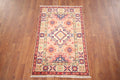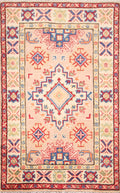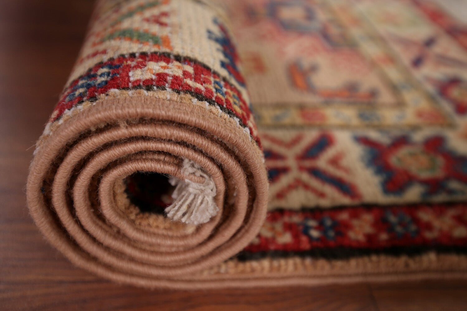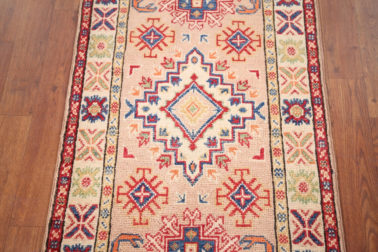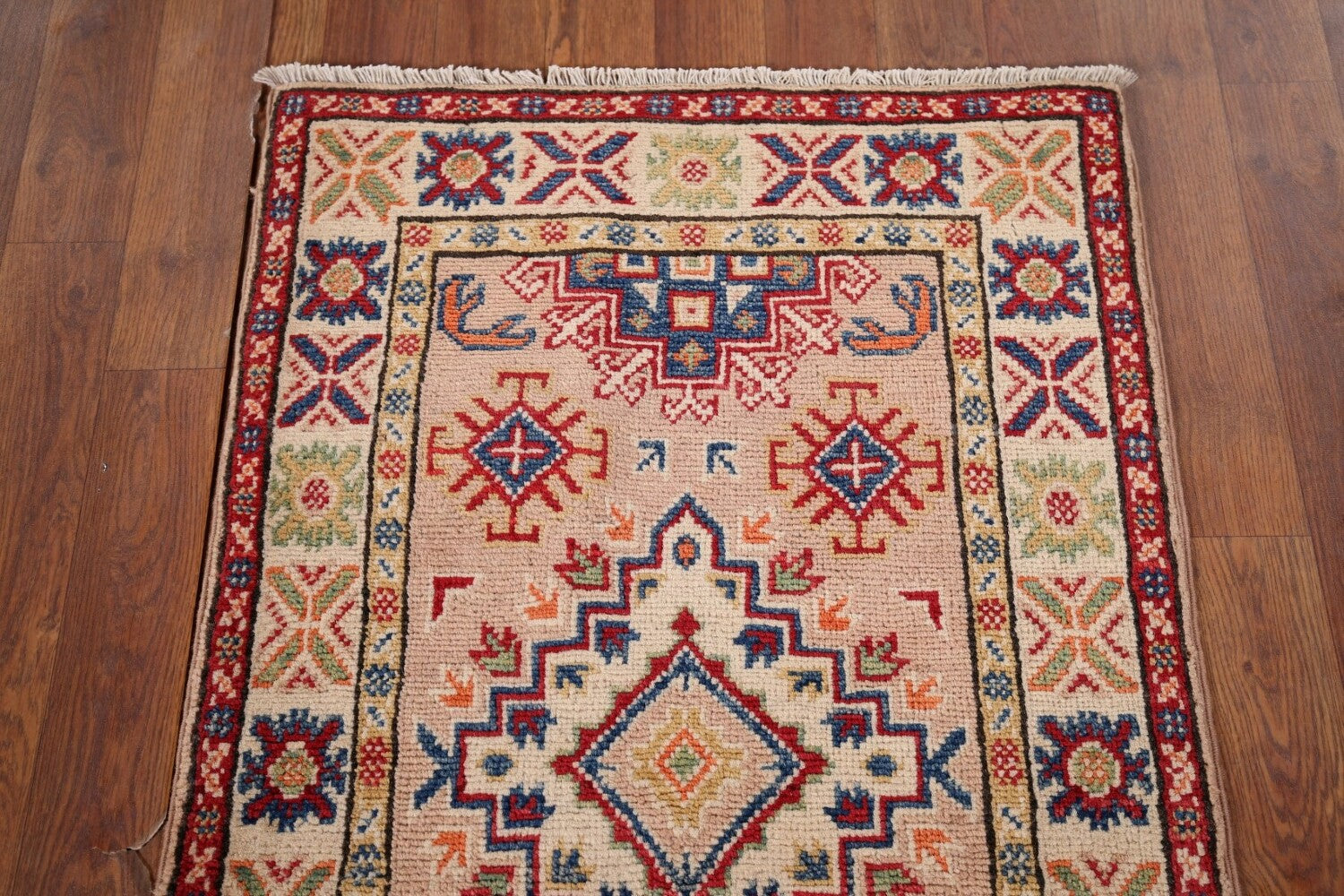 A Beautiful Genuine Pakistan Kazak rug is Hand Knotted by skillful weavers in Pakistan with 100% Wool Material. This rug is in New, First Quality condition. dimensions are 3' 2'' X 2' 0'' in foot and 97 X 61 in centimeter. the primary color is Peach.
