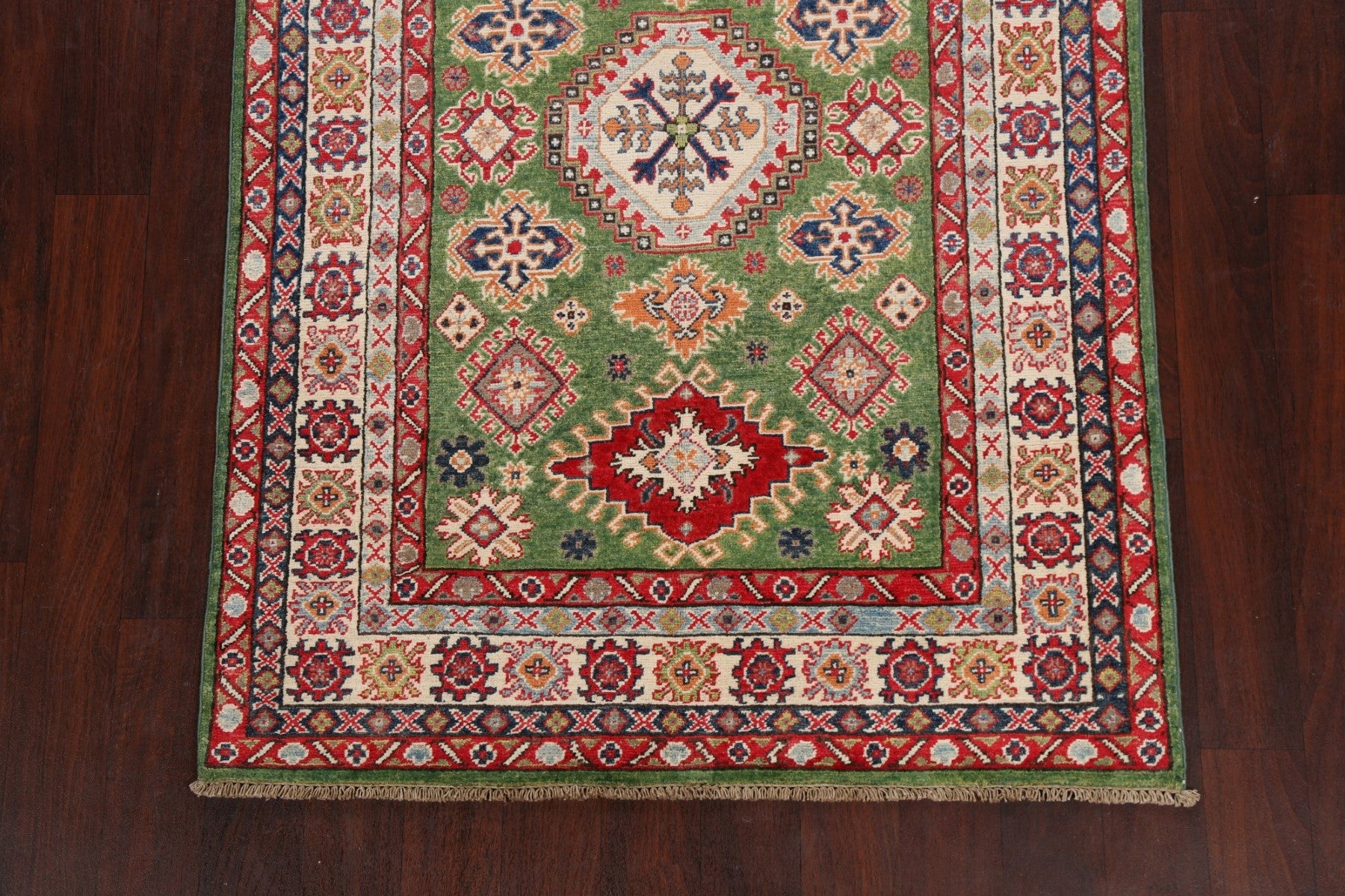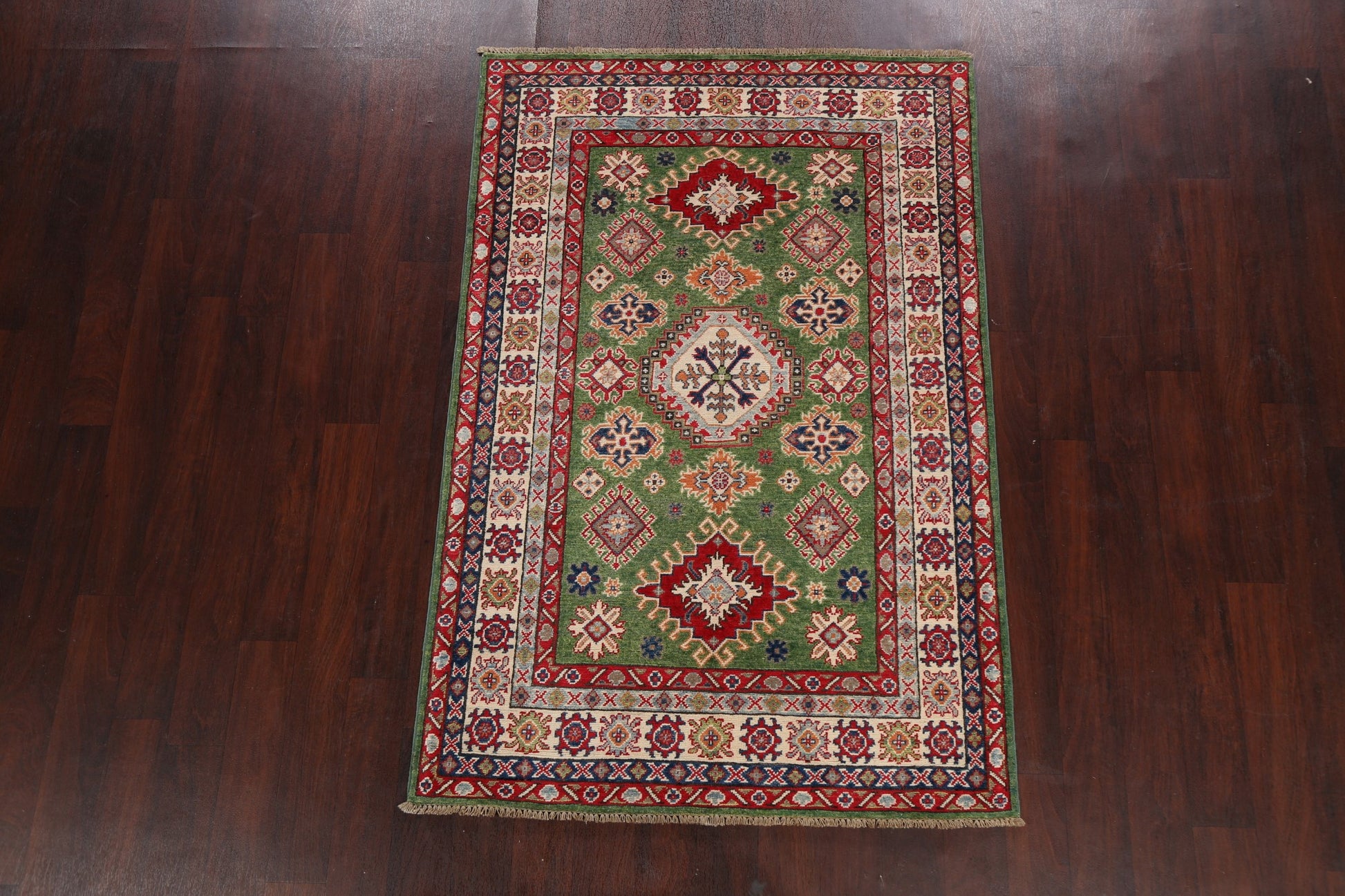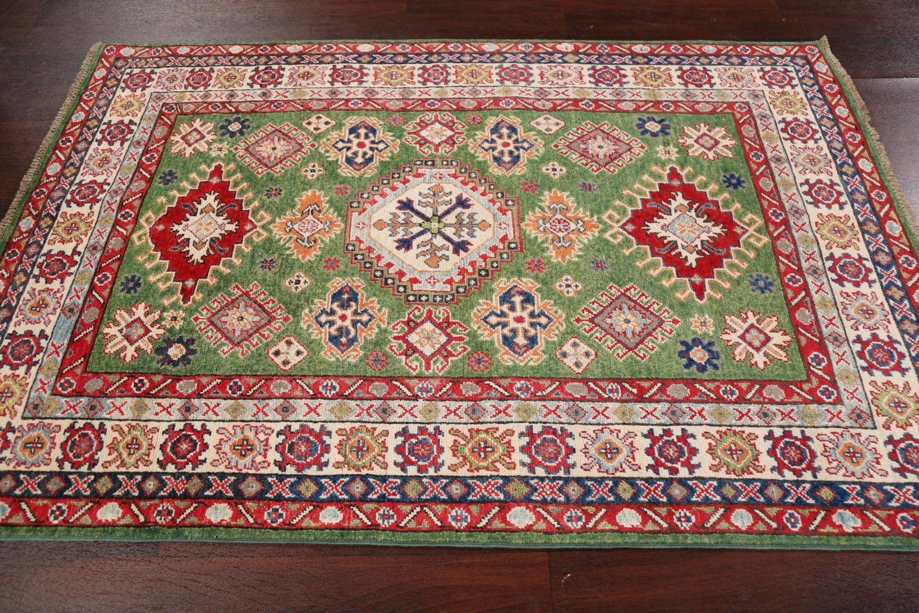 A Beautiful Genuine Pakistan Kazak rug is Hand Knotted by skillful weavers in Pakistan with 100% Wool Material. This rug is in New, First Quality condition. dimensions are 6' 7'' X 4' 0'' in foot and 201 X 122 in centimeter. the primary color is Green.
