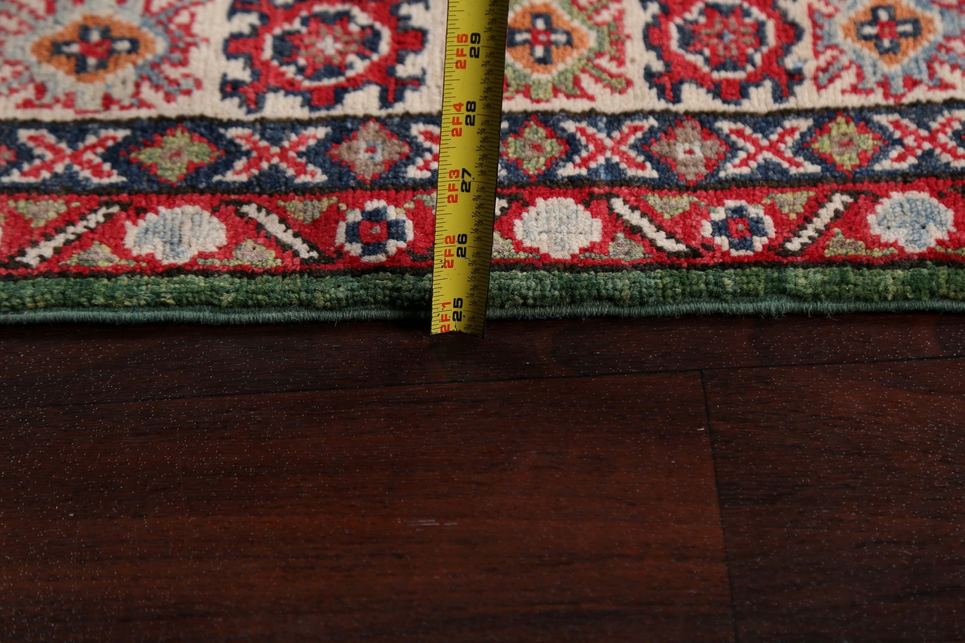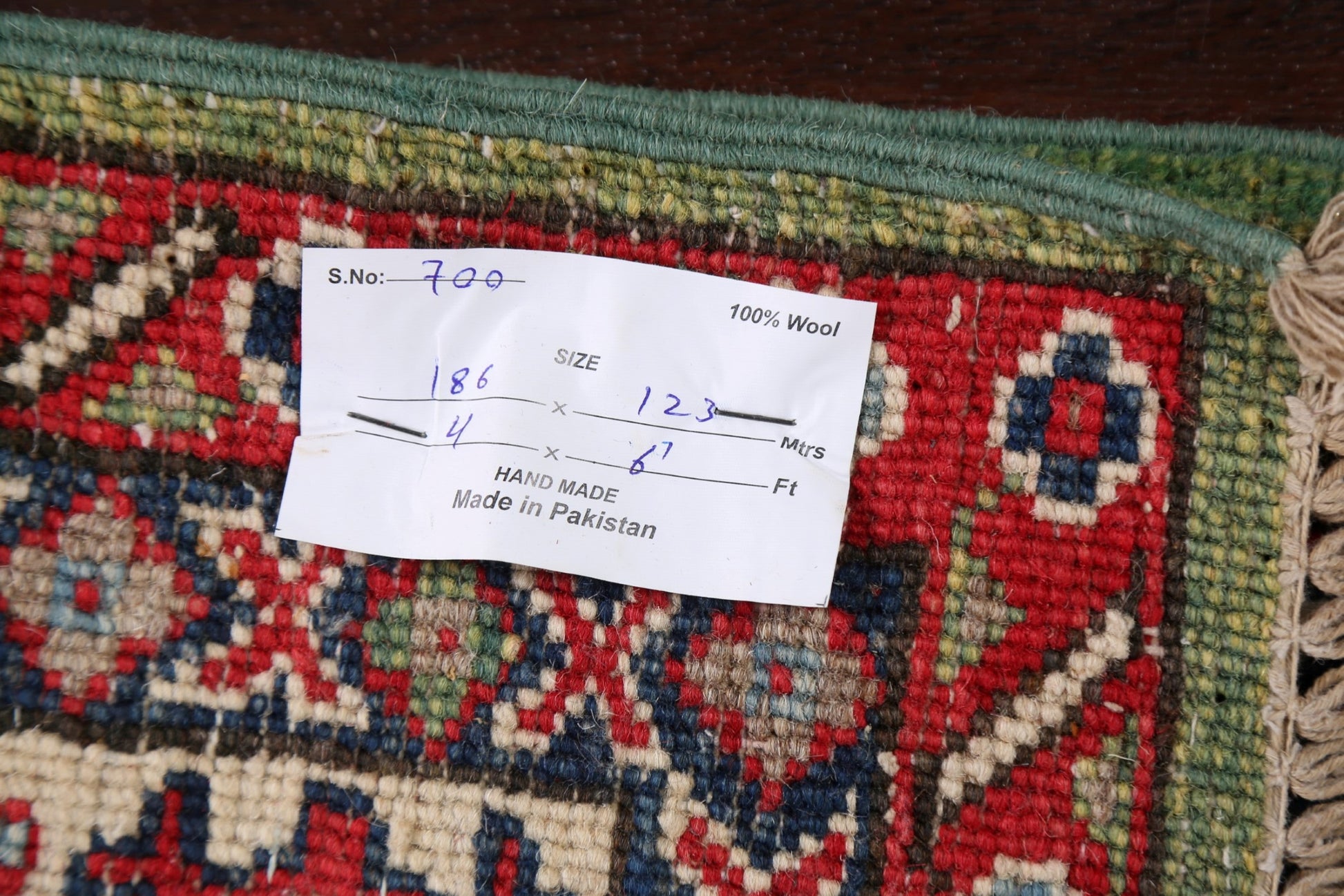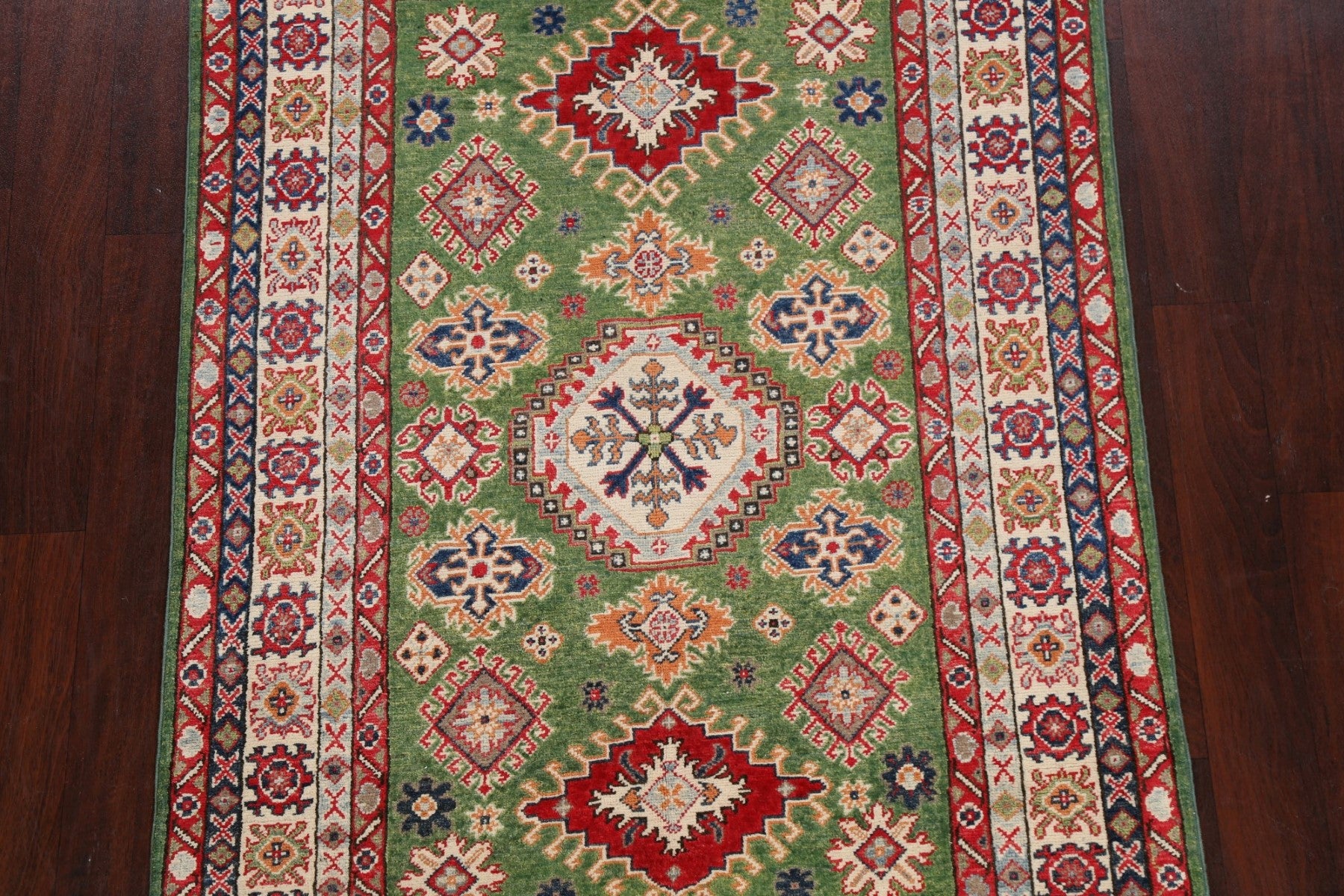 A Beautiful Genuine Pakistan Kazak rug is Hand Knotted by skillful weavers in Pakistan with 100% Wool Material. This rug is in New, First Quality condition. dimensions are 6' 7'' X 4' 0'' in foot and 201 X 122 in centimeter. the primary color is Green.