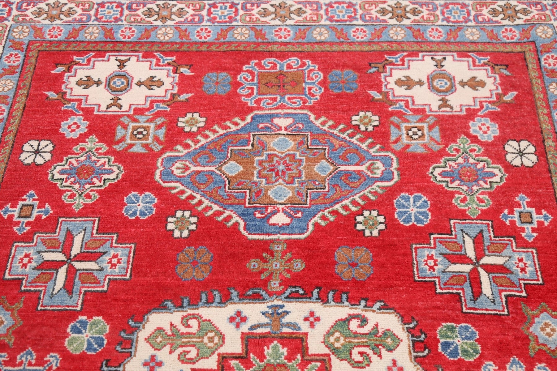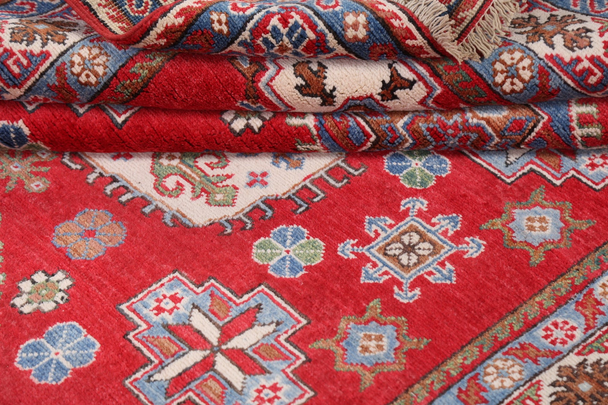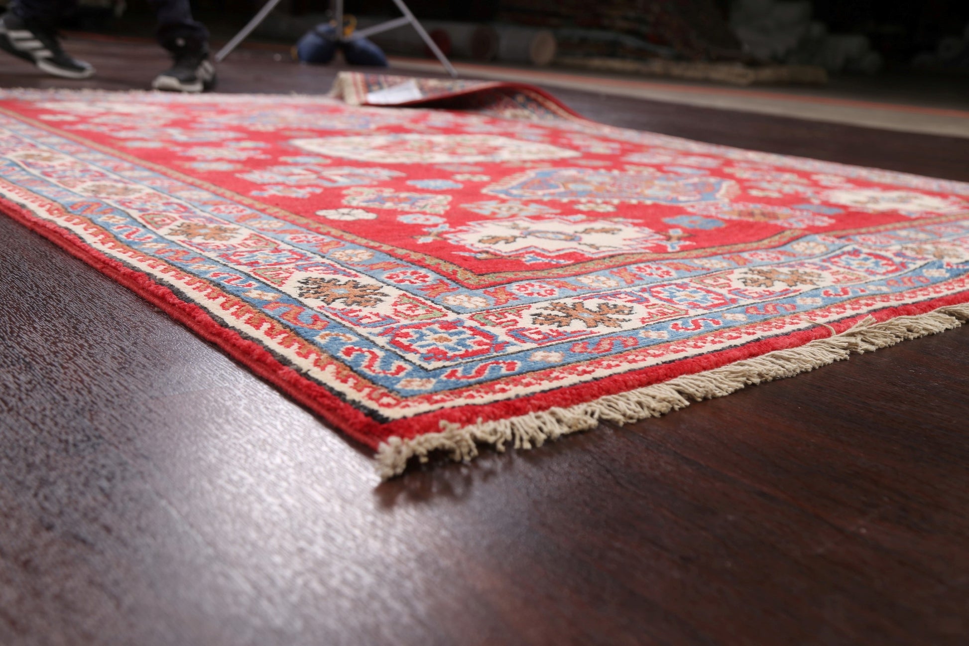 A Beautiful Genuine Pakistan Kazak rug is Hand Knotted by skillful weavers in Pakistan with 100% Wool Material. This rug is in New, First Quality condition. dimensions are 6' 7'' X 5' 0'' in foot and 201 X 152 in centimeter. the primary color is Red.
