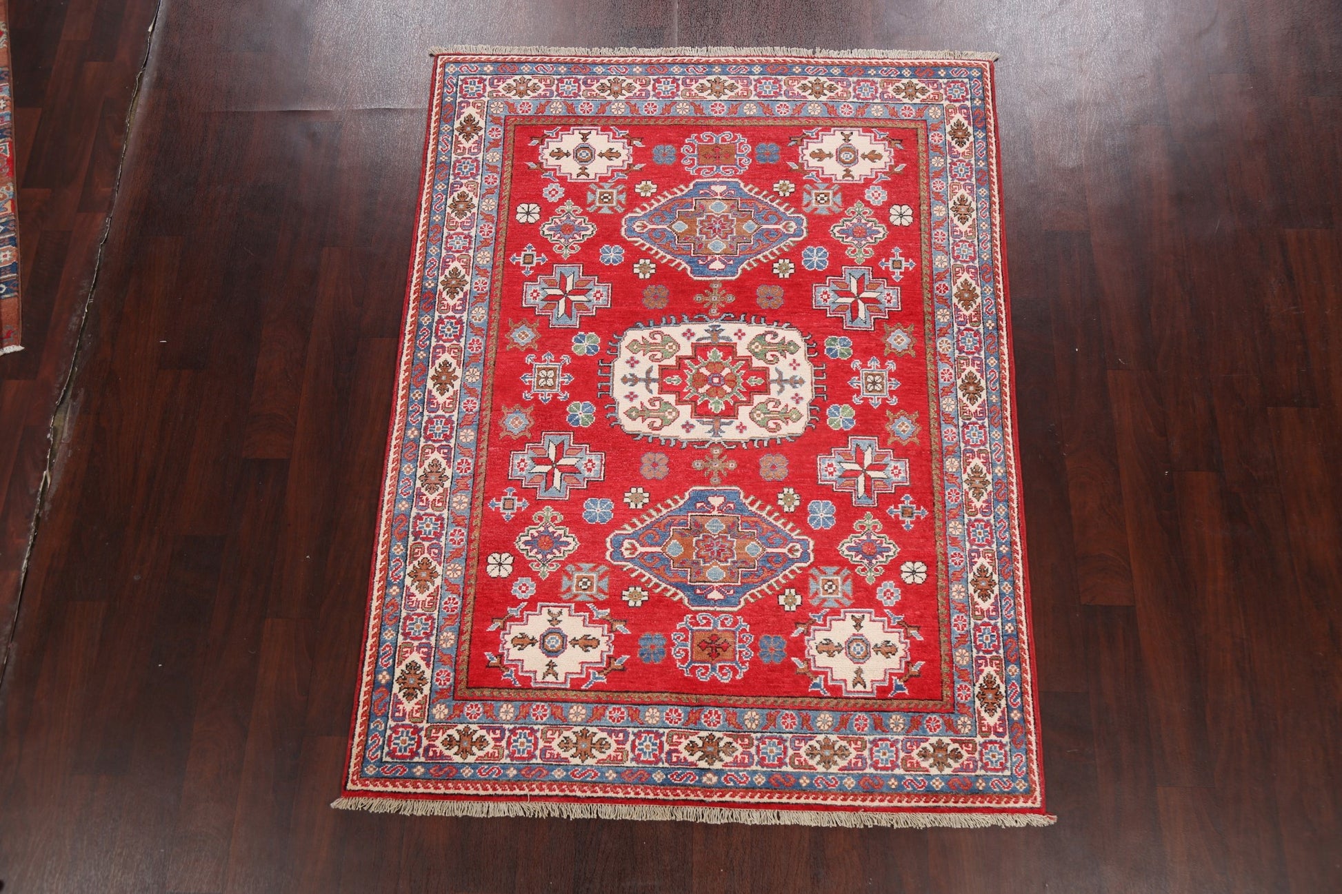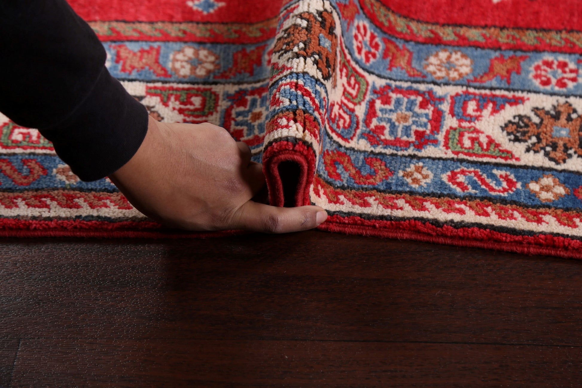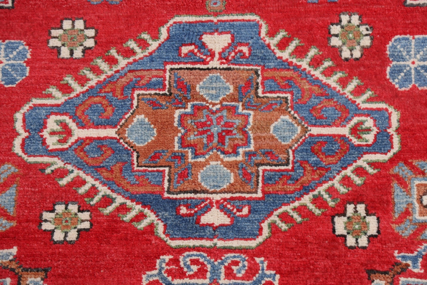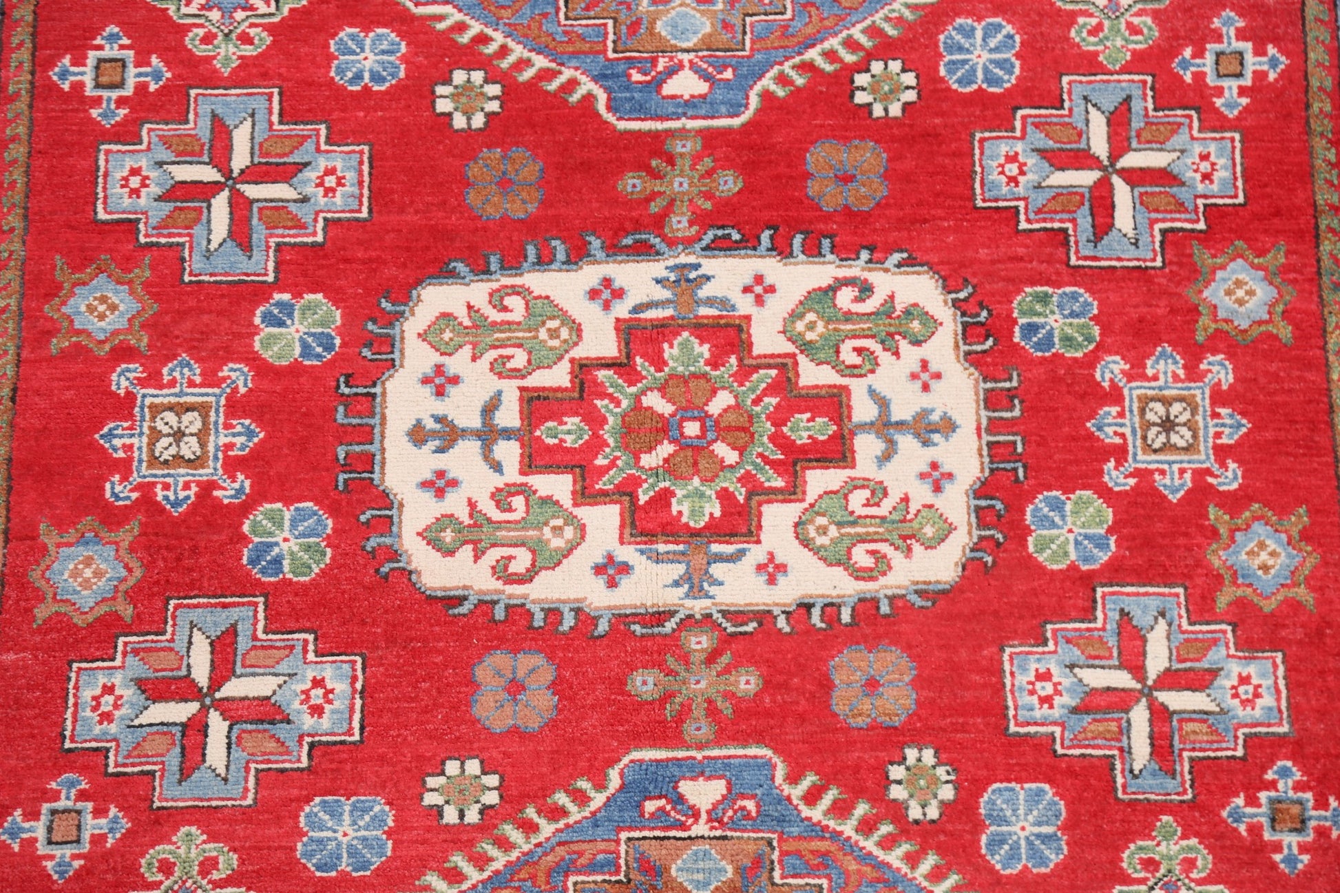 A Beautiful Genuine Pakistan Kazak rug is Hand Knotted by skillful weavers in Pakistan with 100% Wool Material. This rug is in New, First Quality condition. dimensions are 6' 7'' X 5' 0'' in foot and 201 X 152 in centimeter. the primary color is Red.