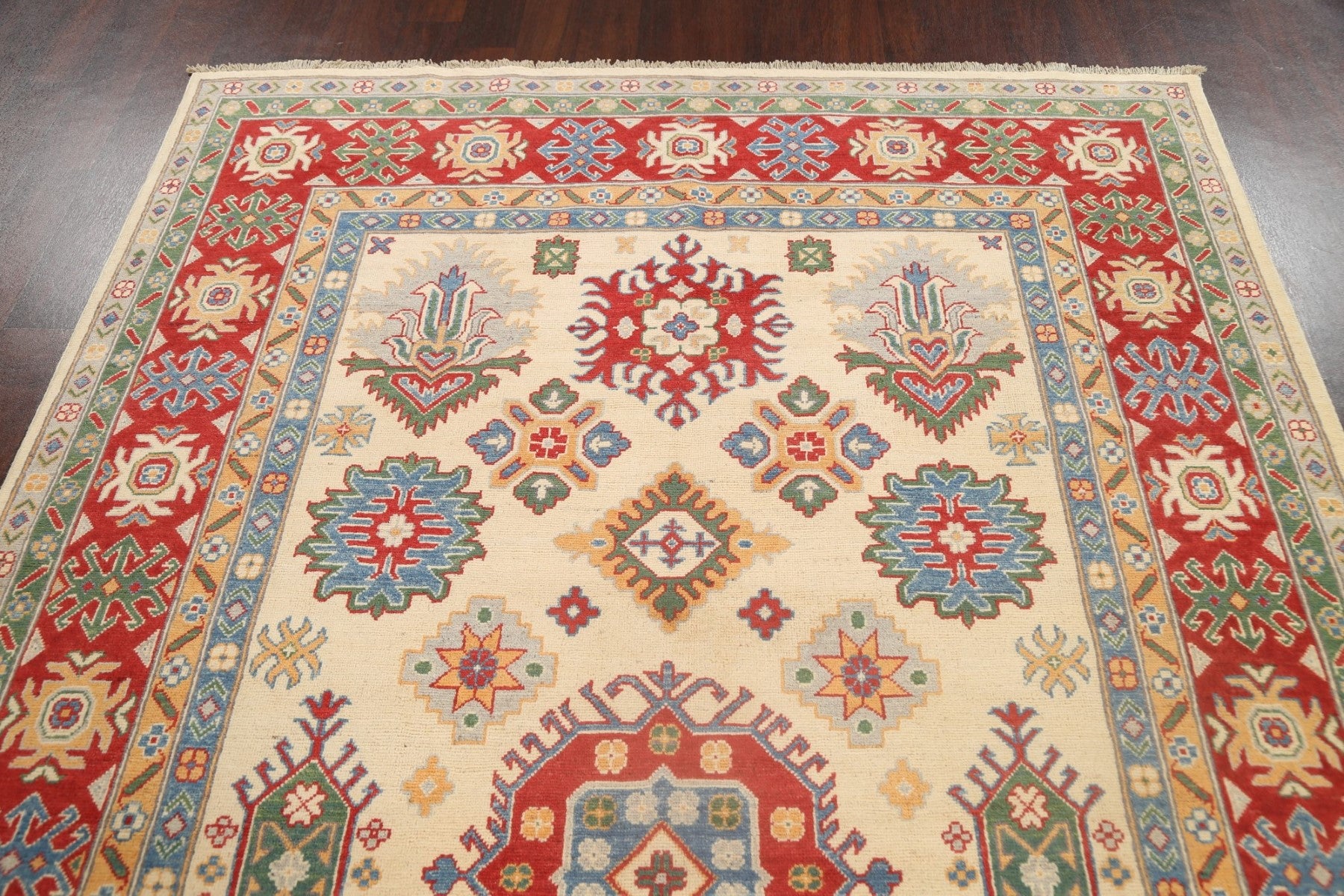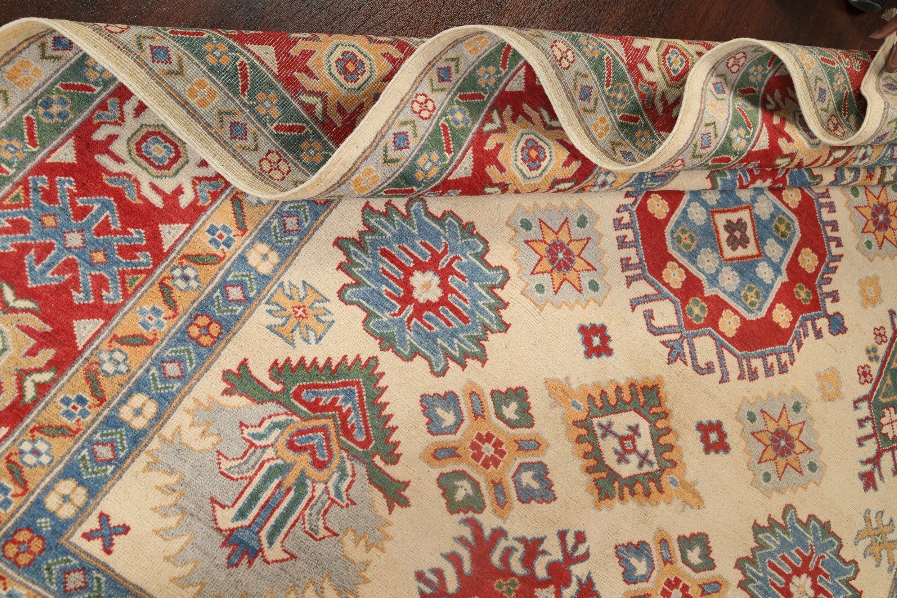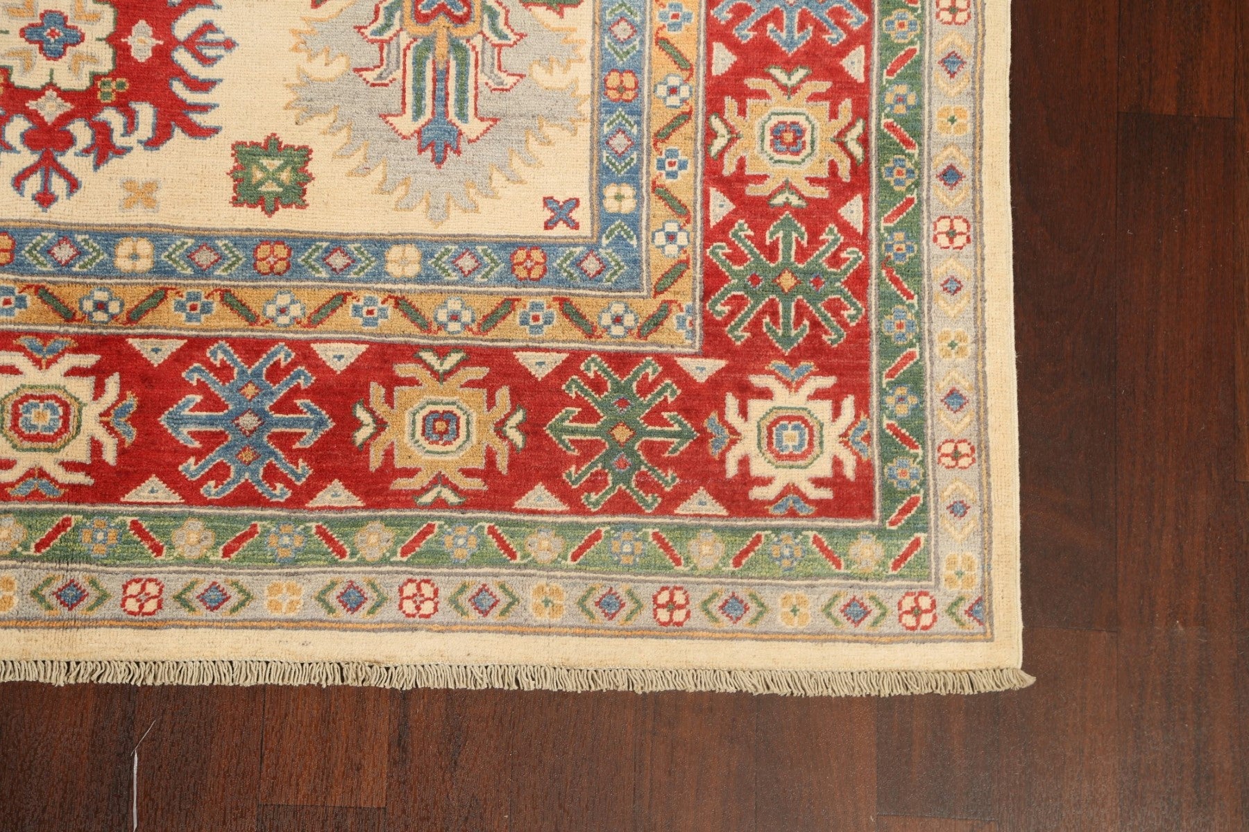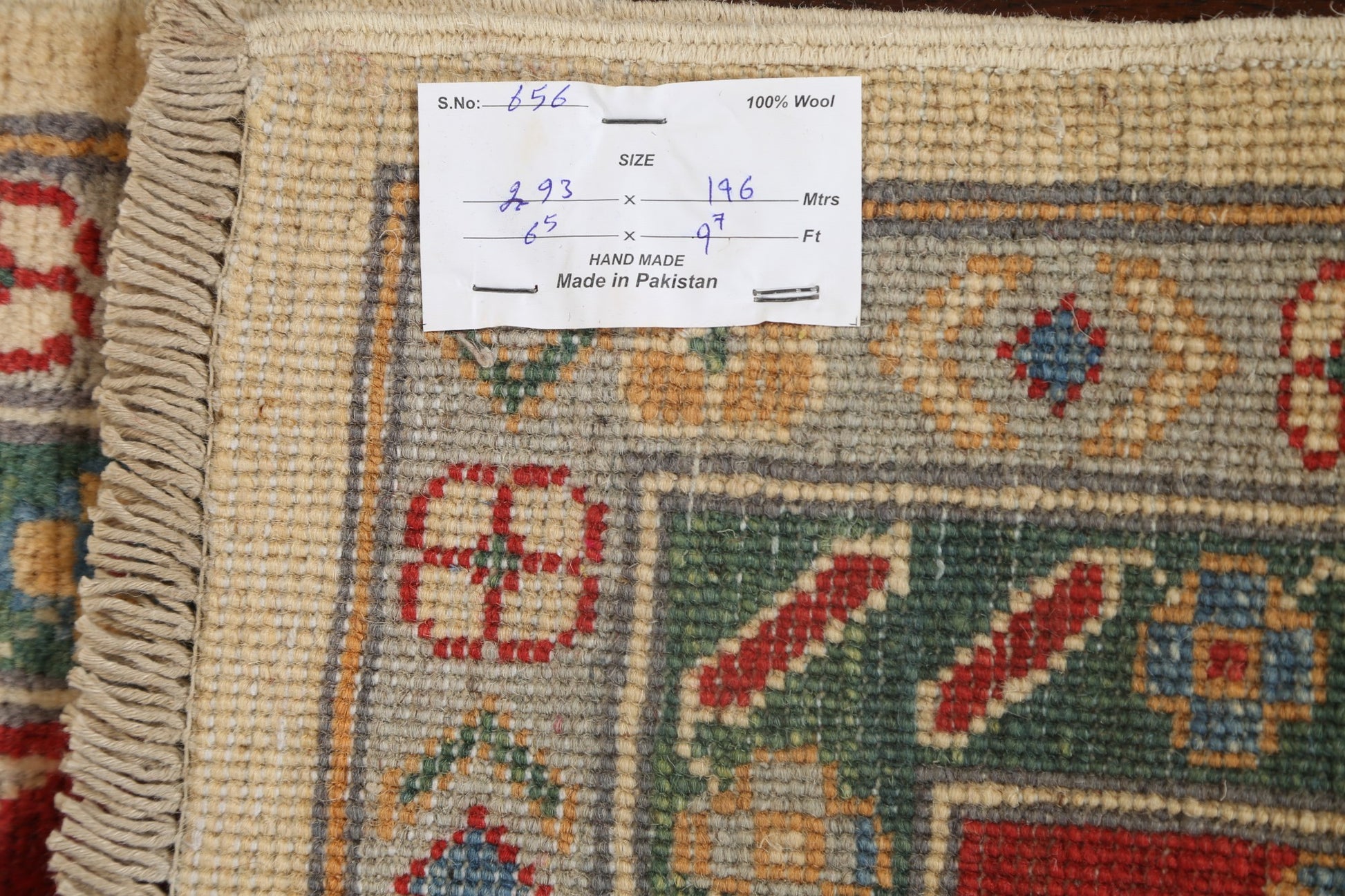 A Beautiful Genuine Pakistan Kazak rug is Hand Knotted by skillful weavers in Pakistan with 100% Wool Material. This rug is in New, First Quality condition. dimensions are 9' 7'' X 6' 5'' in foot and 292 X 196 in centimeter. the primary color is Beige & Ivories.