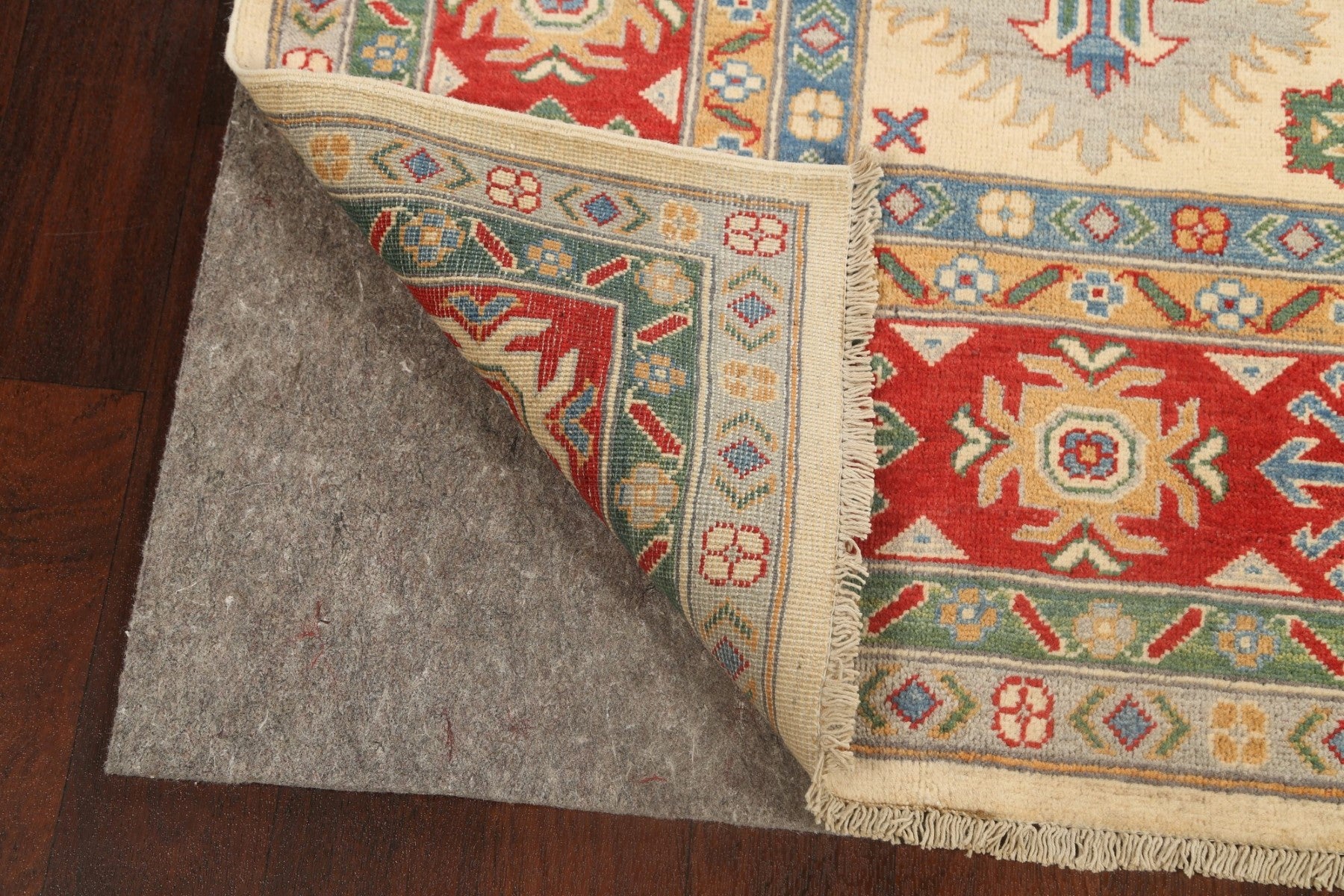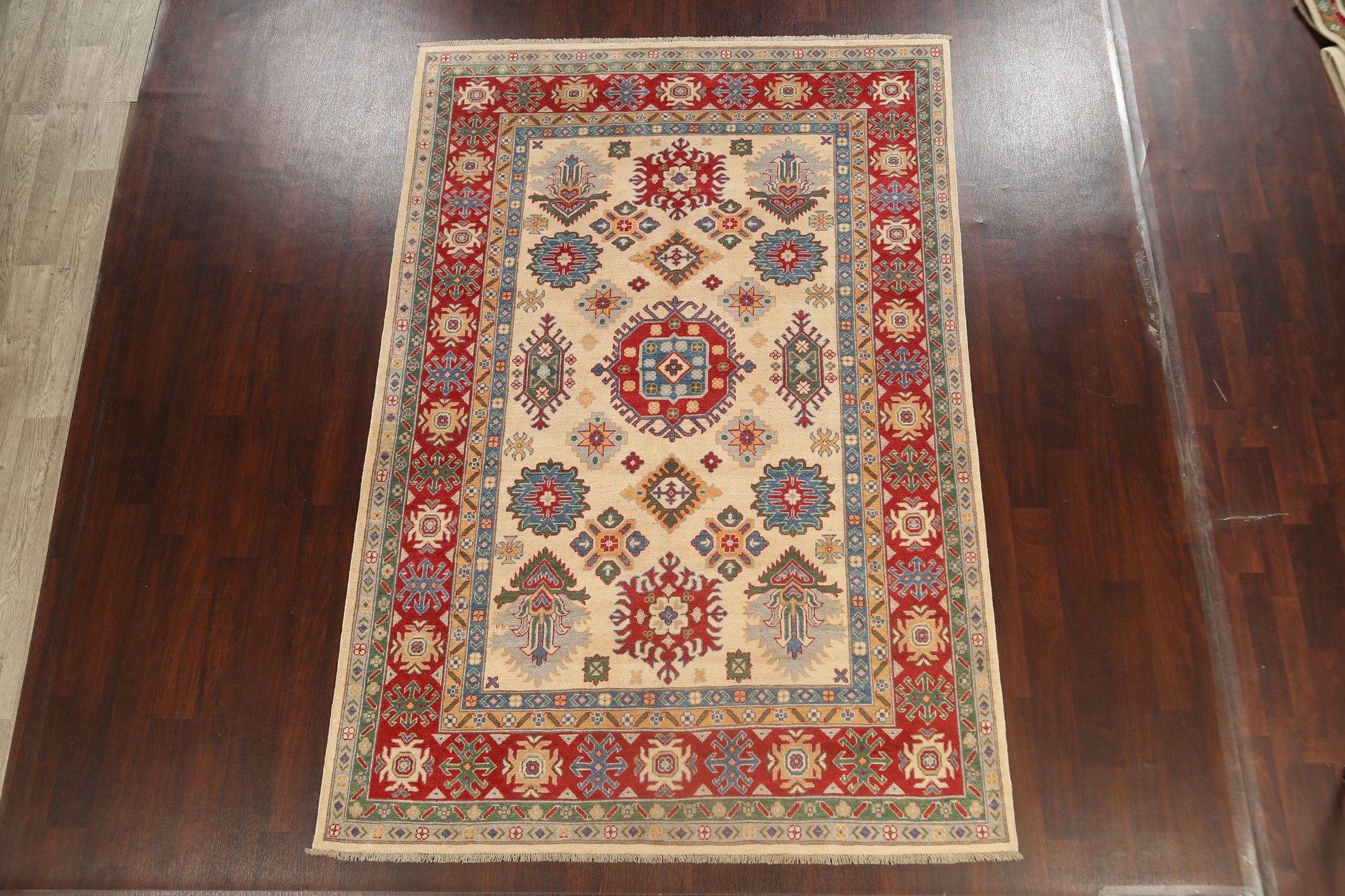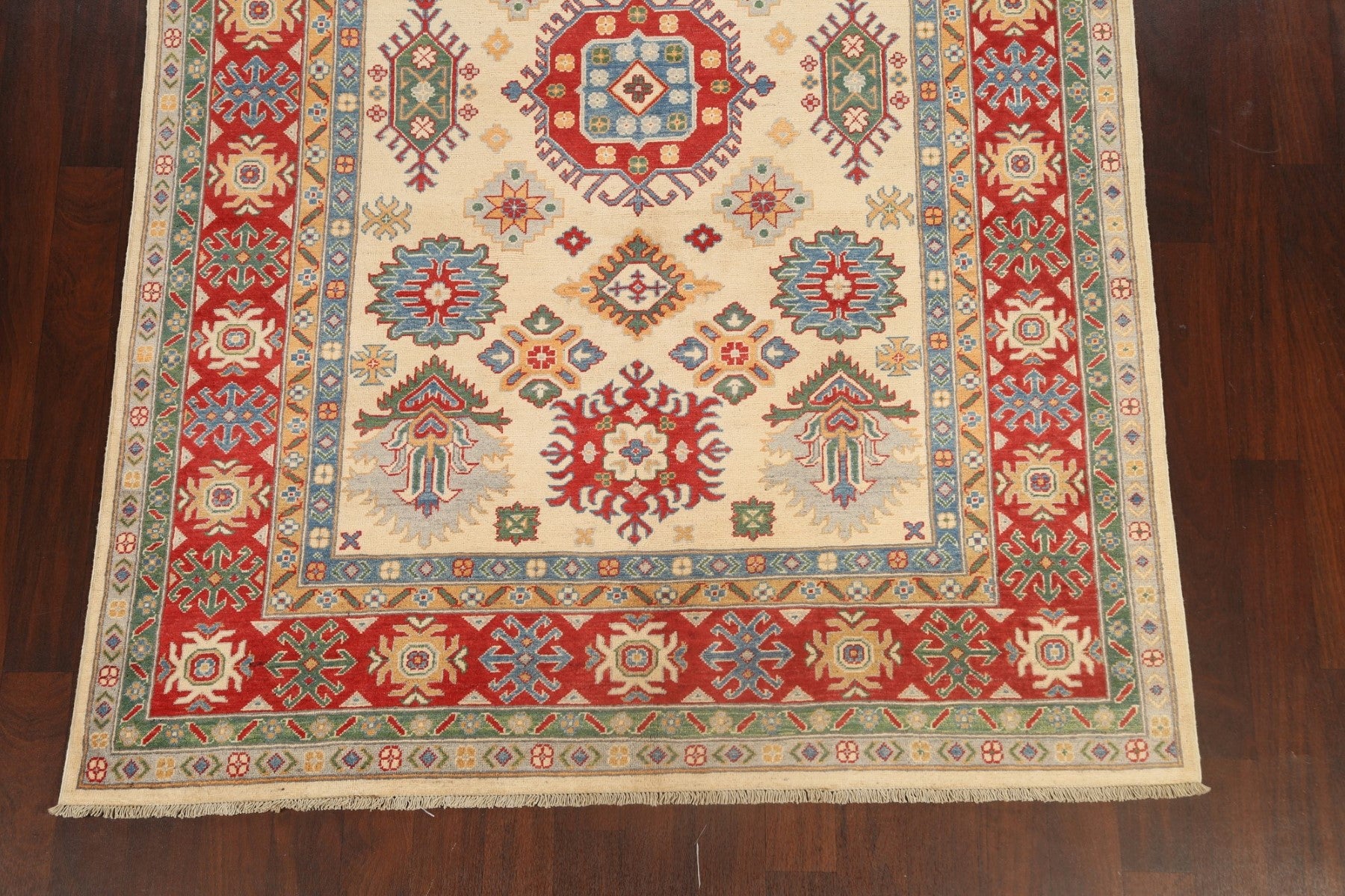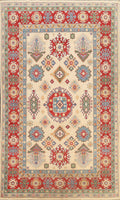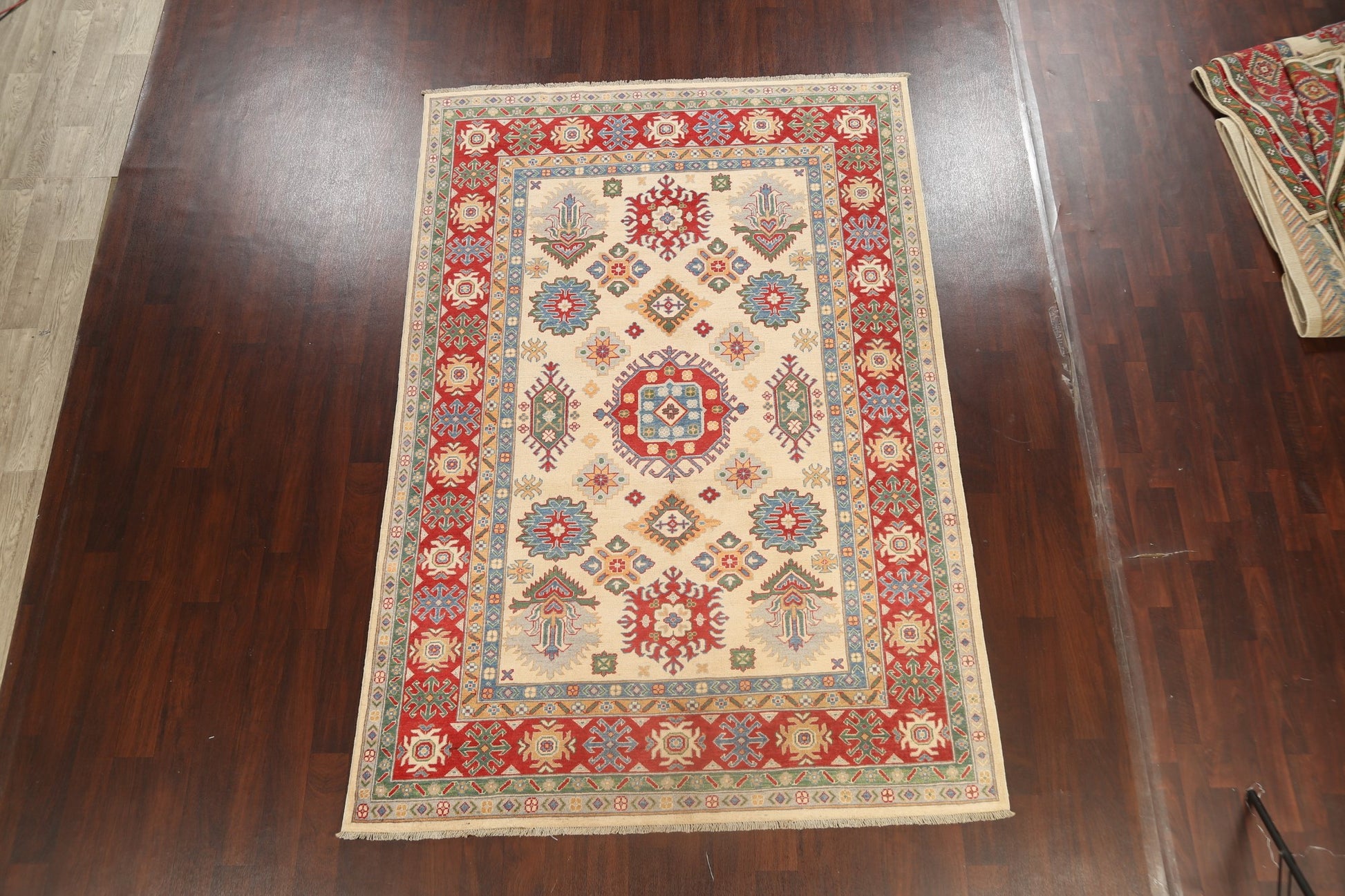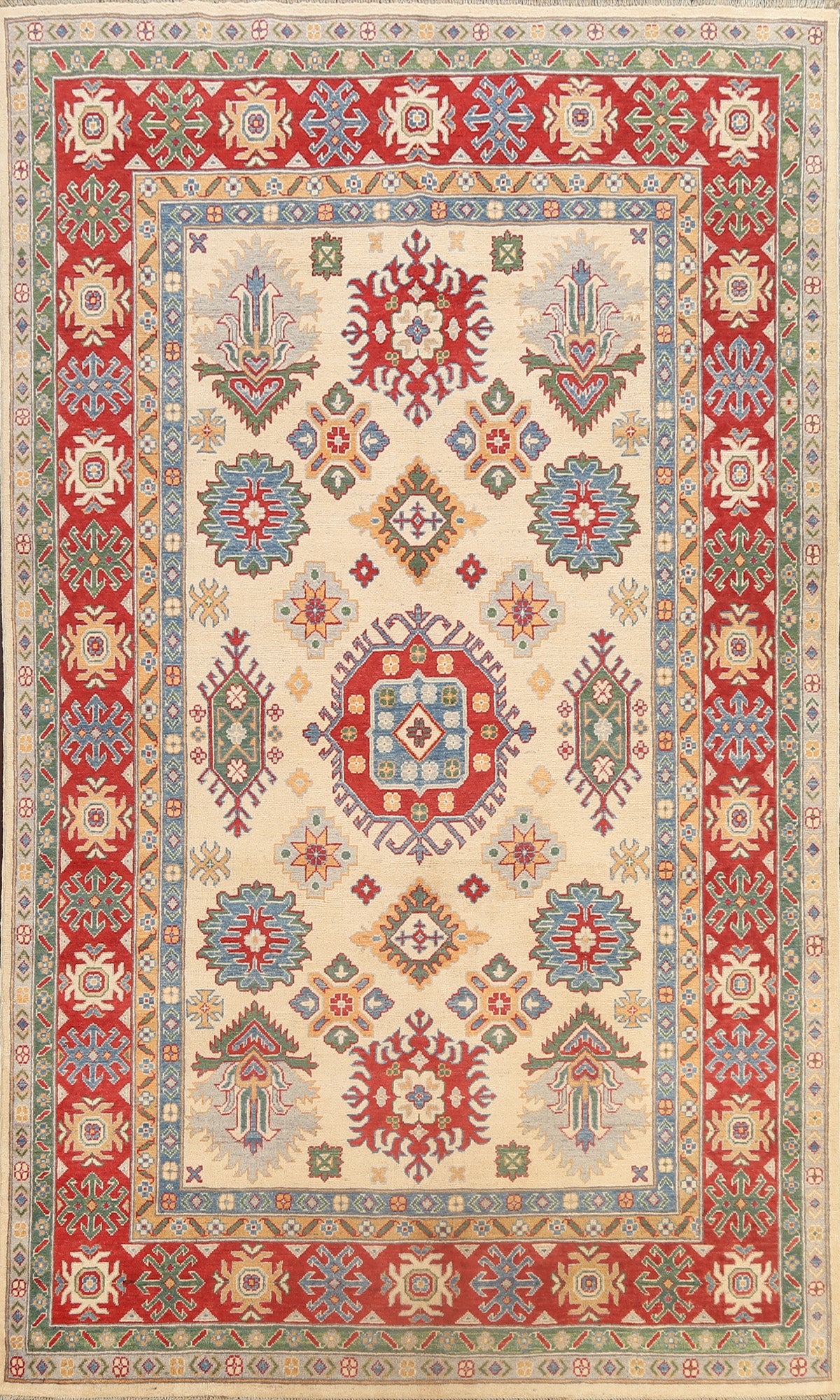 A Beautiful Genuine Pakistan Kazak rug is Hand Knotted by skillful weavers in Pakistan with 100% Wool Material. This rug is in New, First Quality condition. dimensions are 9' 7'' X 6' 5'' in foot and 292 X 196 in centimeter. the primary color is Beige & Ivories.