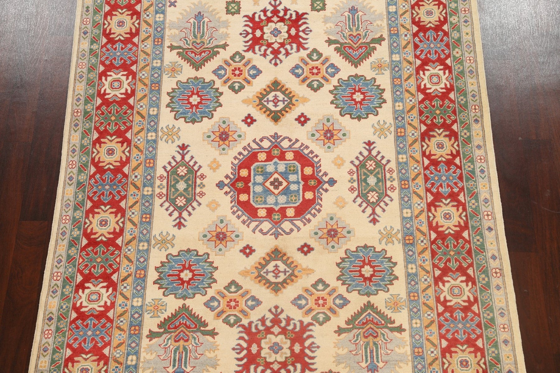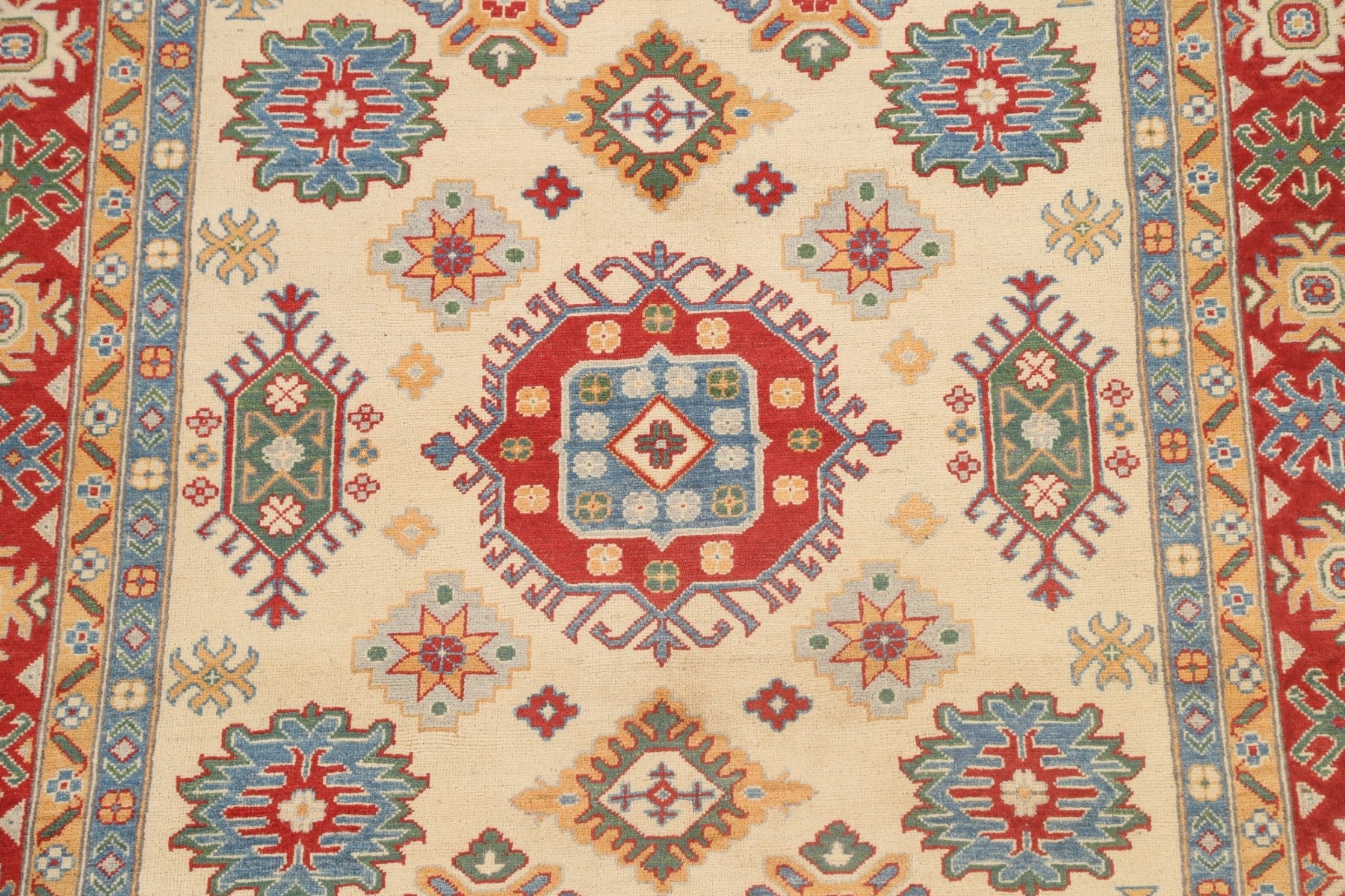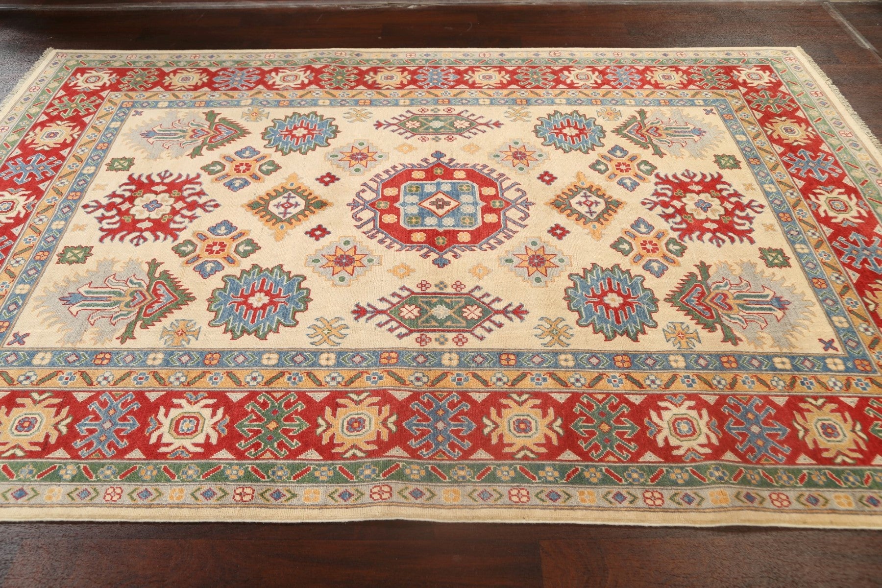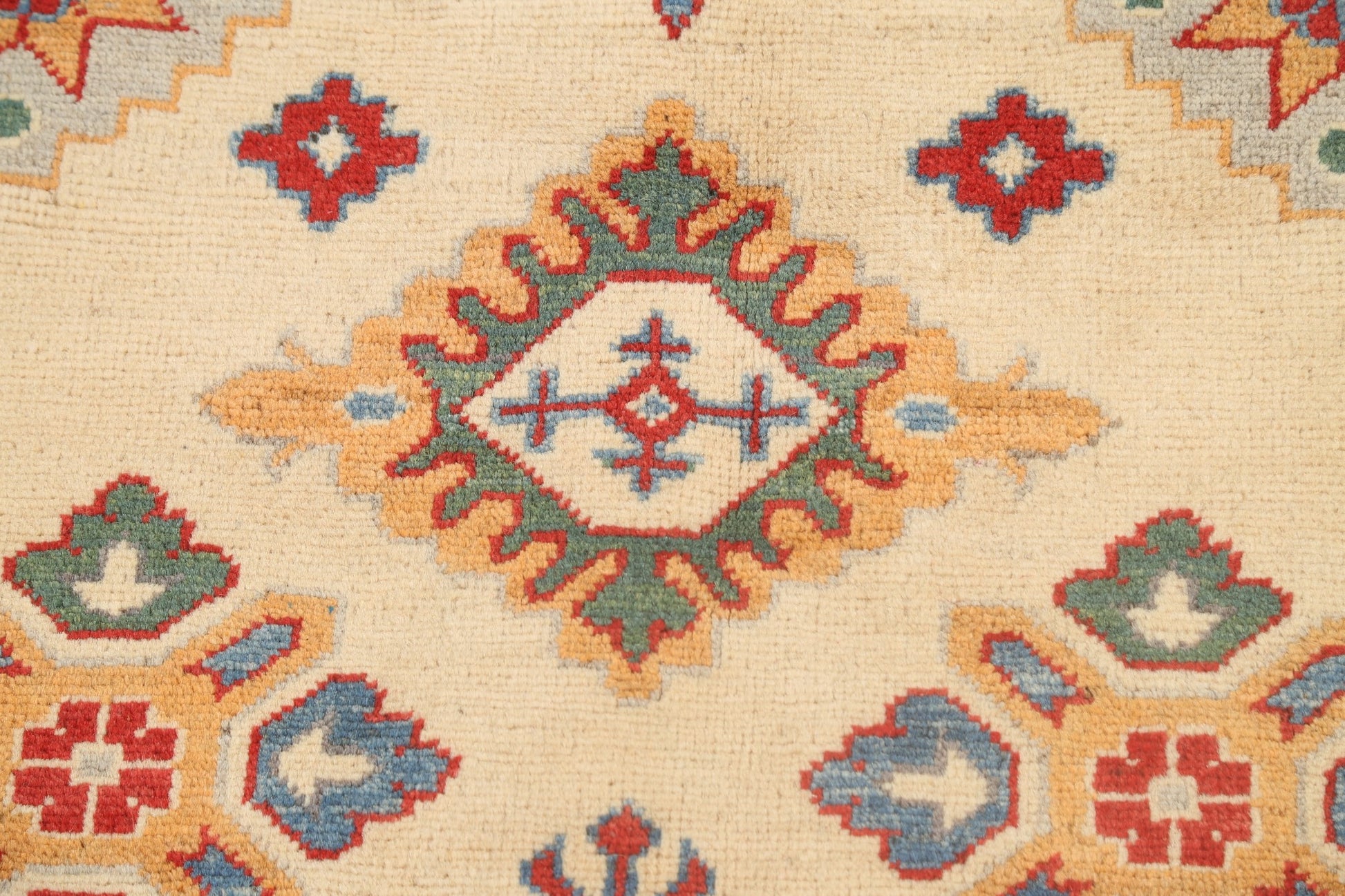 A Beautiful Genuine Pakistan Kazak rug is Hand Knotted by skillful weavers in Pakistan with 100% Wool Material. This rug is in New, First Quality condition. dimensions are 9' 7'' X 6' 5'' in foot and 292 X 196 in centimeter. the primary color is Beige & Ivories.