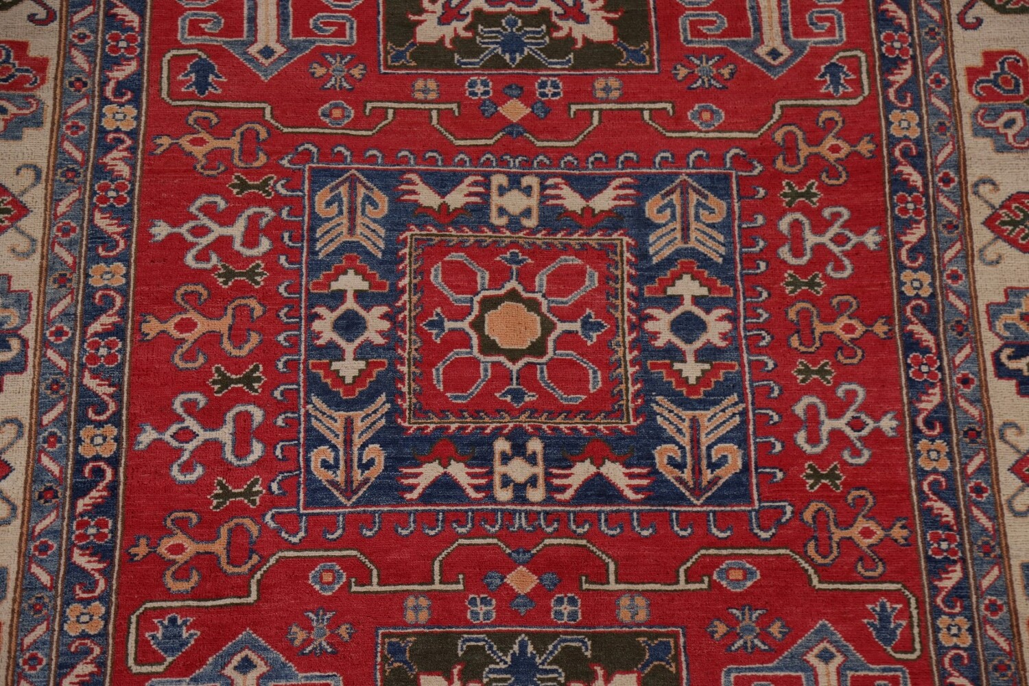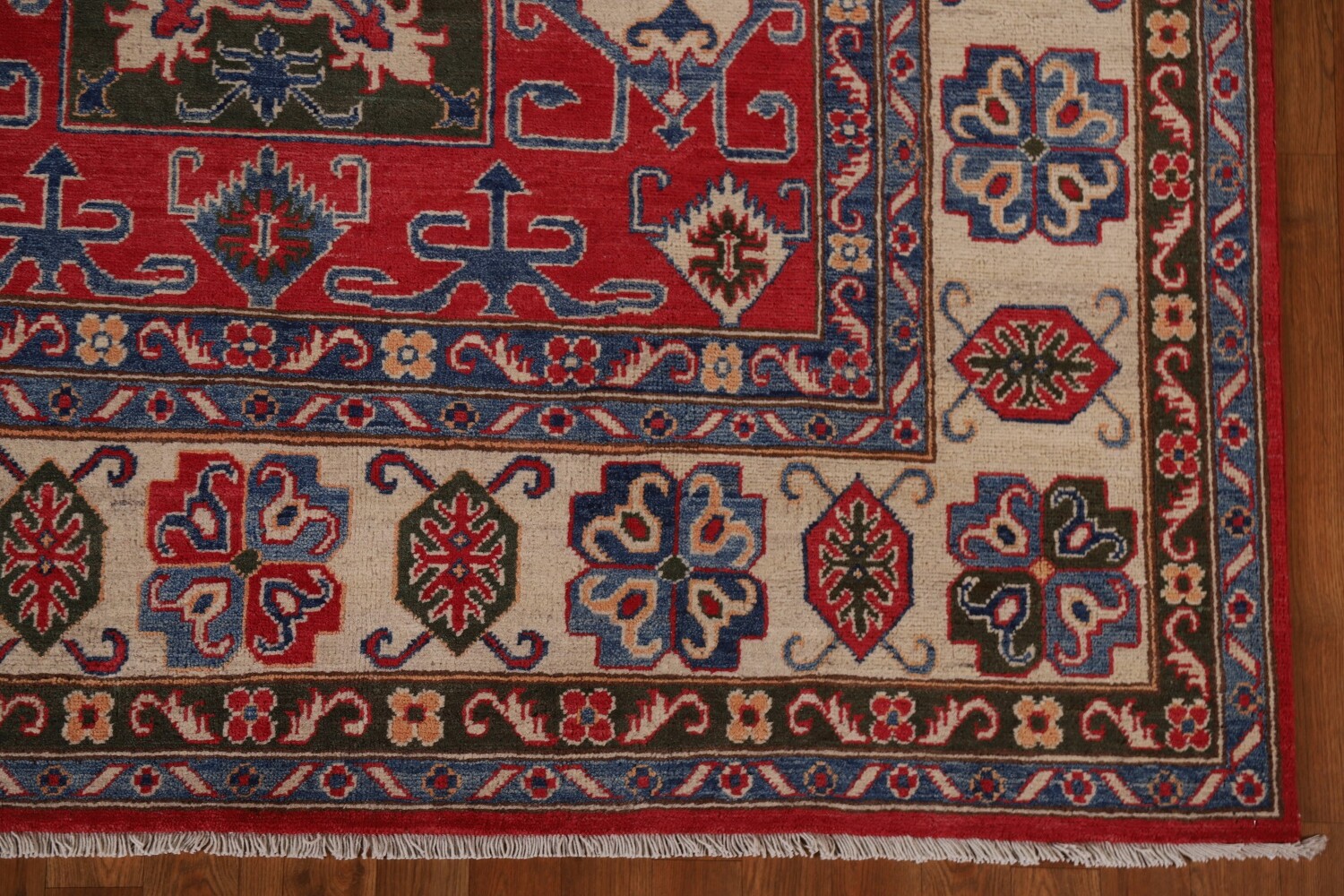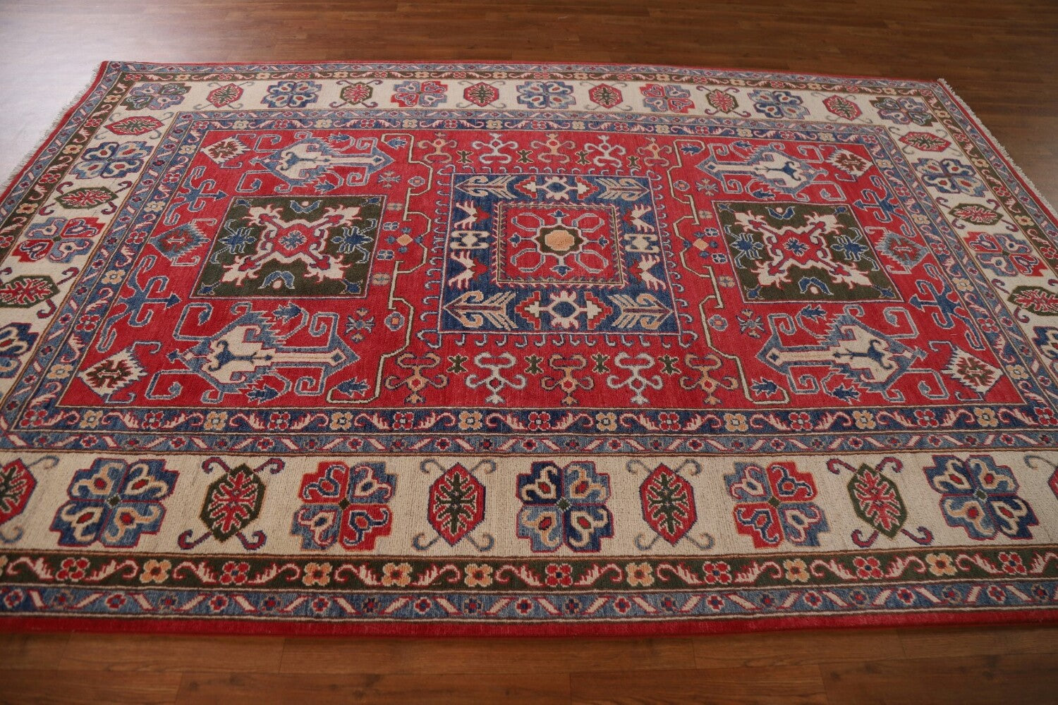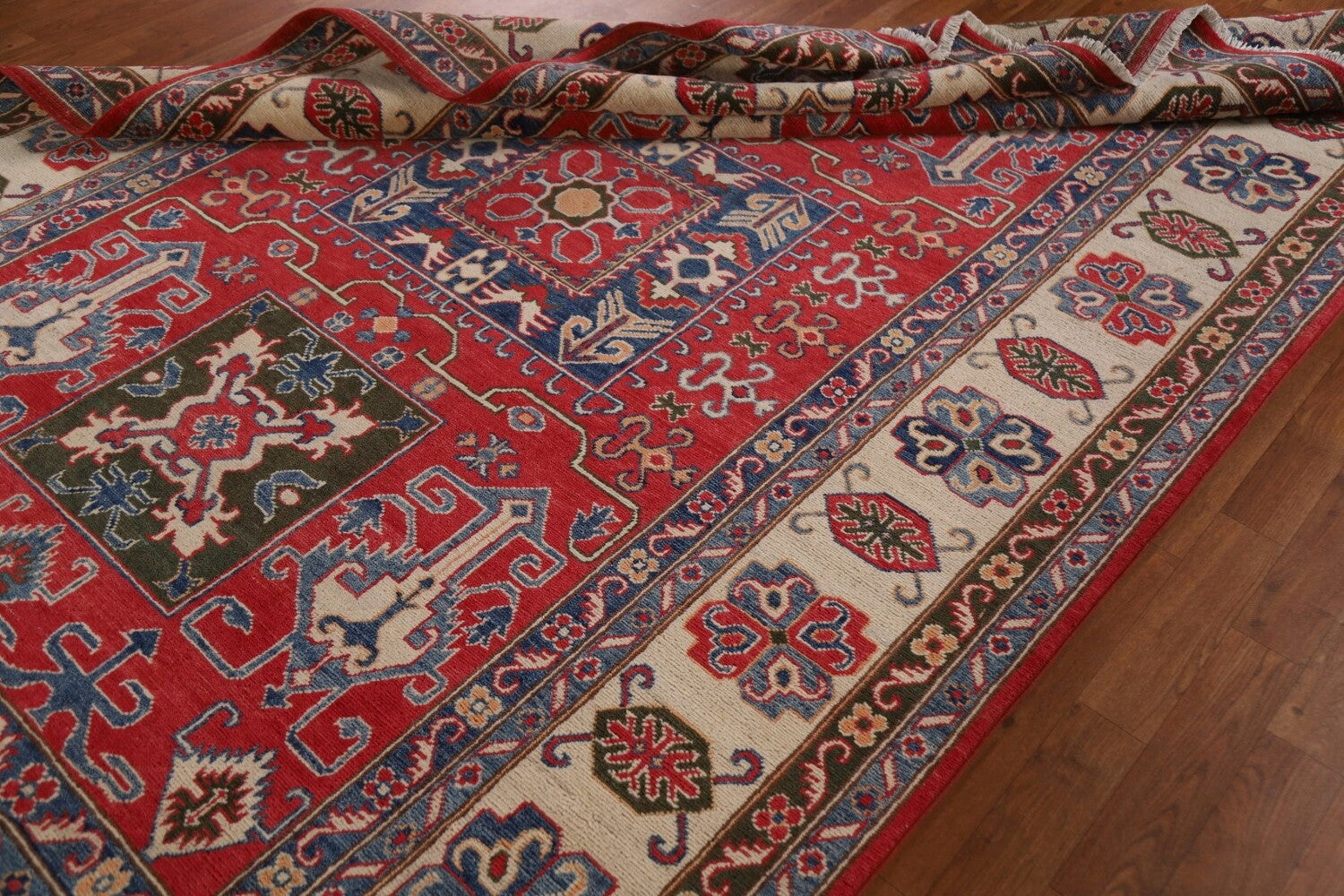 A Beautiful Genuine Pakistan Kazak rug is Hand Knotted by skillful weavers in Pakistan with 100% Wool Material. This rug is in New, First Quality condition. dimensions are 9' 9'' X 6' 5'' in foot and 297 X 196 in centimeter. the primary color is Red.