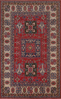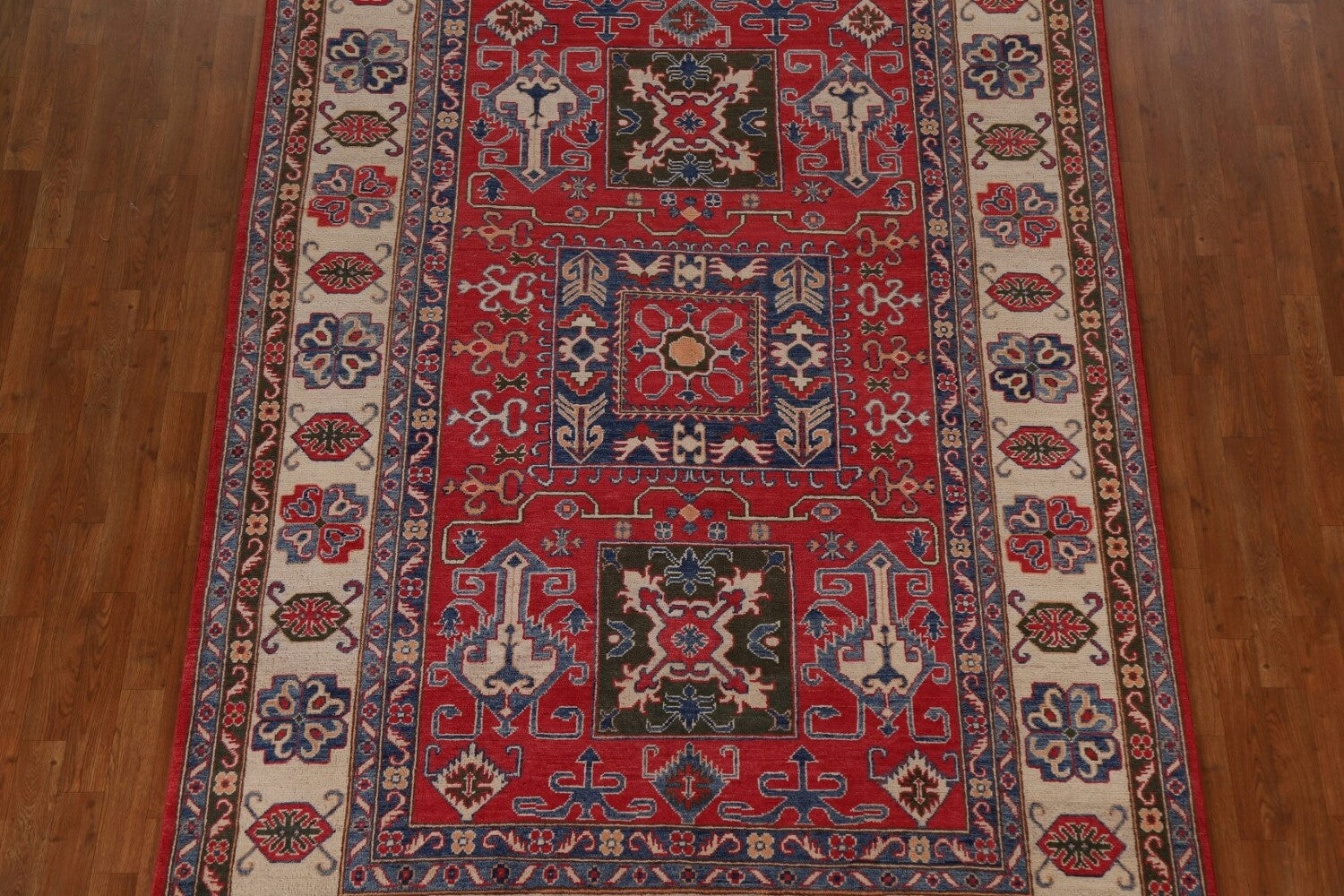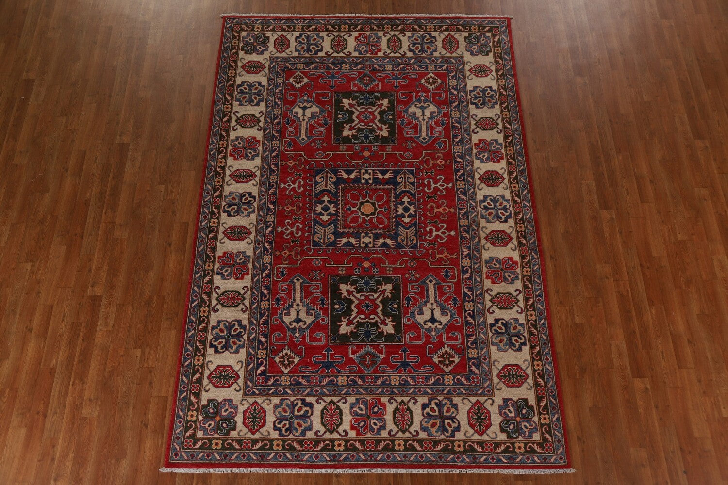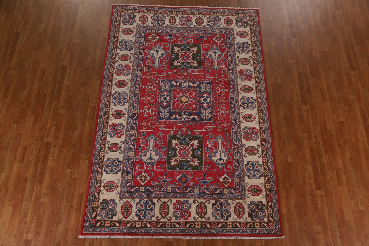 A Beautiful Genuine Pakistan Kazak rug is Hand Knotted by skillful weavers in Pakistan with 100% Wool Material. This rug is in New, First Quality condition. dimensions are 9' 9'' X 6' 5'' in foot and 297 X 196 in centimeter. the primary color is Red.