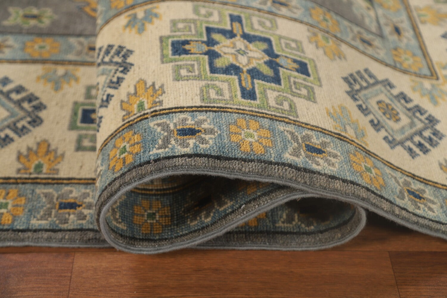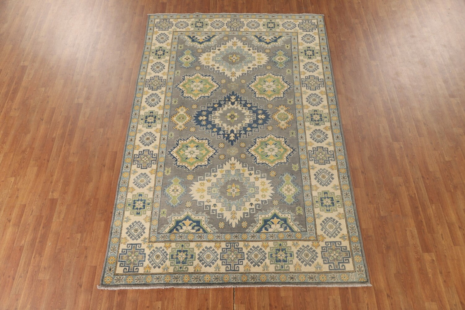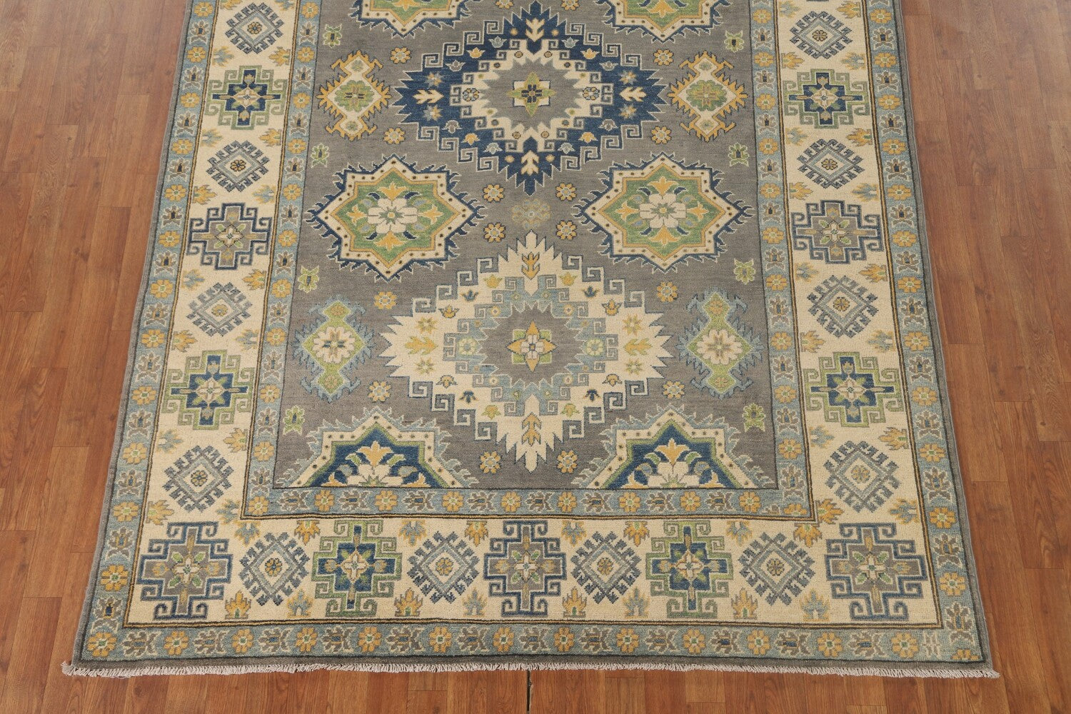 A Beautiful Genuine Pakistan Kazak rug is Hand Knotted by skillful weavers in Pakistan with 100% Wool Material. This rug is in New, First Quality condition. dimensions are 9' 9'' X 6' 5'' in foot and 297 X 196 in centimeter. the primary color is Greys & Charcoal.
