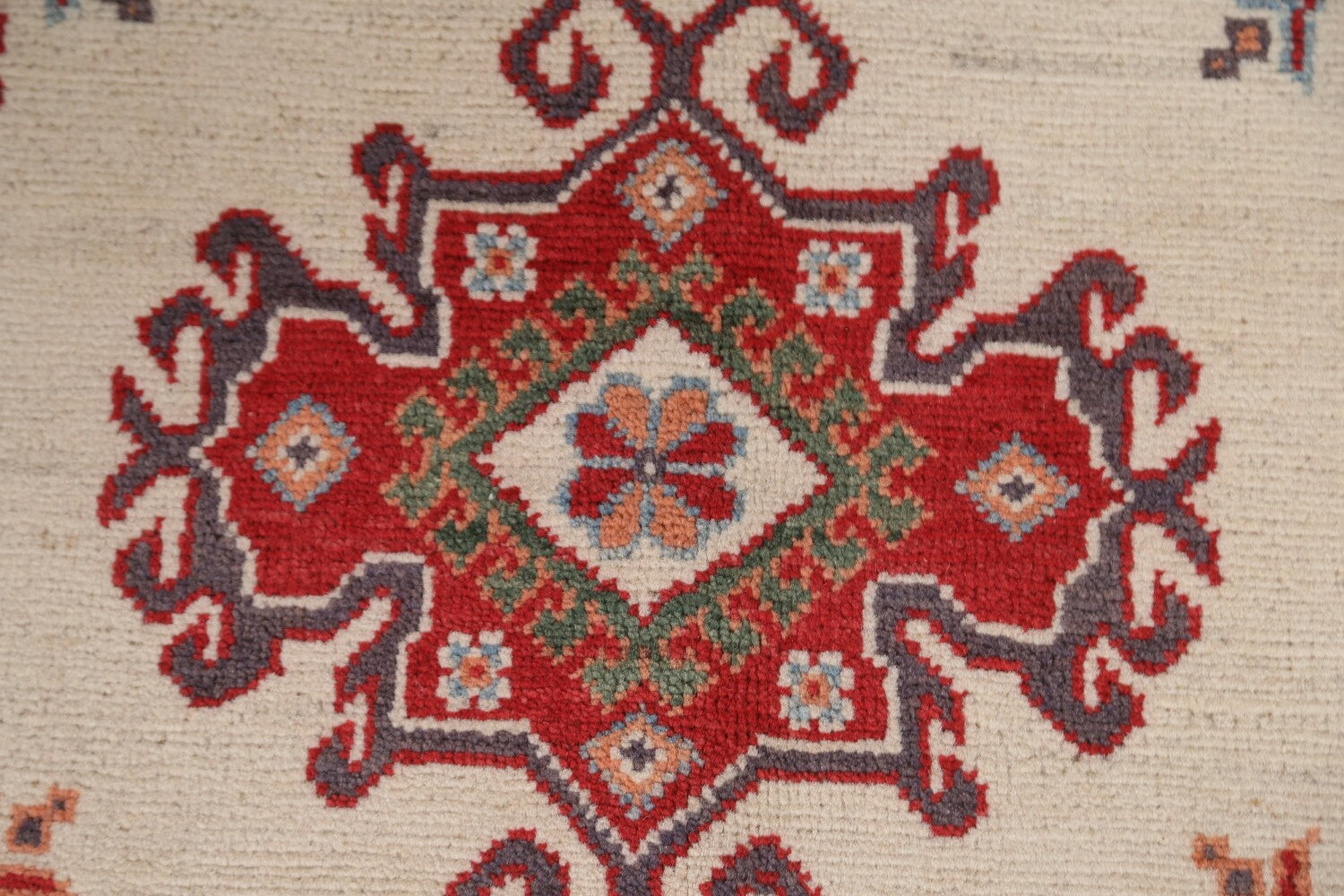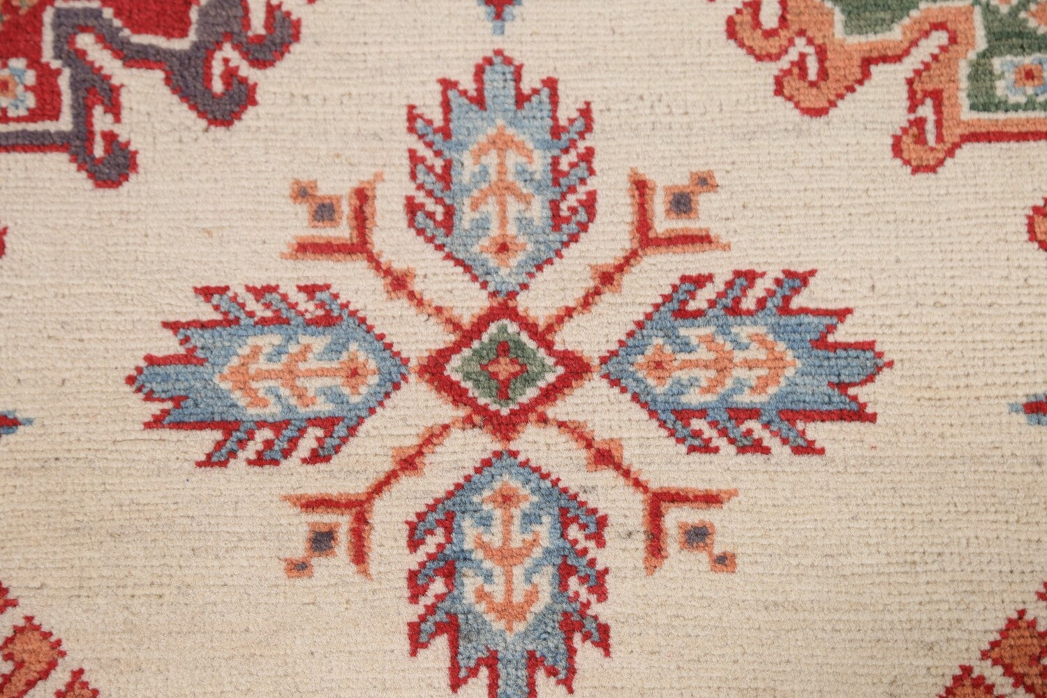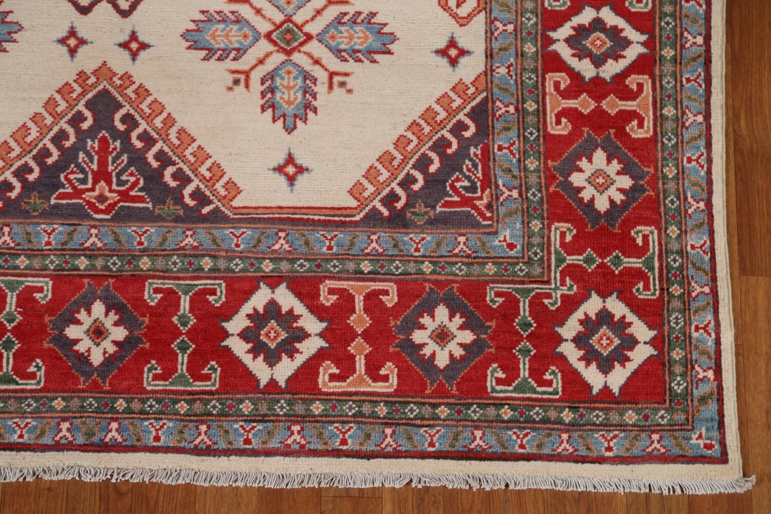 A Beautiful Genuine Pakistan Kazak rug is Hand Knotted by skillful weavers in Pakistan with 100% Wool Material. This rug is in condition. dimensions are 8' 4'' X 5' 7'' in foot and 254 X 170 in centimeter. the primary color is Beige & Ivories.