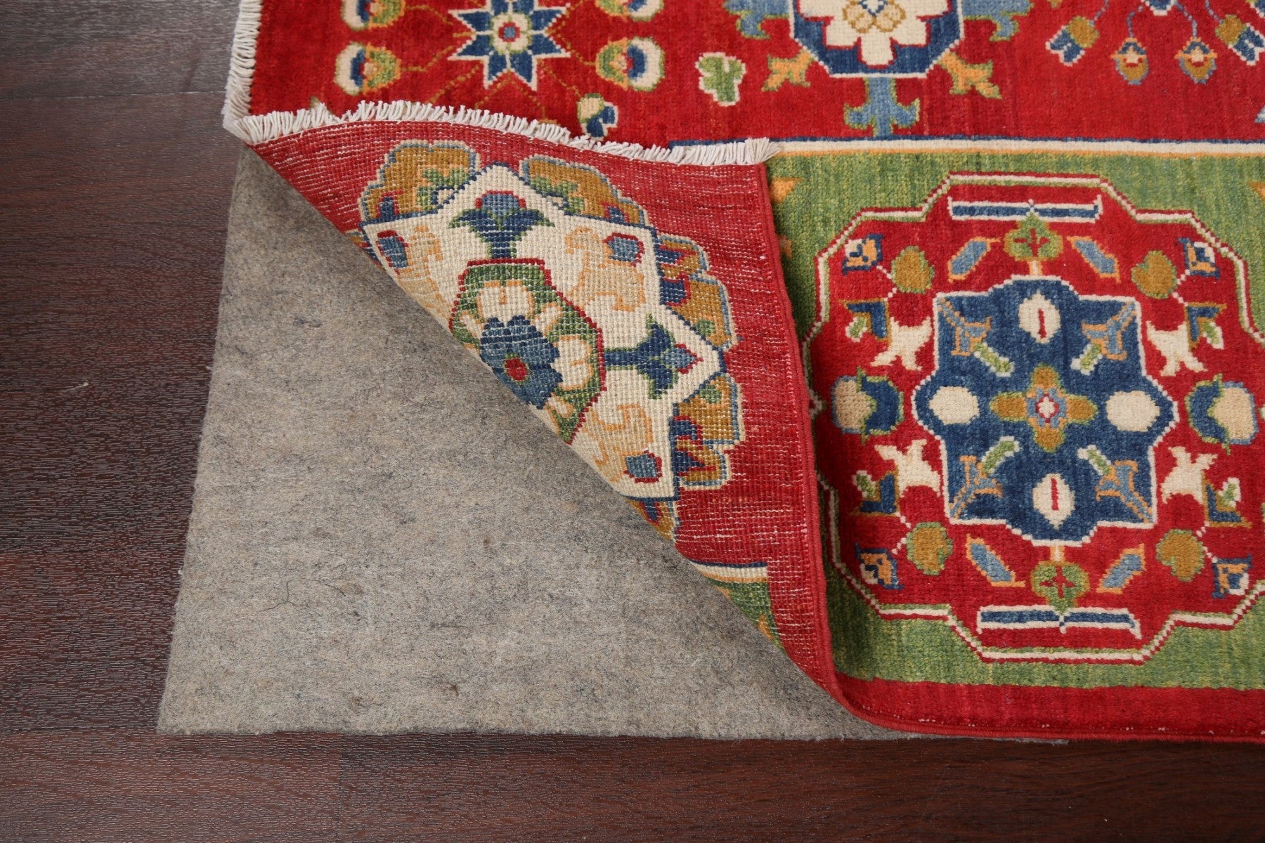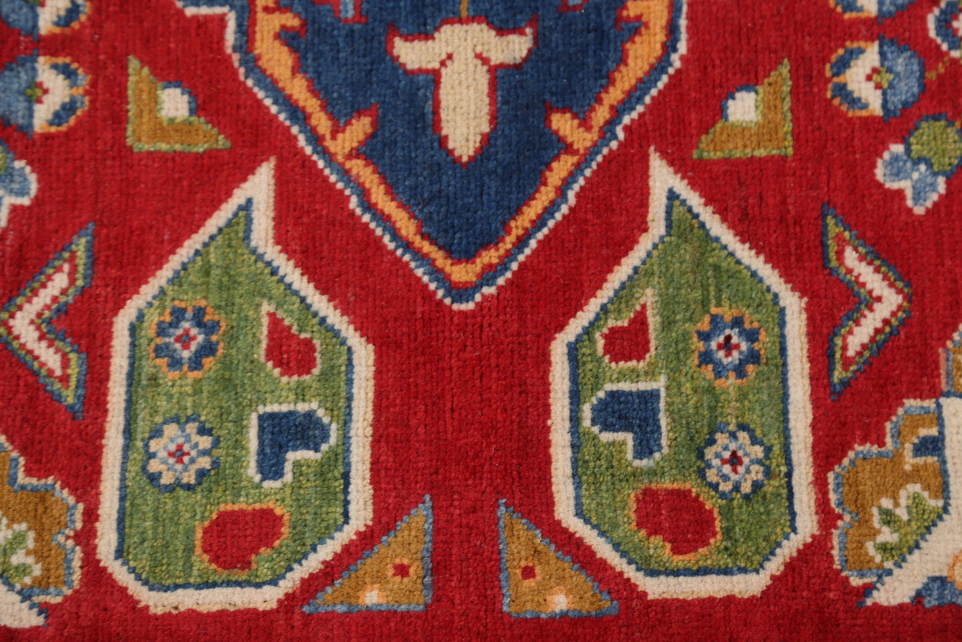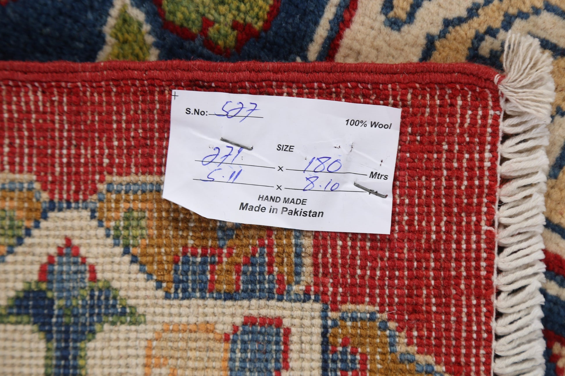 A Beautiful Genuine Pakistan Kazak rug is Hand Knotted by skillful weavers in Pakistan with 100% Wool Material. This rug is in New, First Quality condition. dimensions are 8' 10'' X 5' 11'' in foot and 269 X 180 in centimeter. the primary color is Red.