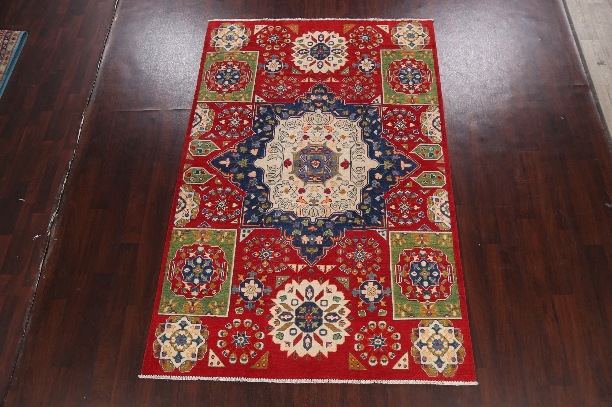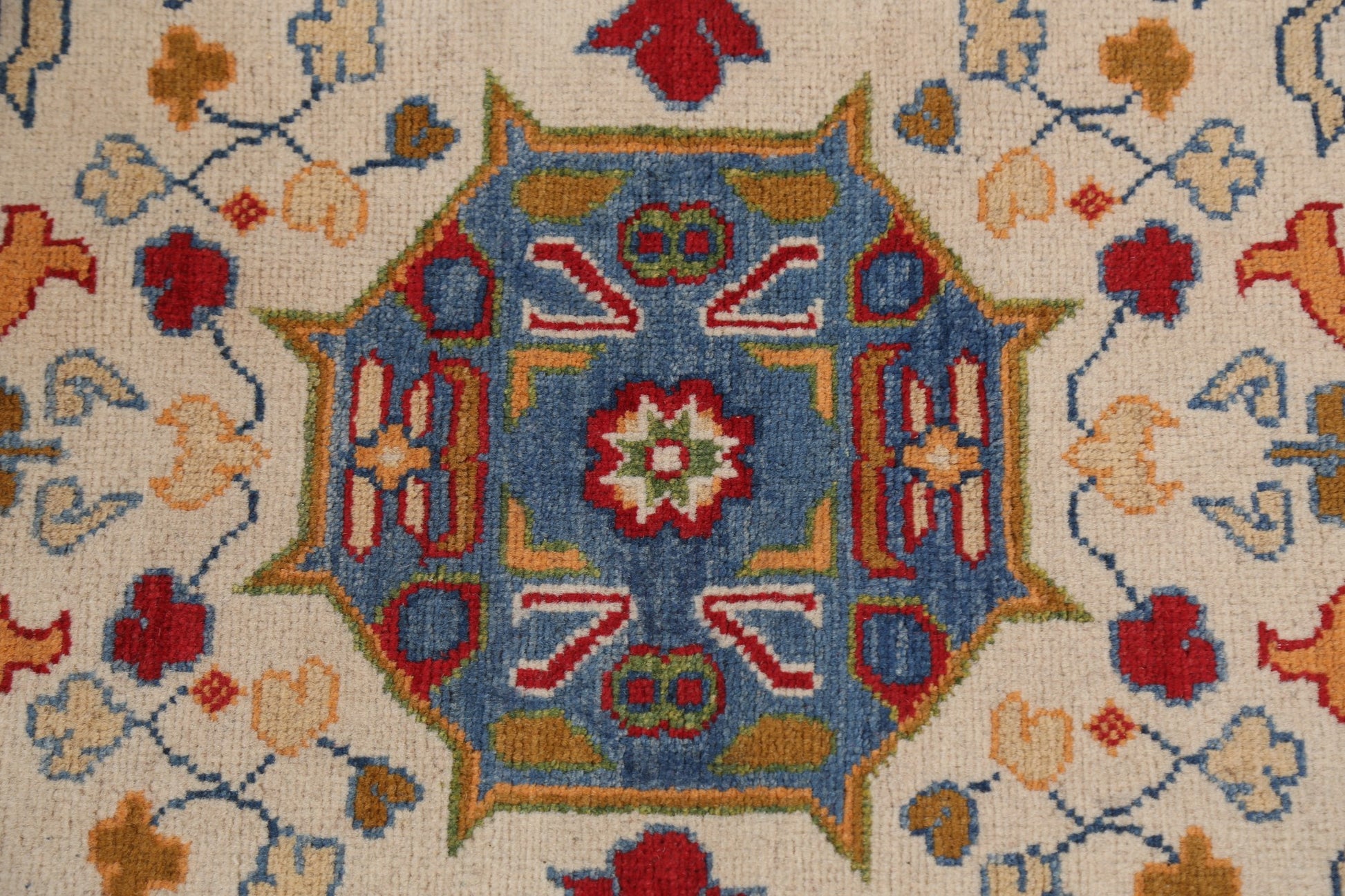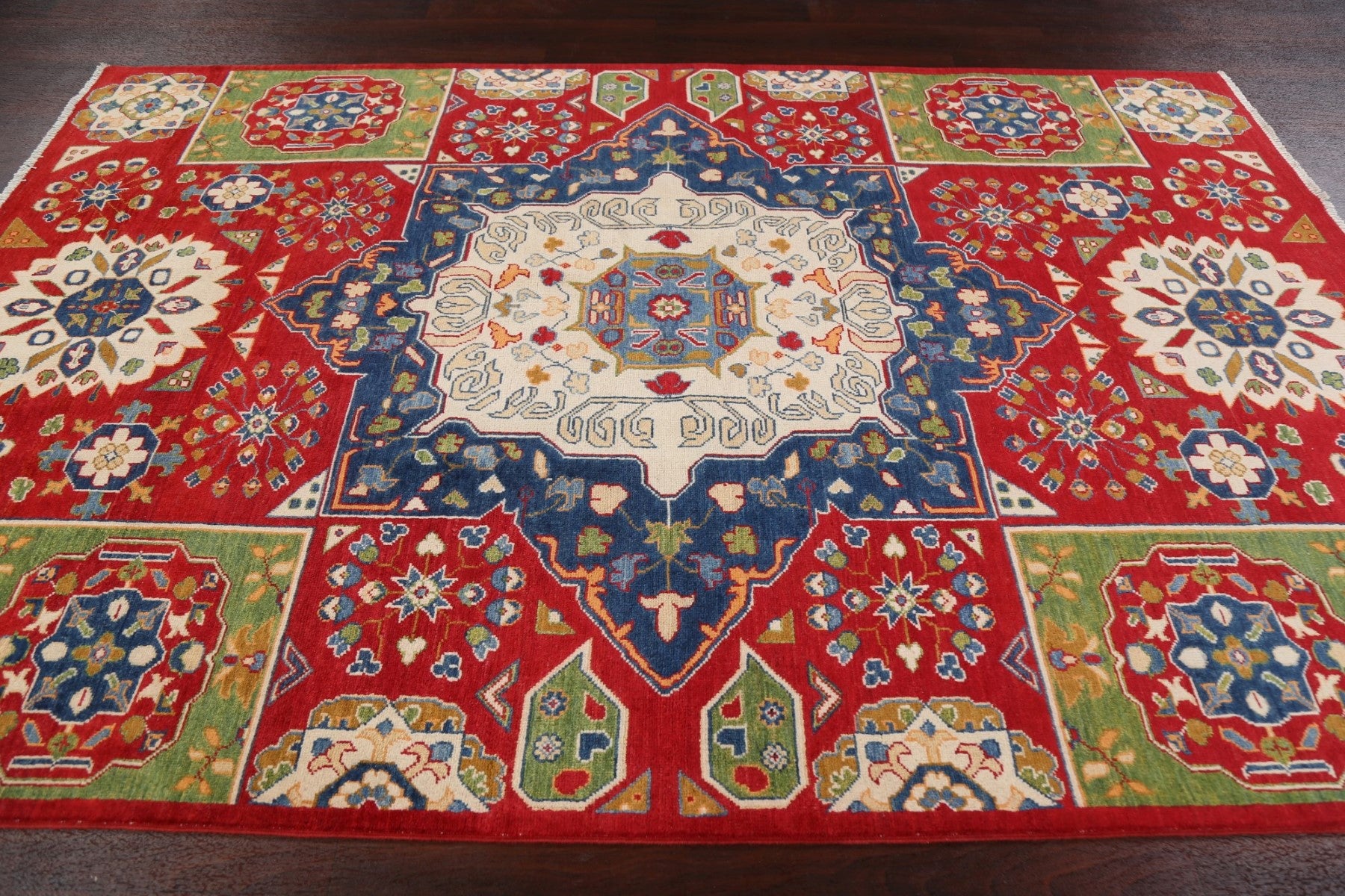 A Beautiful Genuine Pakistan Kazak rug is Hand Knotted by skillful weavers in Pakistan with 100% Wool Material. This rug is in New, First Quality condition. dimensions are 8' 10'' X 5' 11'' in foot and 269 X 180 in centimeter. the primary color is Red.
