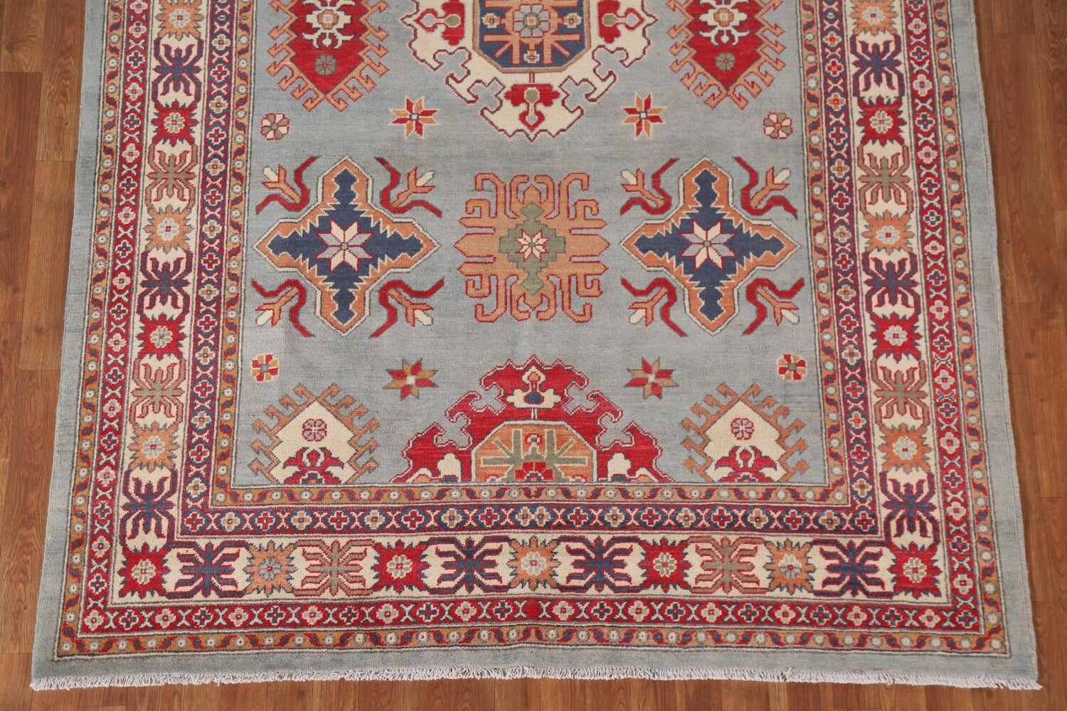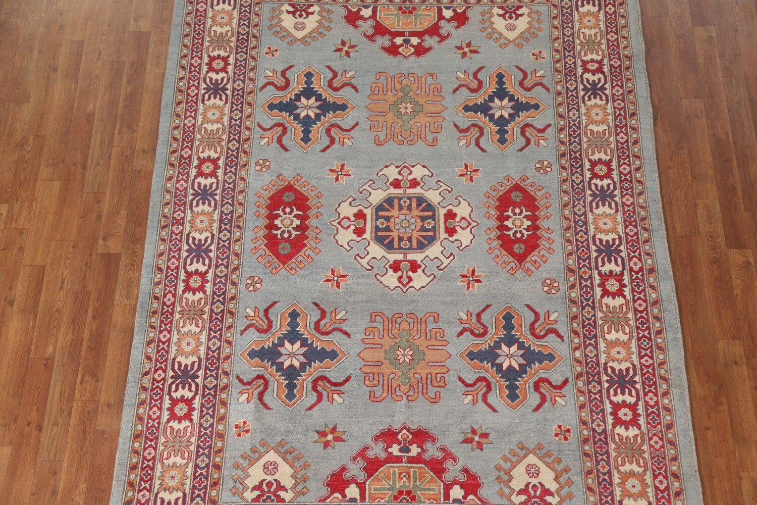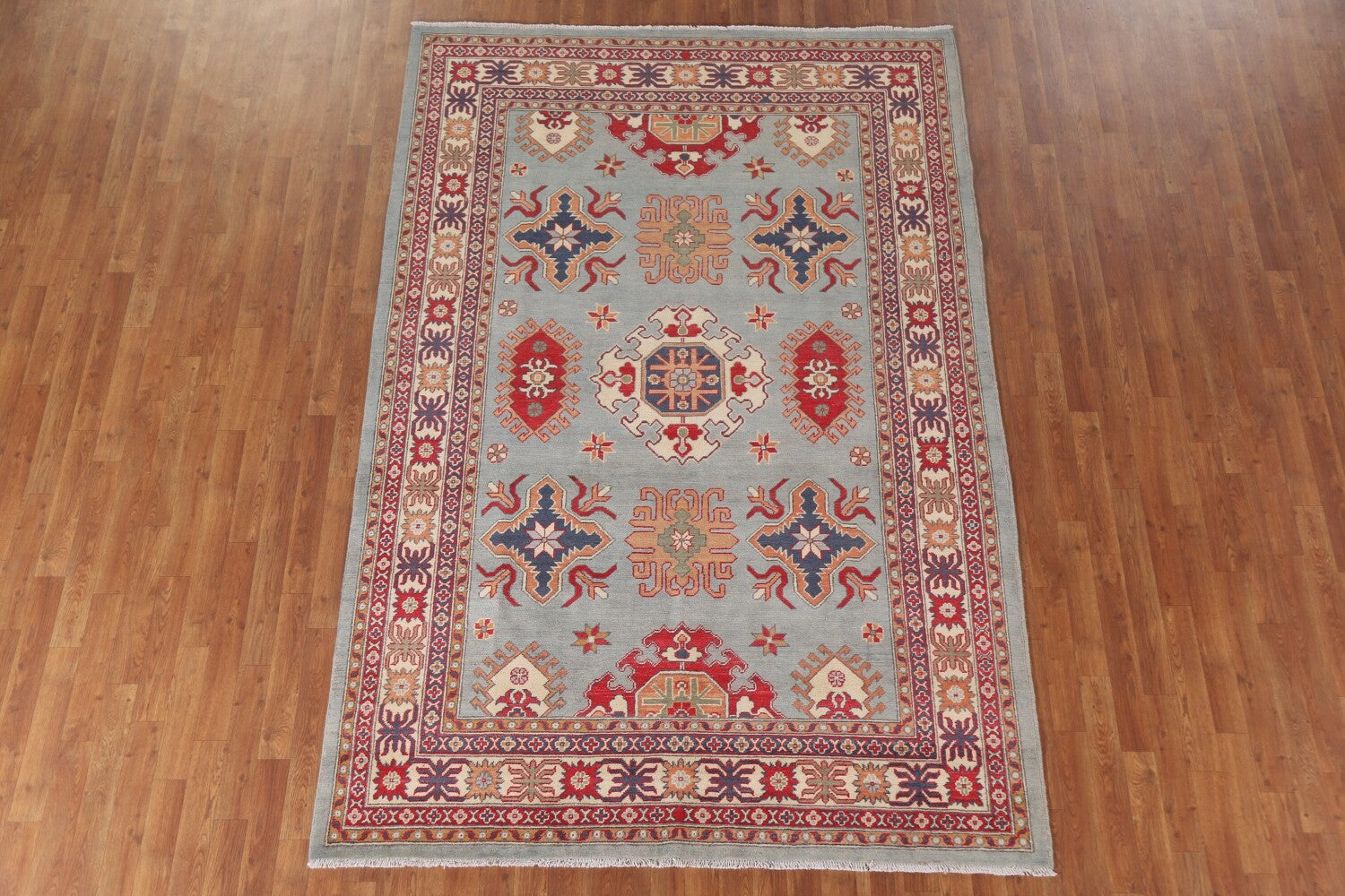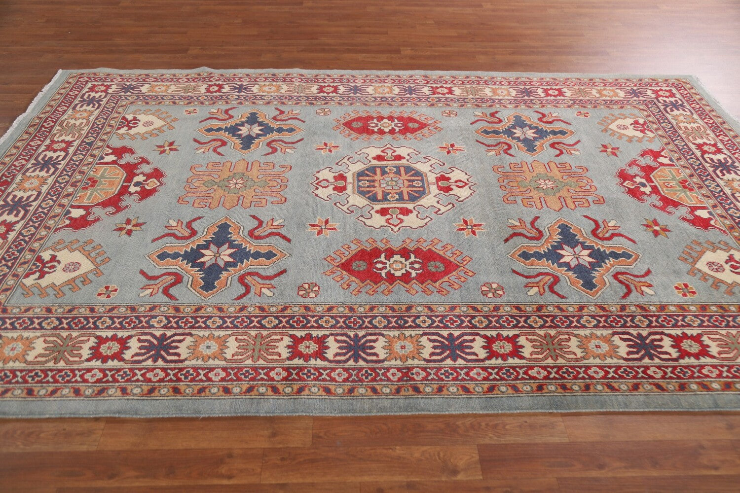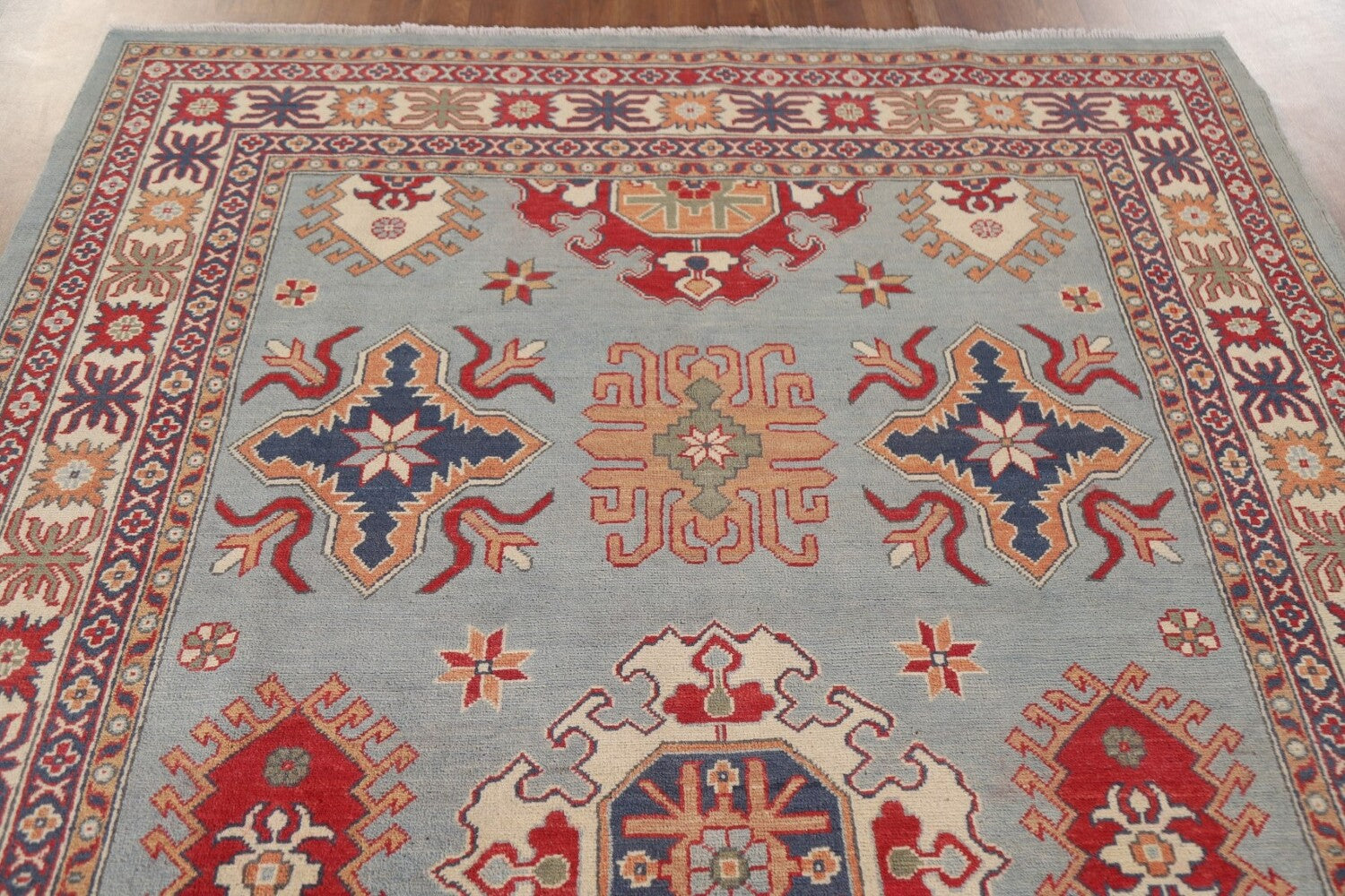 A Beautiful Genuine Pakistan Kazak rug is Hand Knotted by skillful weavers in Pakistan with 100% Wool Material. This rug is in New, First Quality condition. dimensions are 9' 1'' X 6' 1'' in foot and 277 X 185 in centimeter. the primary color is Navy Blue & Blues.