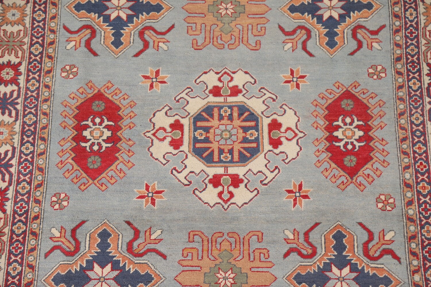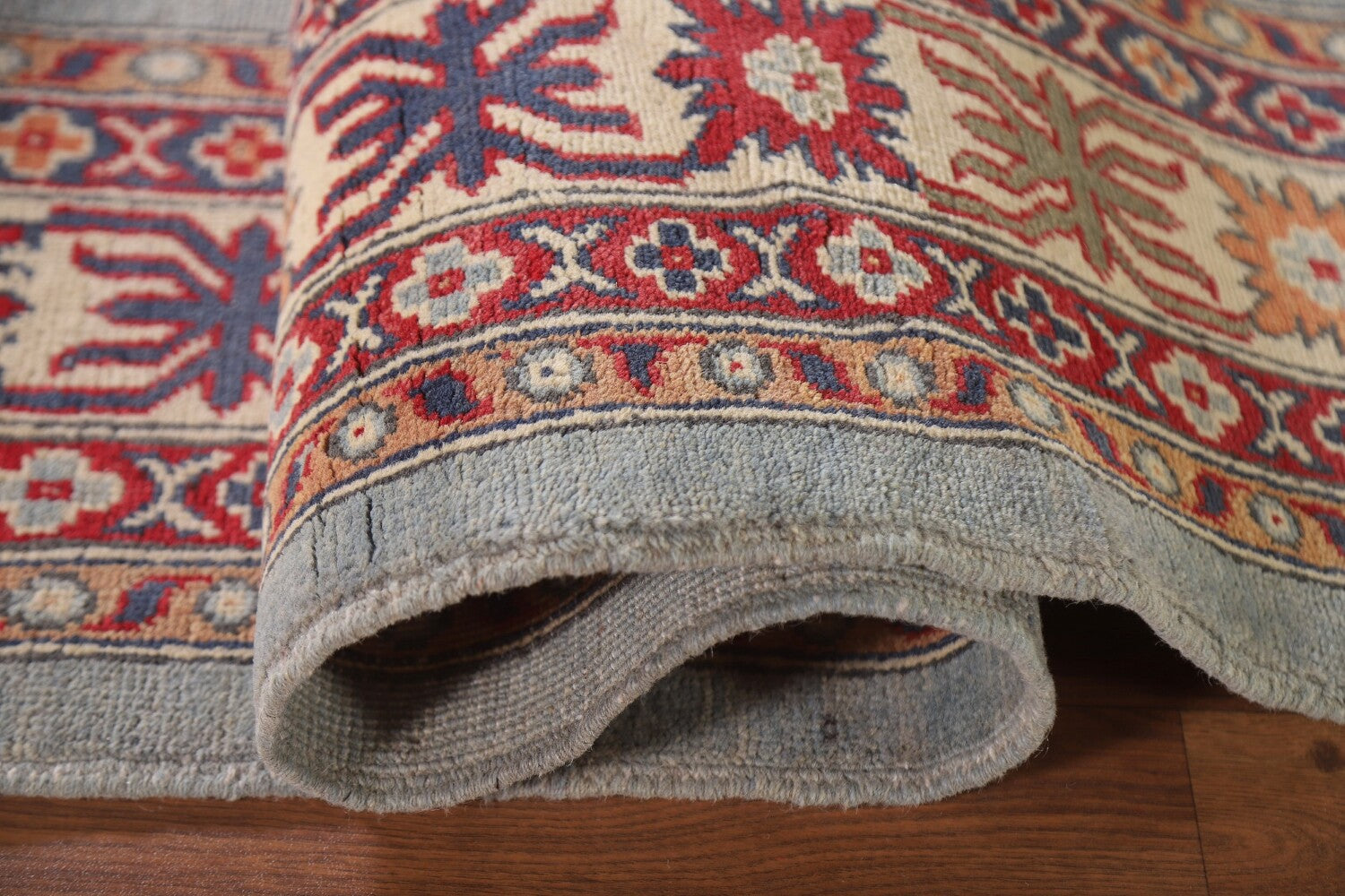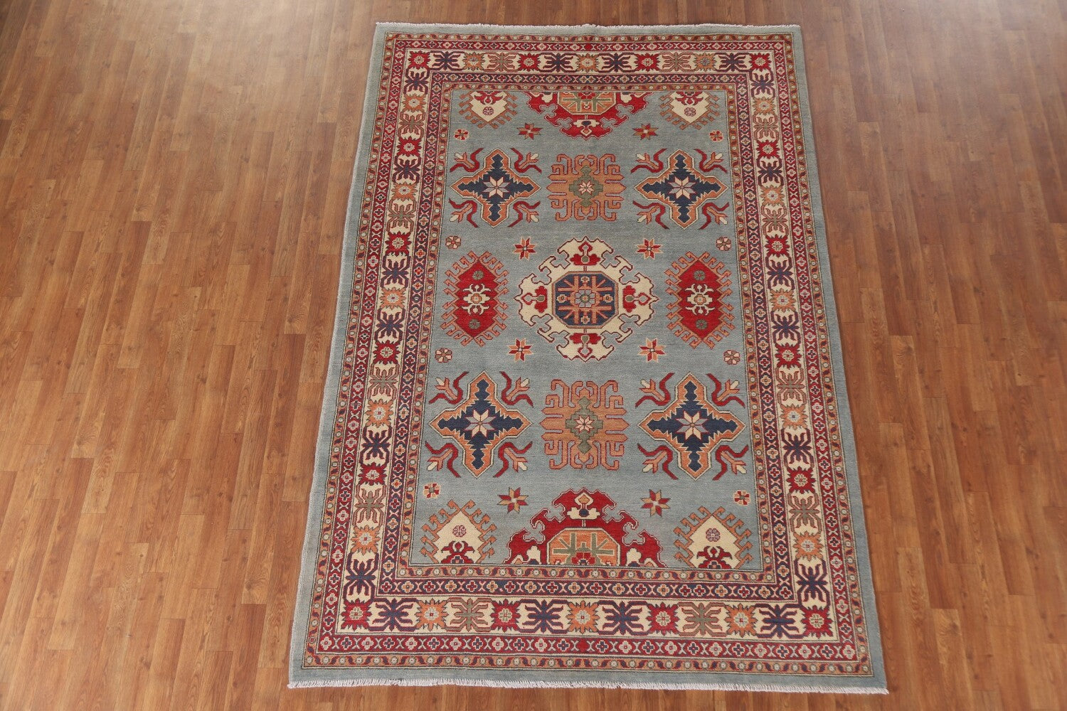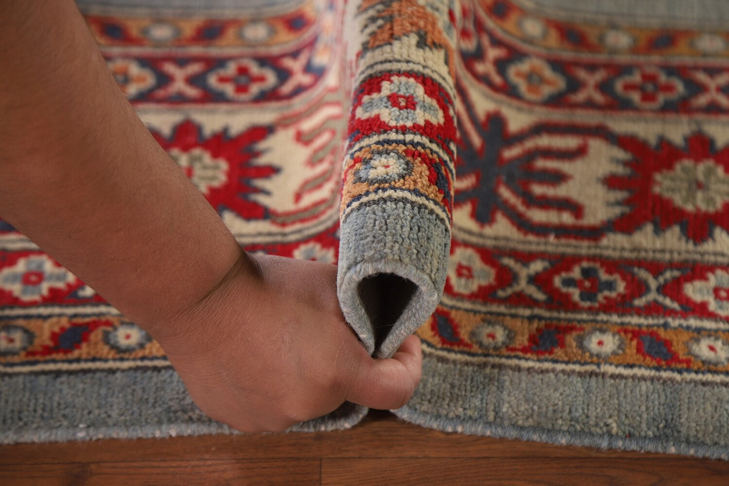 A Beautiful Genuine Pakistan Kazak rug is Hand Knotted by skillful weavers in Pakistan with 100% Wool Material. This rug is in New, First Quality condition. dimensions are 9' 1'' X 6' 1'' in foot and 277 X 185 in centimeter. the primary color is Navy Blue & Blues.