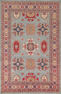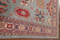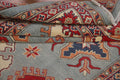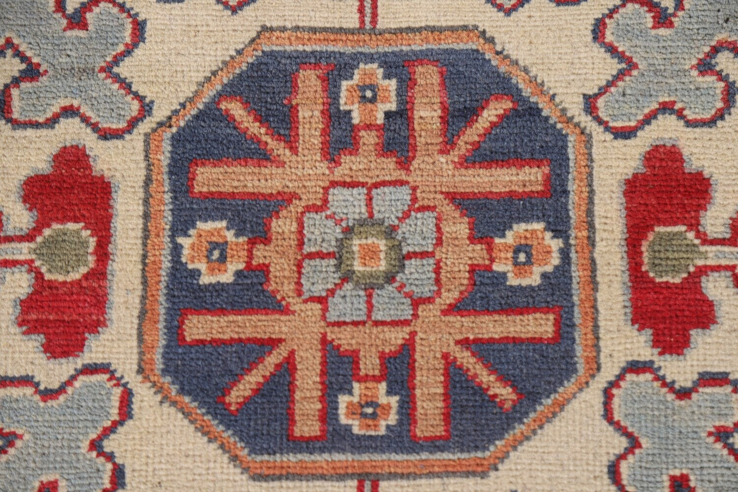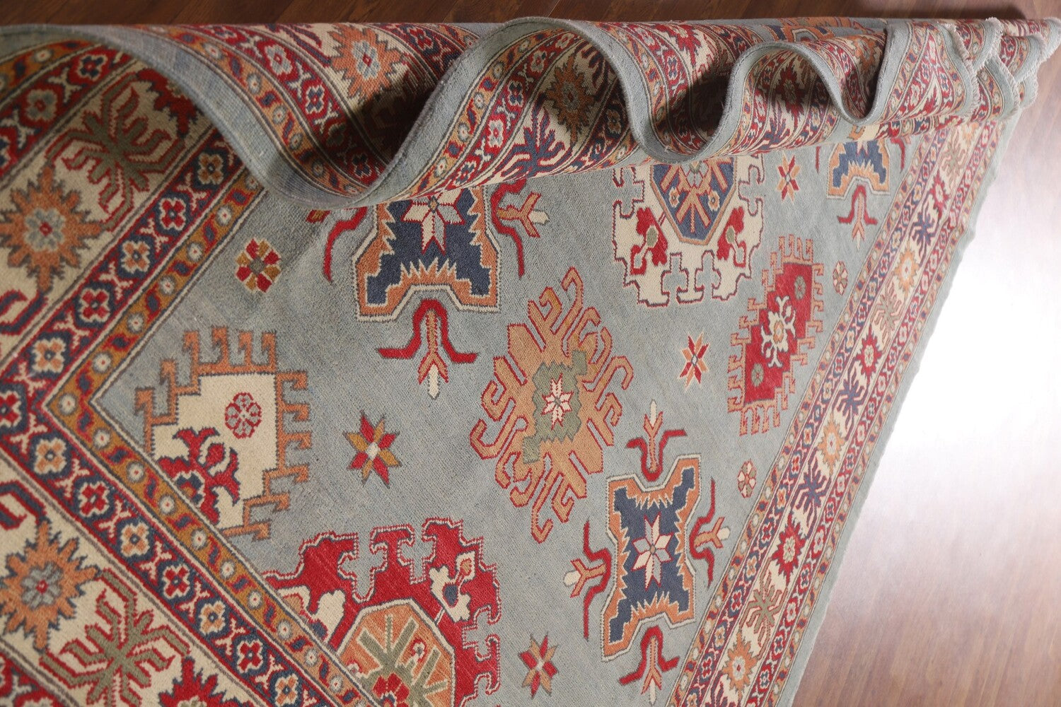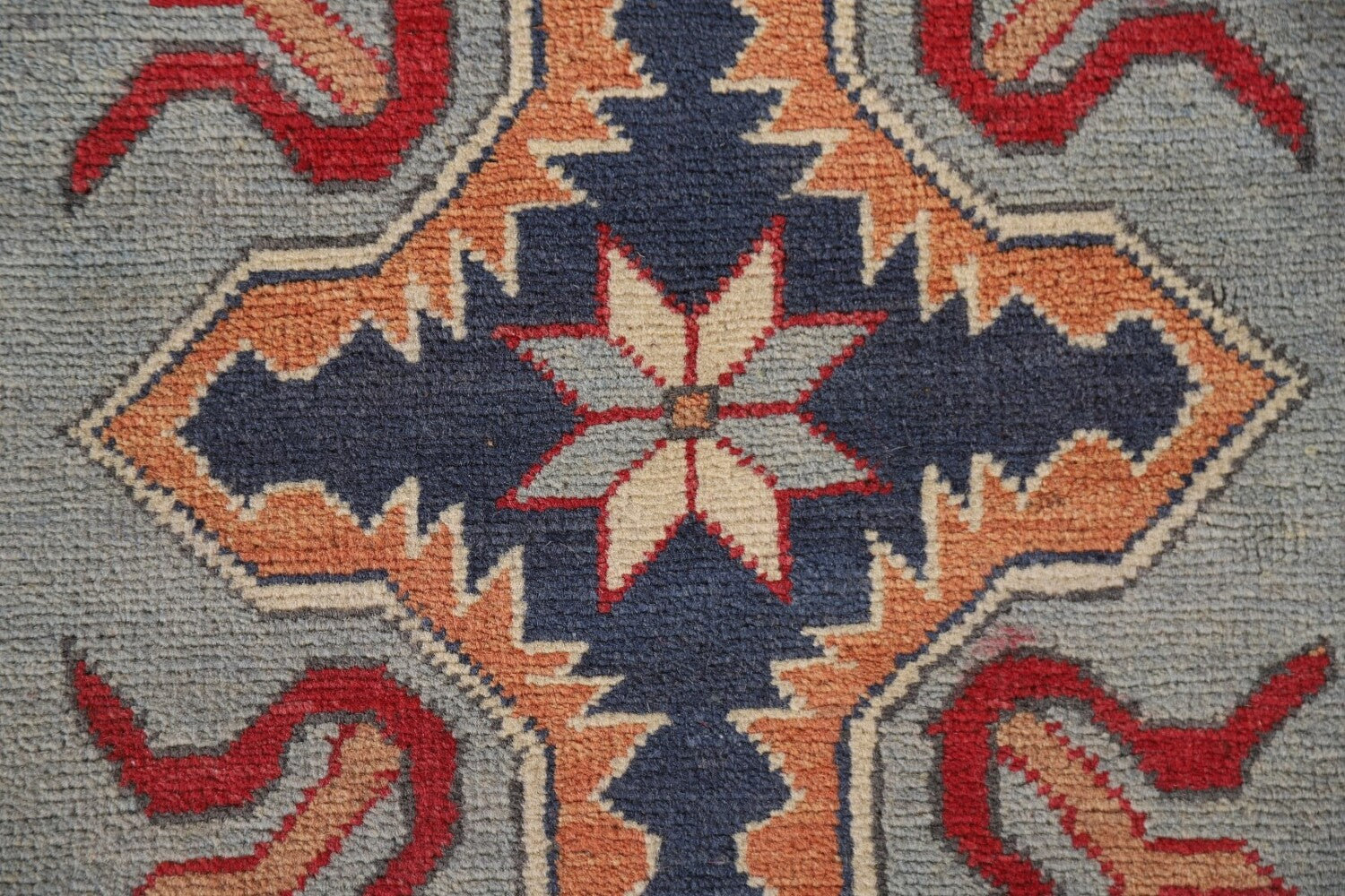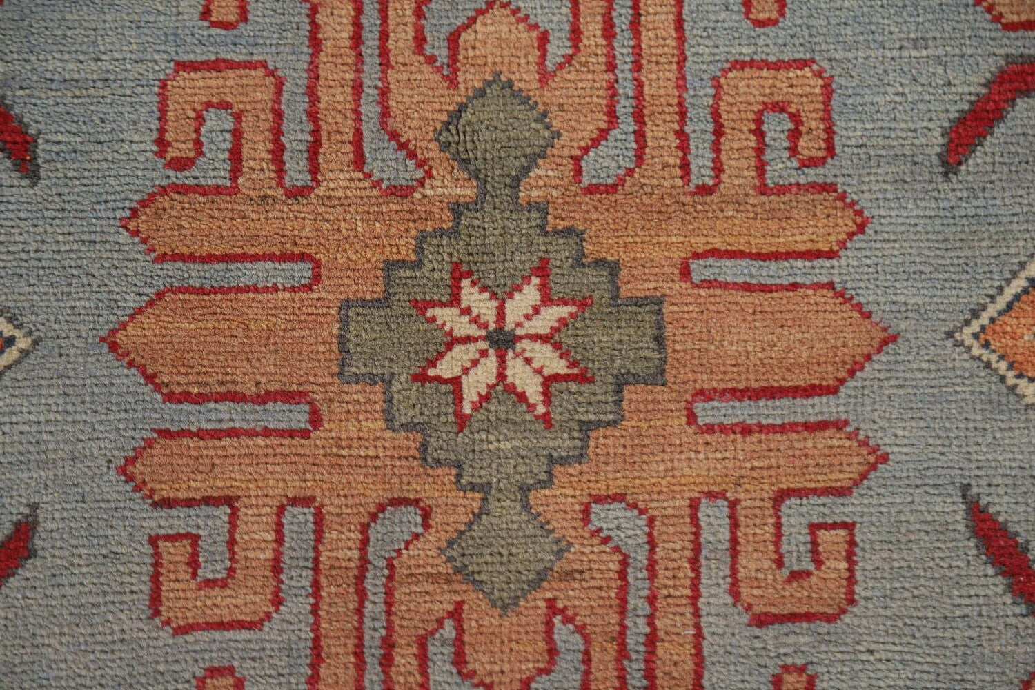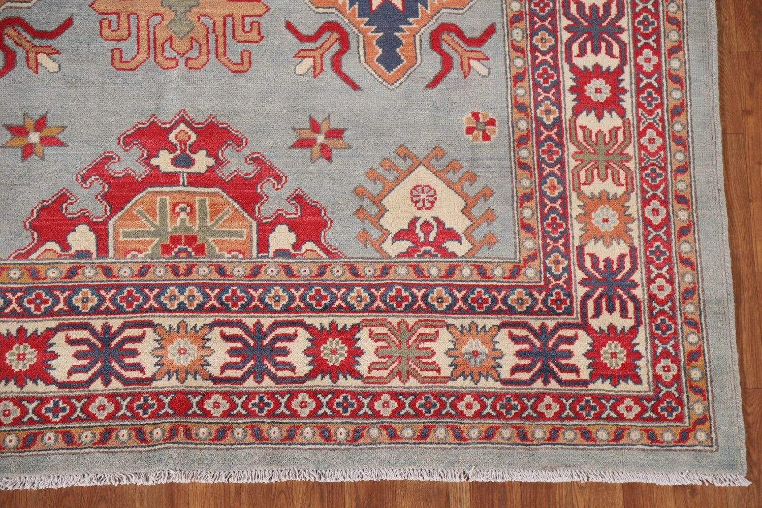 A Beautiful Genuine Pakistan Kazak rug is Hand Knotted by skillful weavers in Pakistan with 100% Wool Material. This rug is in New, First Quality condition. dimensions are 9' 1'' X 6' 1'' in foot and 277 X 185 in centimeter. the primary color is Navy Blue & Blues.
