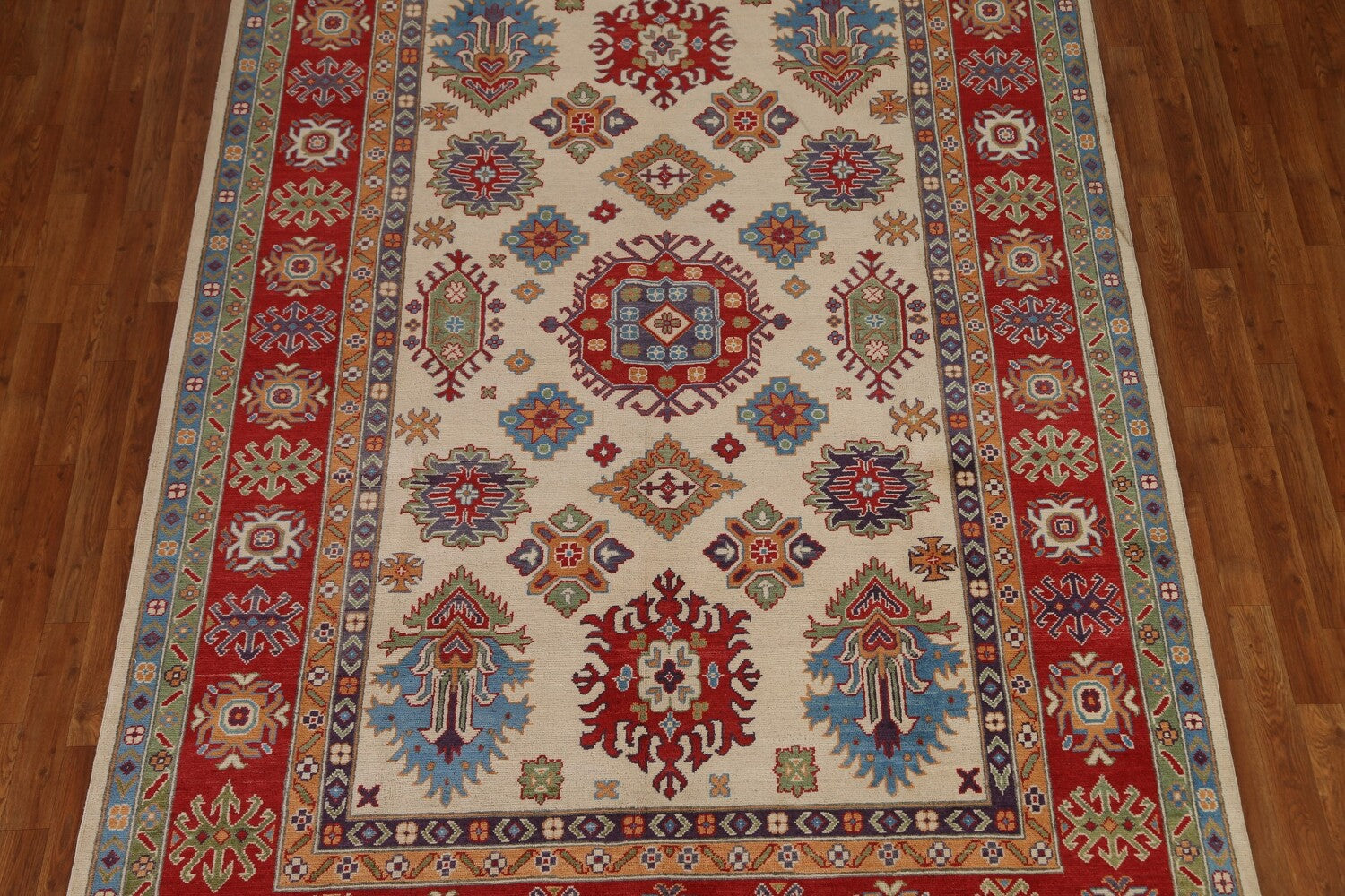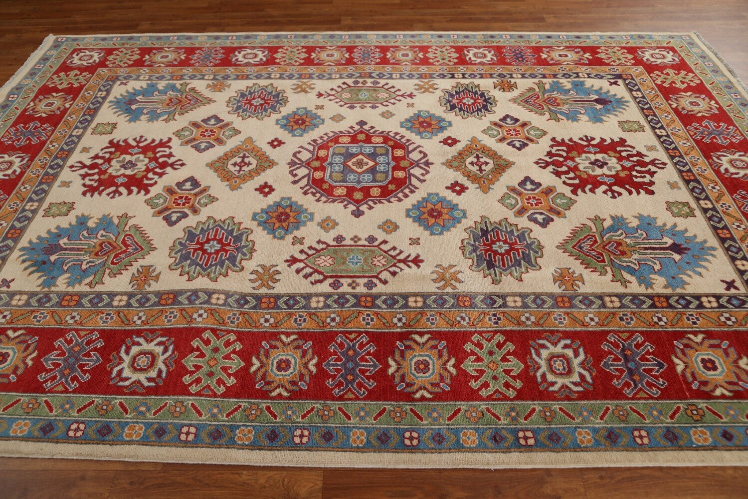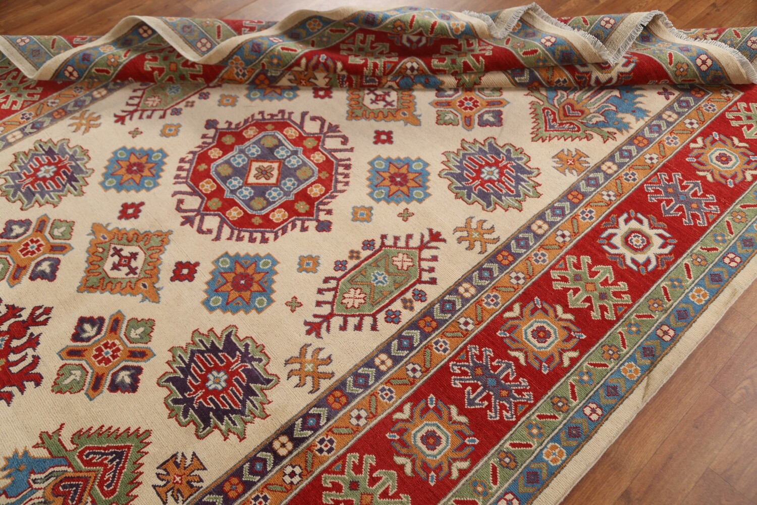 A Beautiful Genuine Pakistan Kazak rug is Hand Knotted by skillful weavers in Pakistan with 100% Wool Material. This rug is in New, First Quality condition. dimensions are 10' 0'' X 6' 9'' in foot and 305 X 206 in centimeter. the primary color is Beige & Ivories.