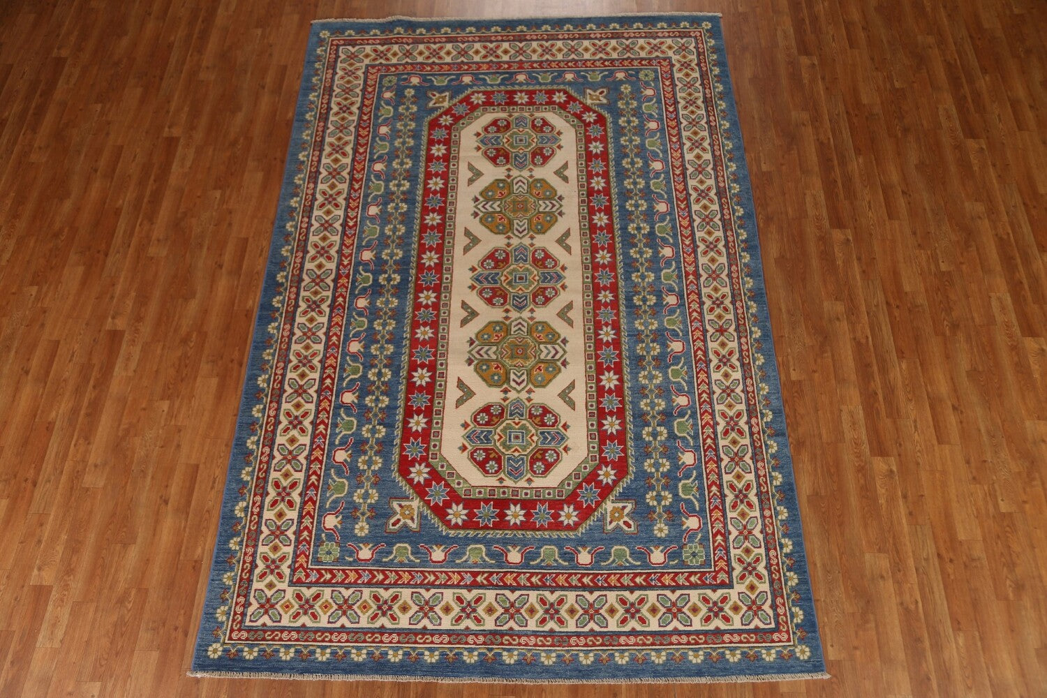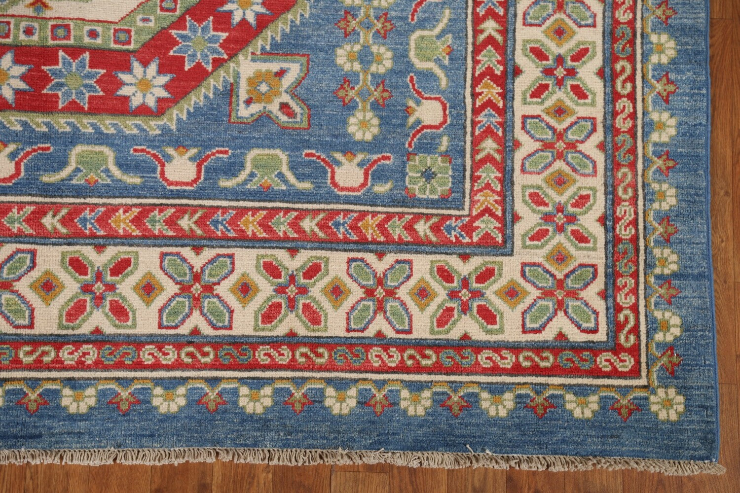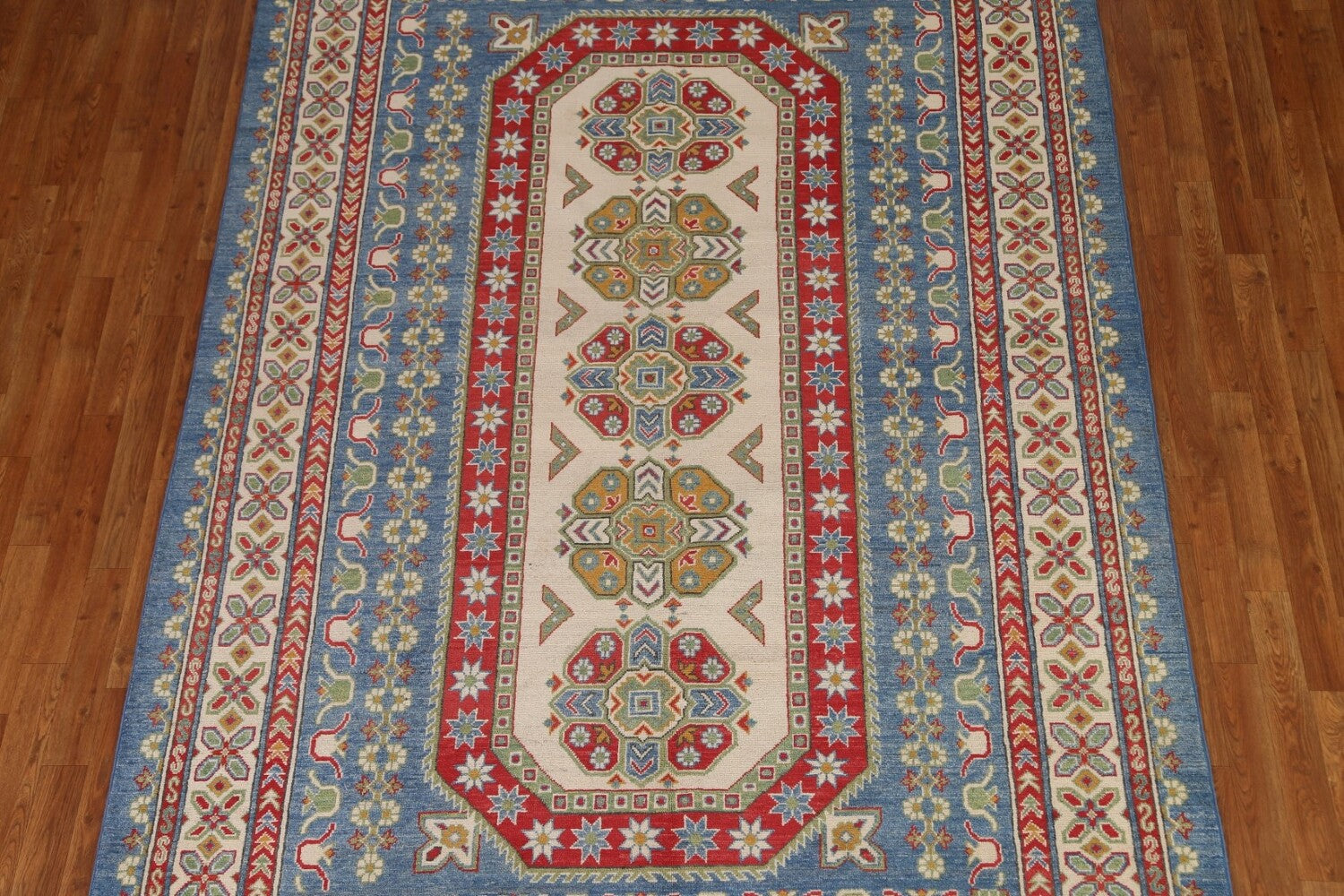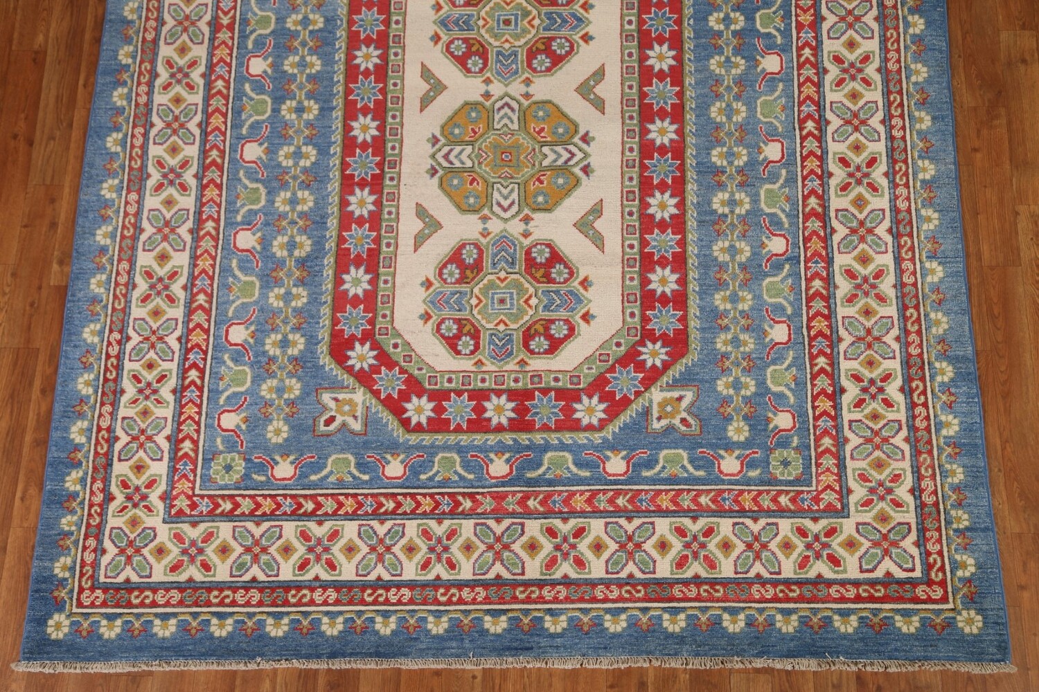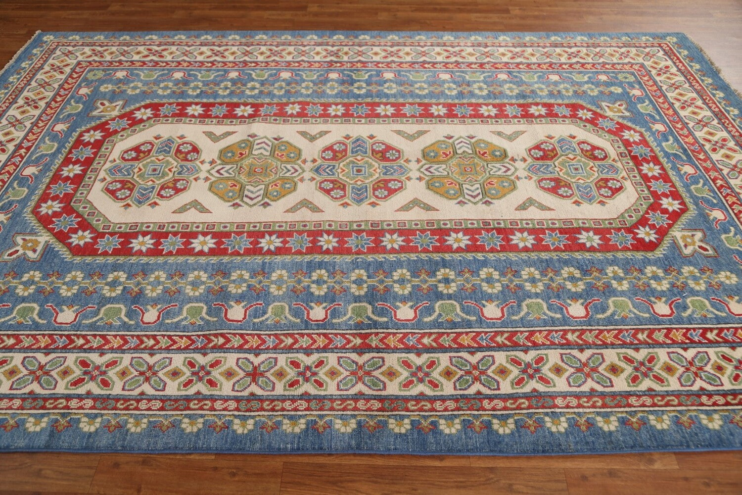 A Beautiful Genuine Pakistan Kazak rug is Hand Knotted by skillful weavers in Pakistan with 100% Wool Material. This rug is in New, First Quality condition. dimensions are 10' 0'' X 6' 7'' in foot and 305 X 201 in centimeter. the primary color is Navy Blue & Blues.