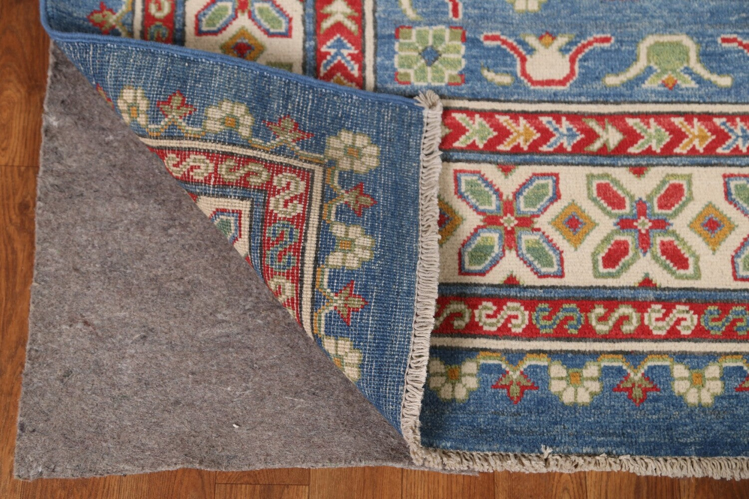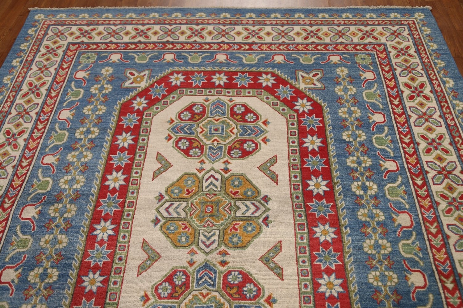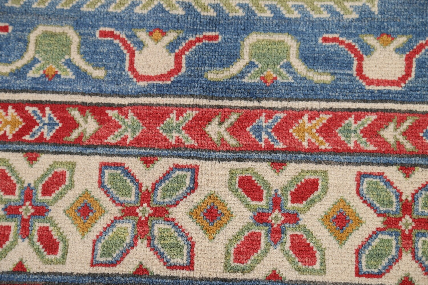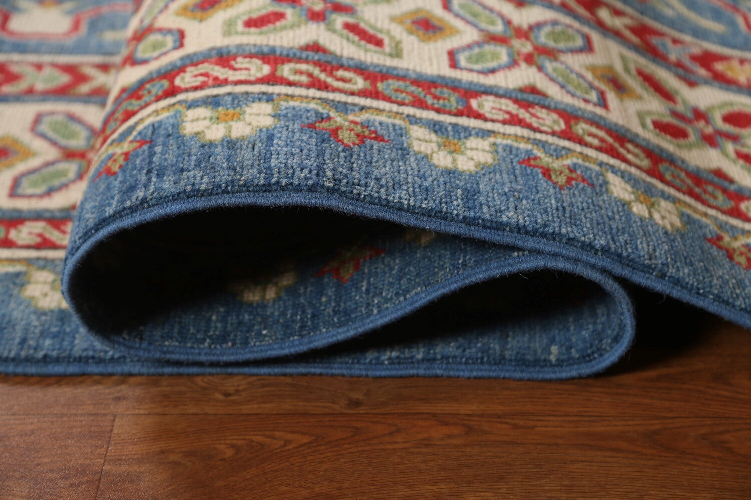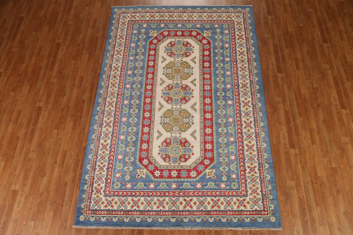 A Beautiful Genuine Pakistan Kazak rug is Hand Knotted by skillful weavers in Pakistan with 100% Wool Material. This rug is in New, First Quality condition. dimensions are 10' 0'' X 6' 7'' in foot and 305 X 201 in centimeter. the primary color is Navy Blue & Blues.