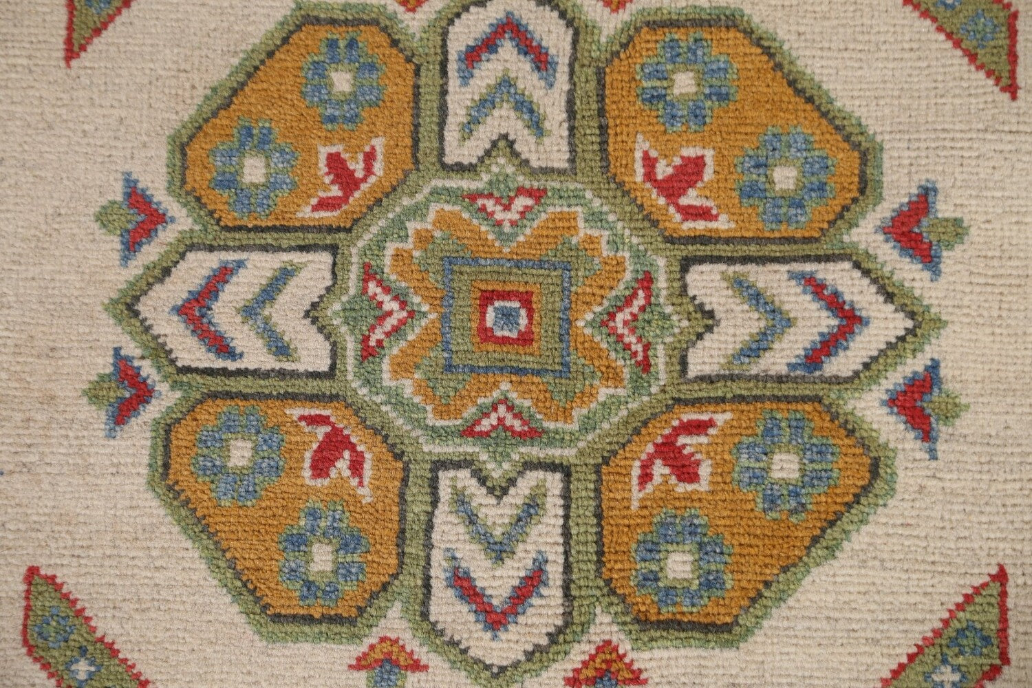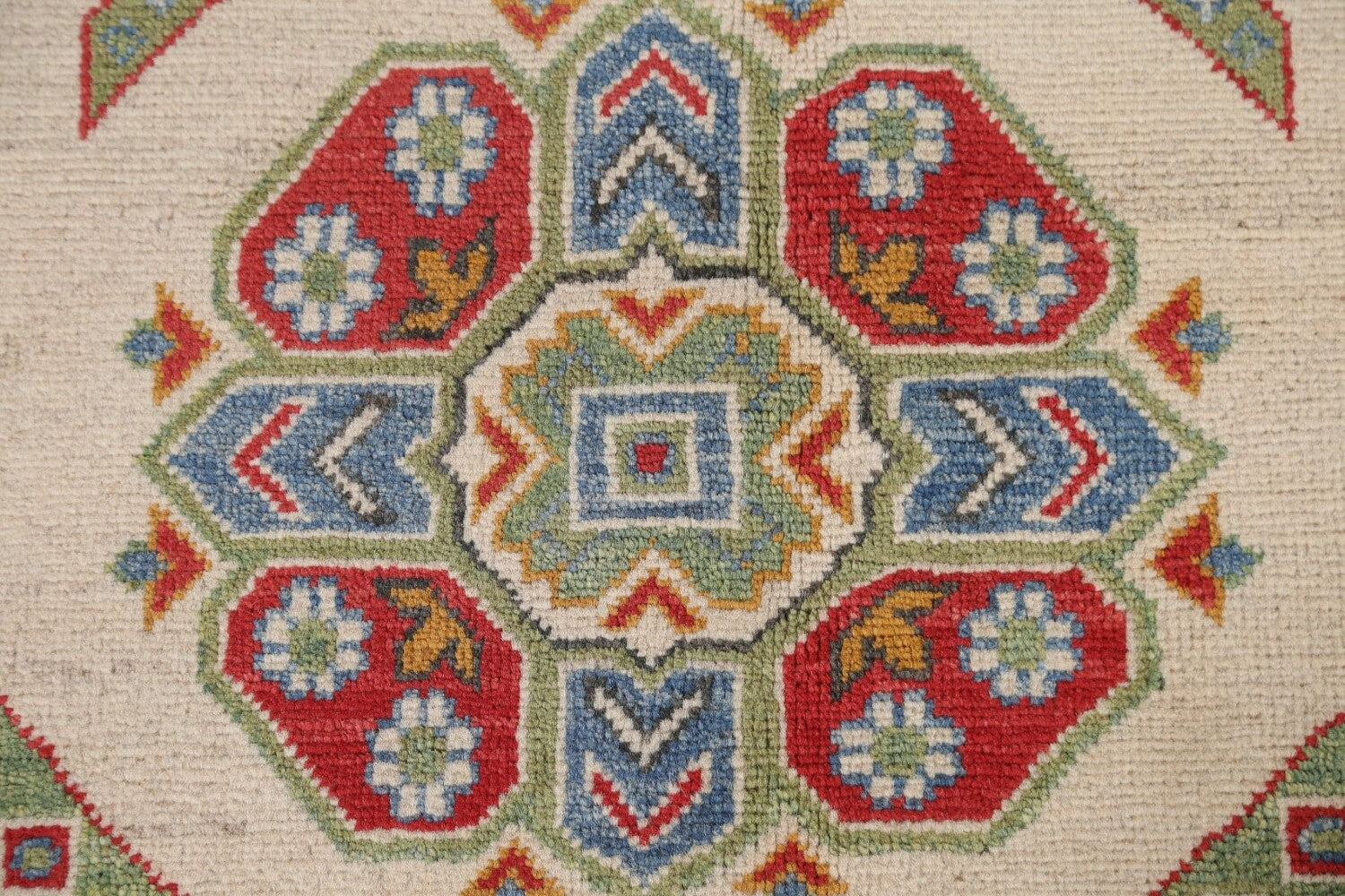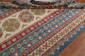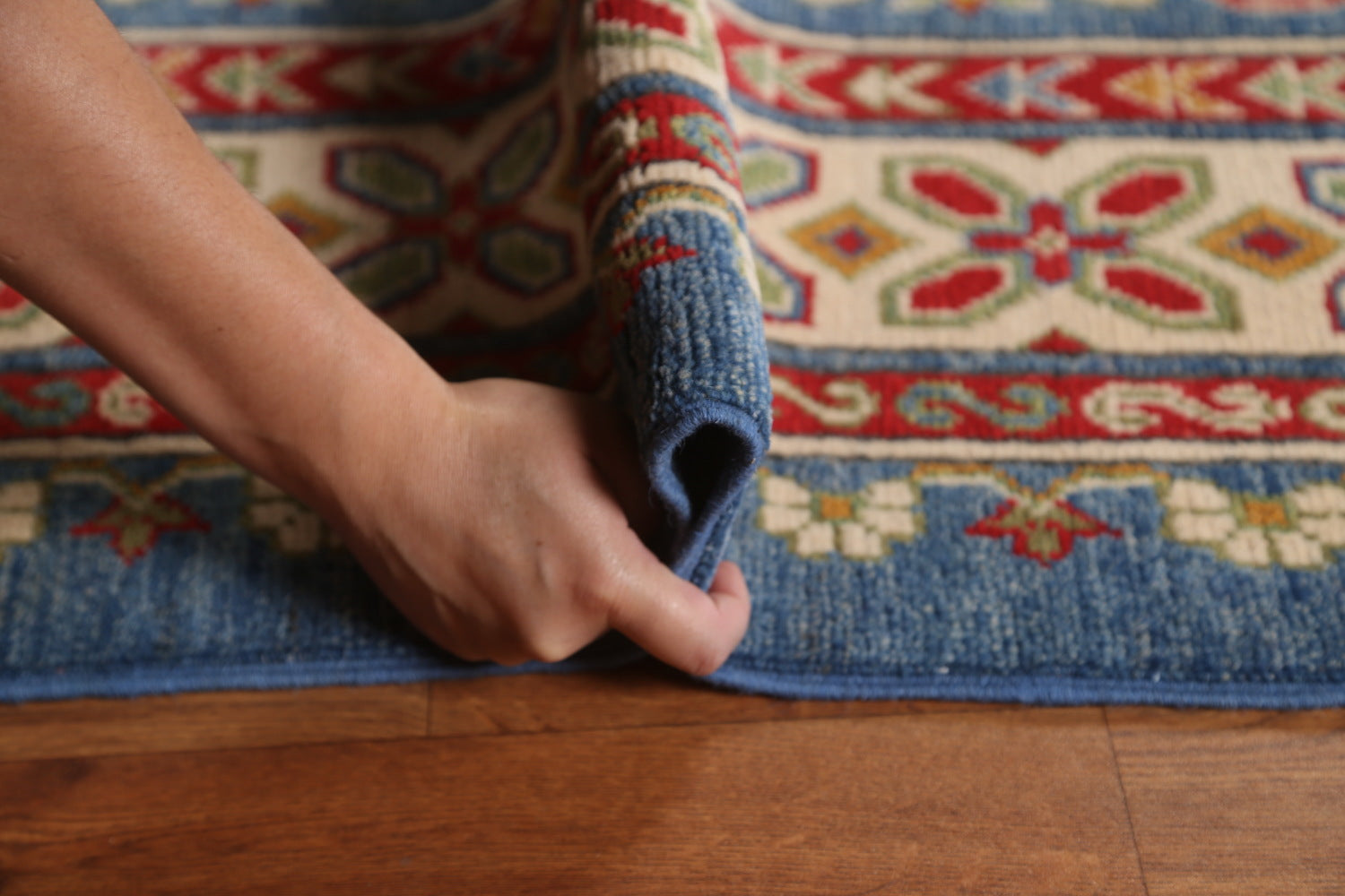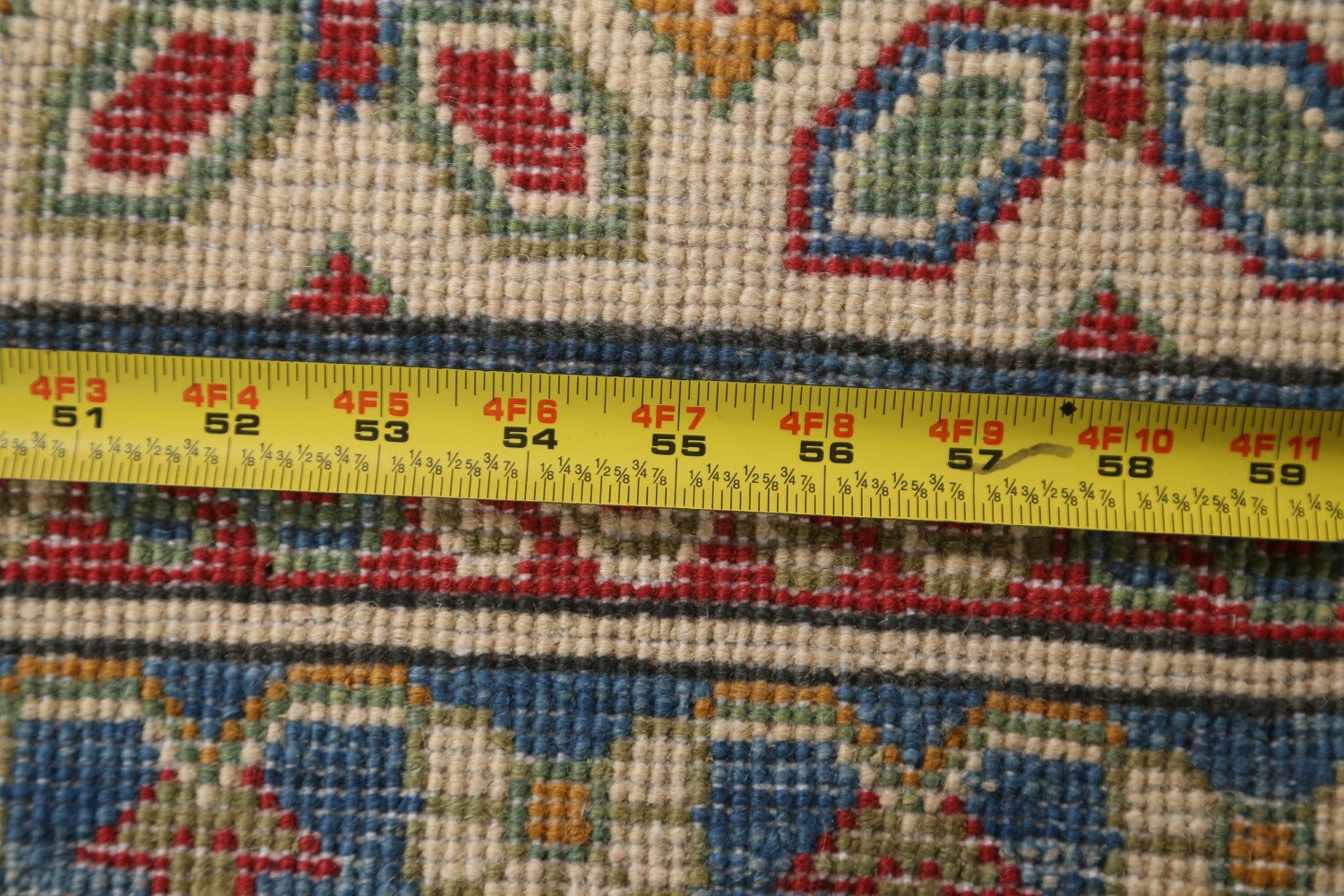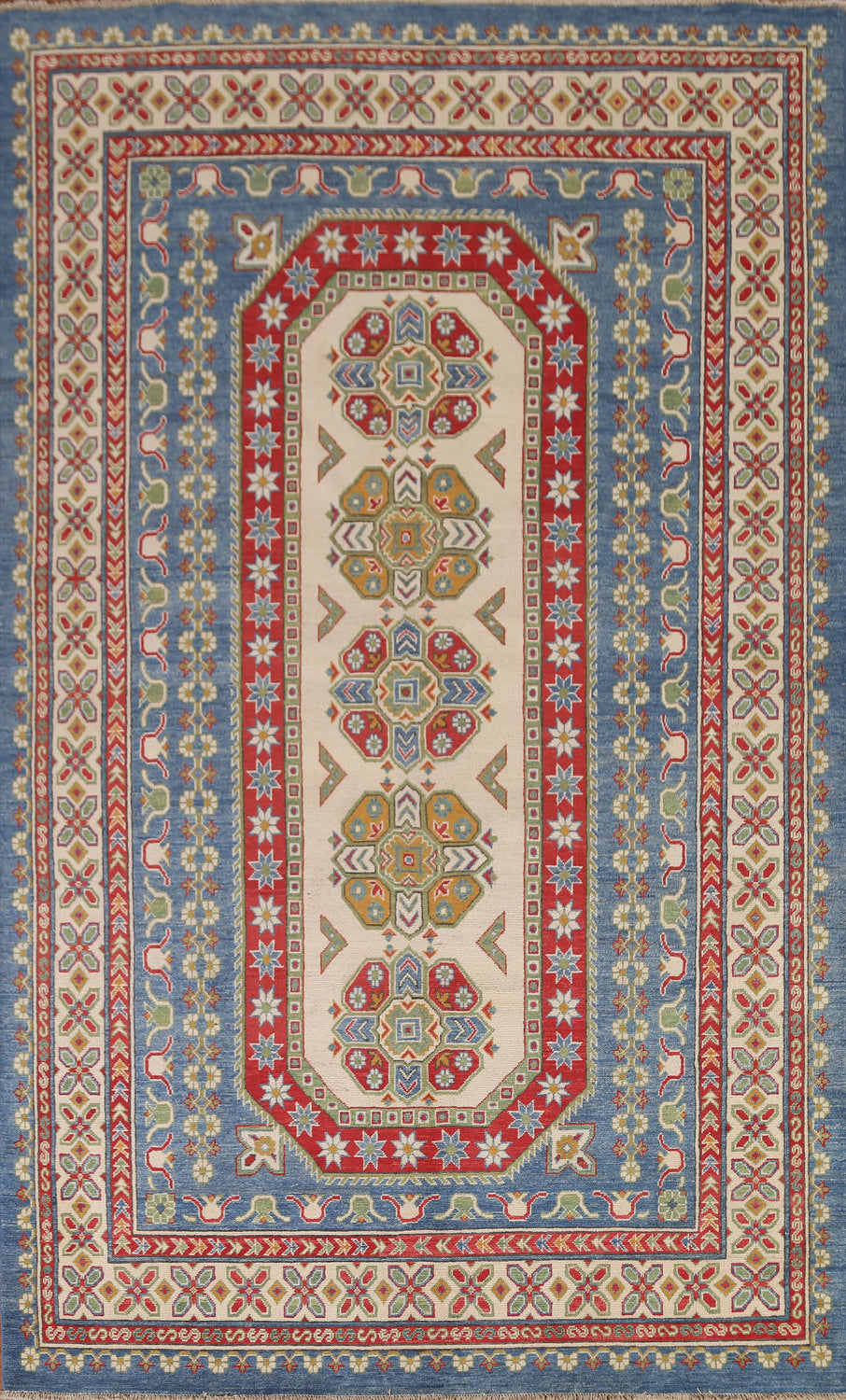 A Beautiful Genuine Pakistan Kazak rug is Hand Knotted by skillful weavers in Pakistan with 100% Wool Material. This rug is in New, First Quality condition. dimensions are 10' 0'' X 6' 7'' in foot and 305 X 201 in centimeter. the primary color is Navy Blue & Blues.