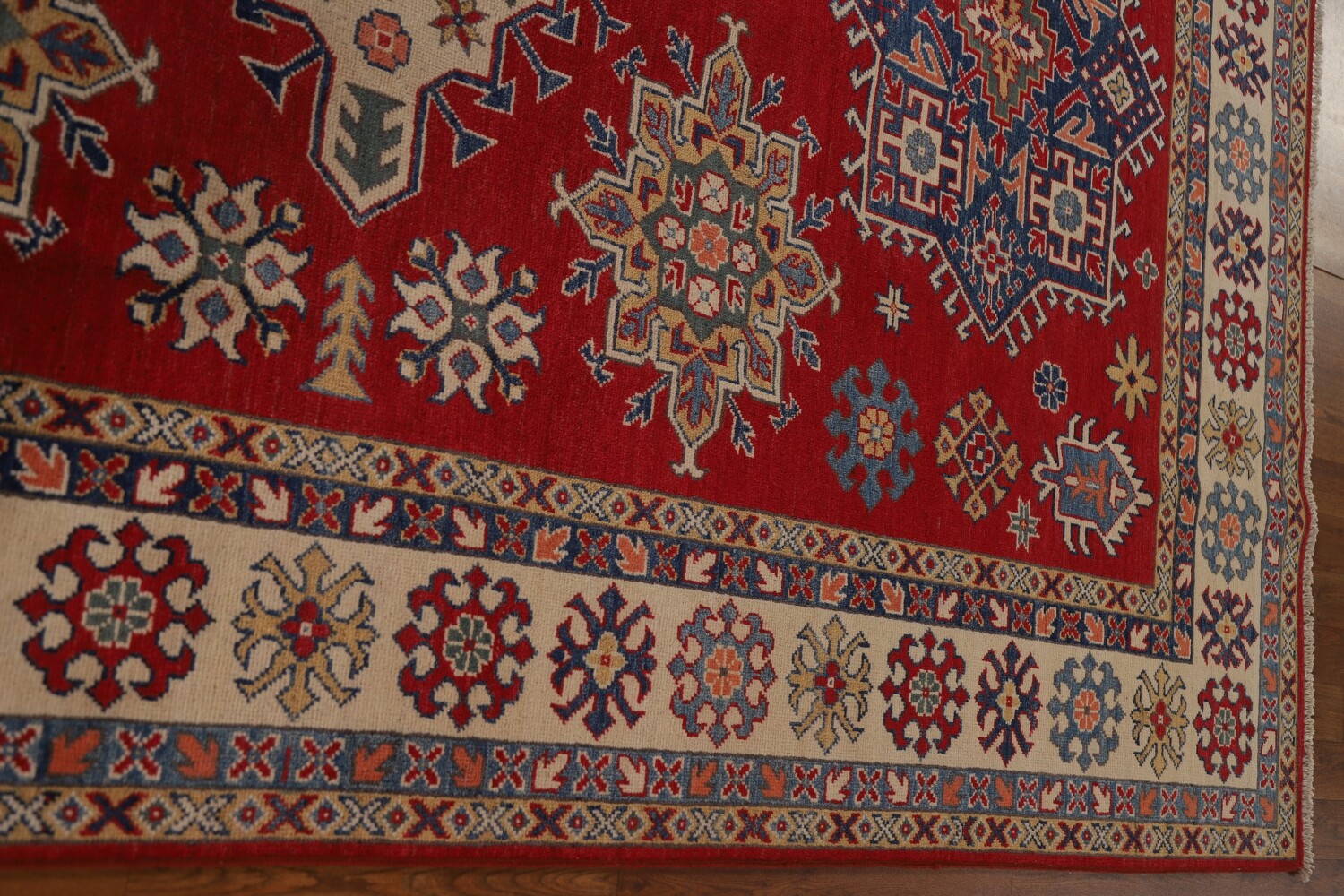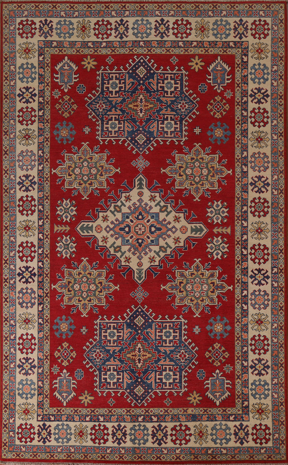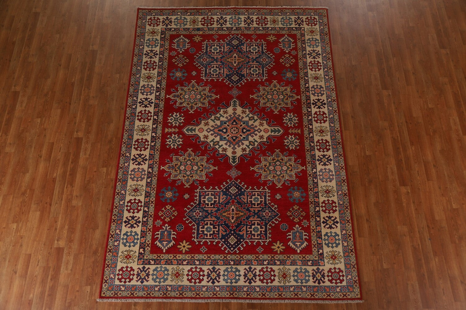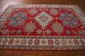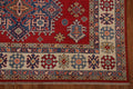 A Beautiful Genuine Pakistan Kazak rug is Hand Knotted by skillful weavers in Pakistan with 100% Wool Material. This rug is in New, First Quality condition. dimensions are 9' 9'' X 6' 7'' in foot and 297 X 201 in centimeter. the primary color is Red.