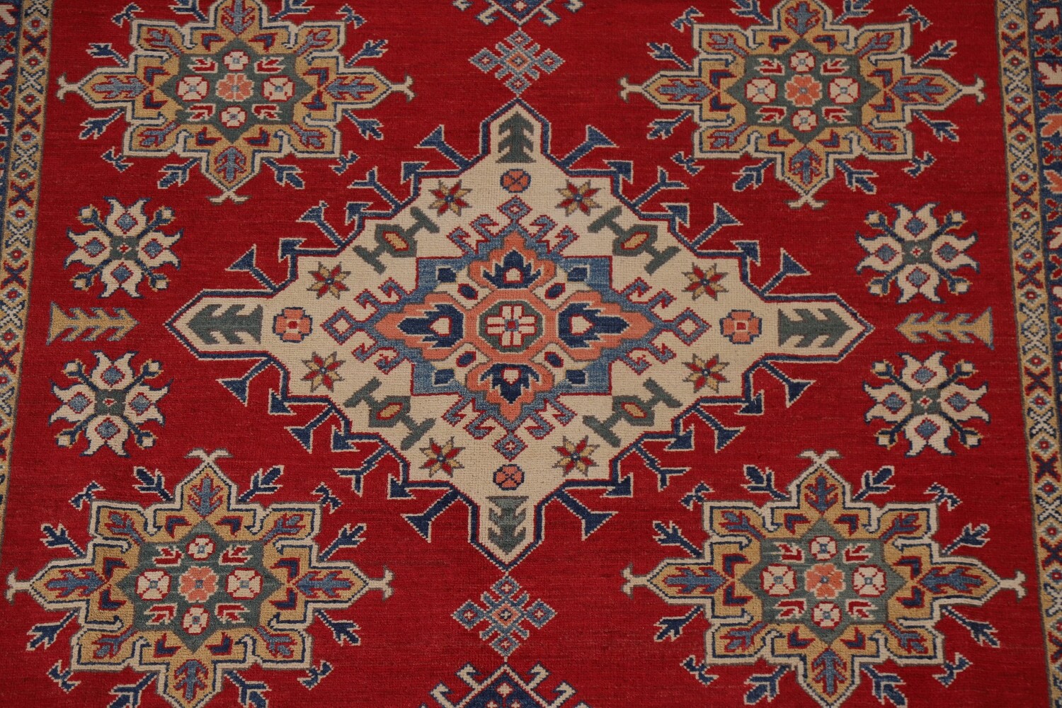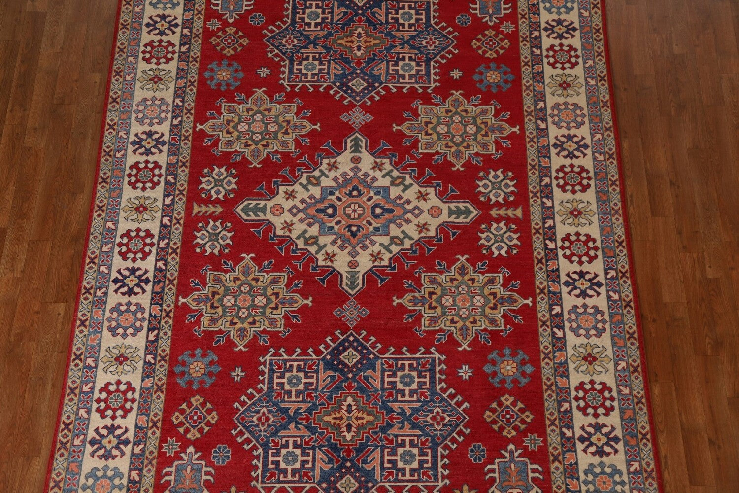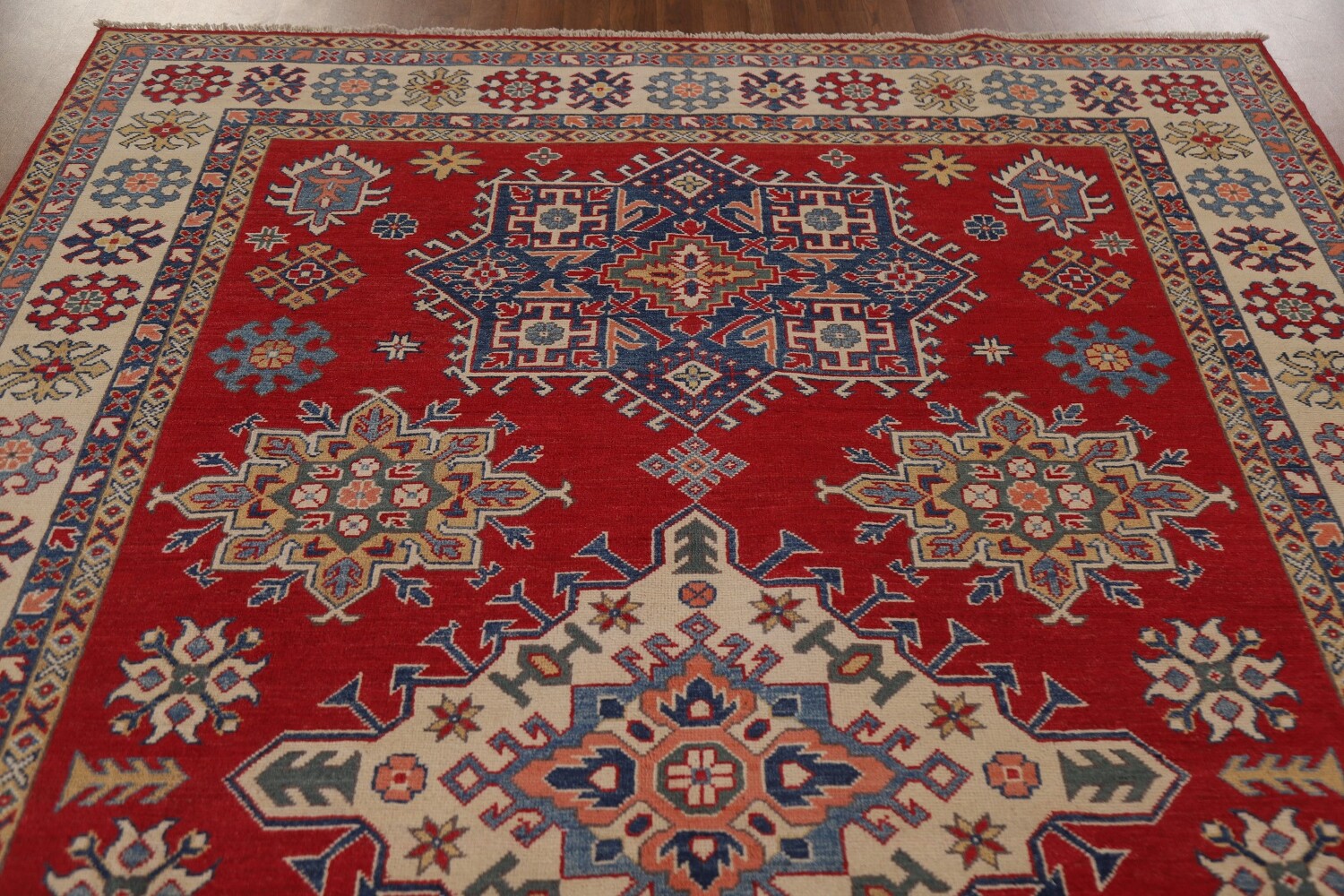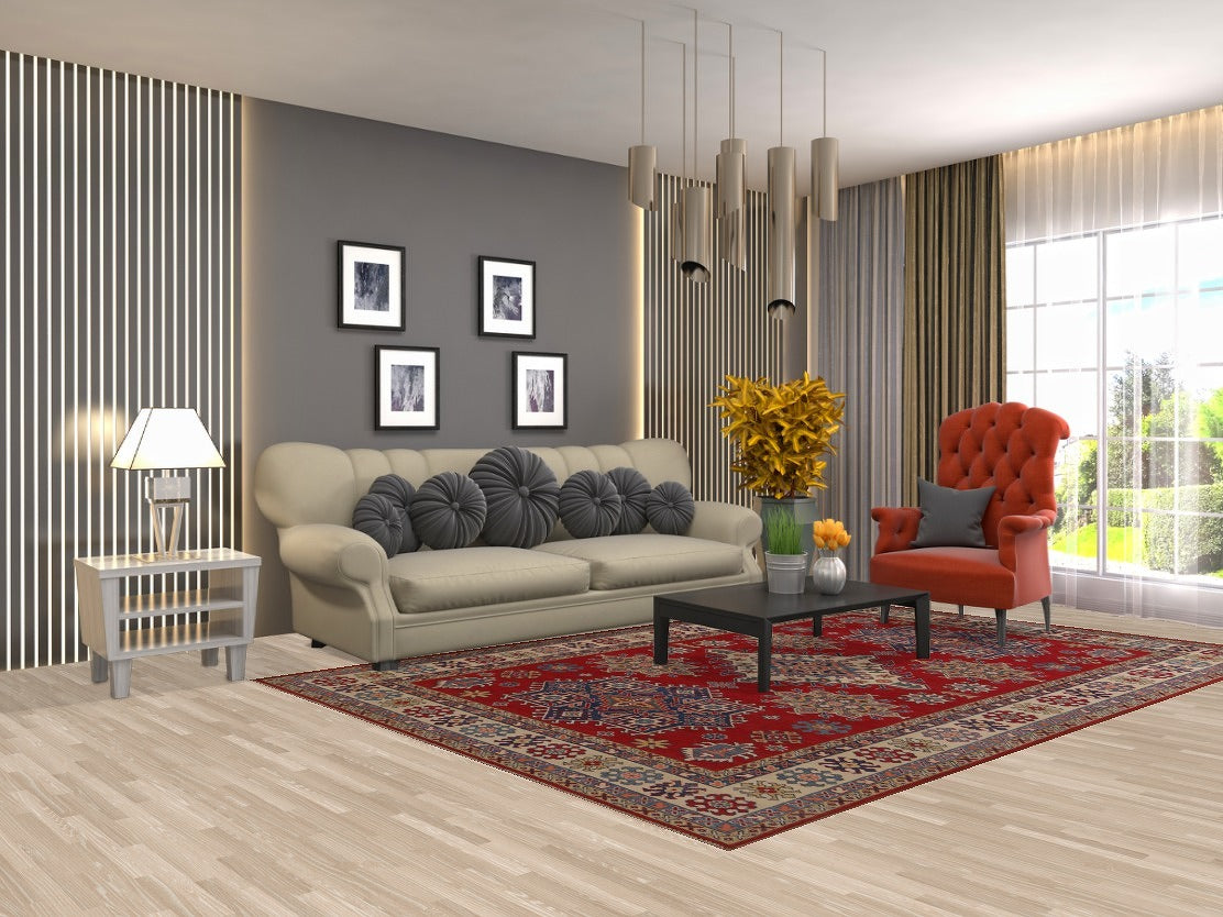 A Beautiful Genuine Pakistan Kazak rug is Hand Knotted by skillful weavers in Pakistan with 100% Wool Material. This rug is in New, First Quality condition. dimensions are 9' 9'' X 6' 7'' in foot and 297 X 201 in centimeter. the primary color is Red.