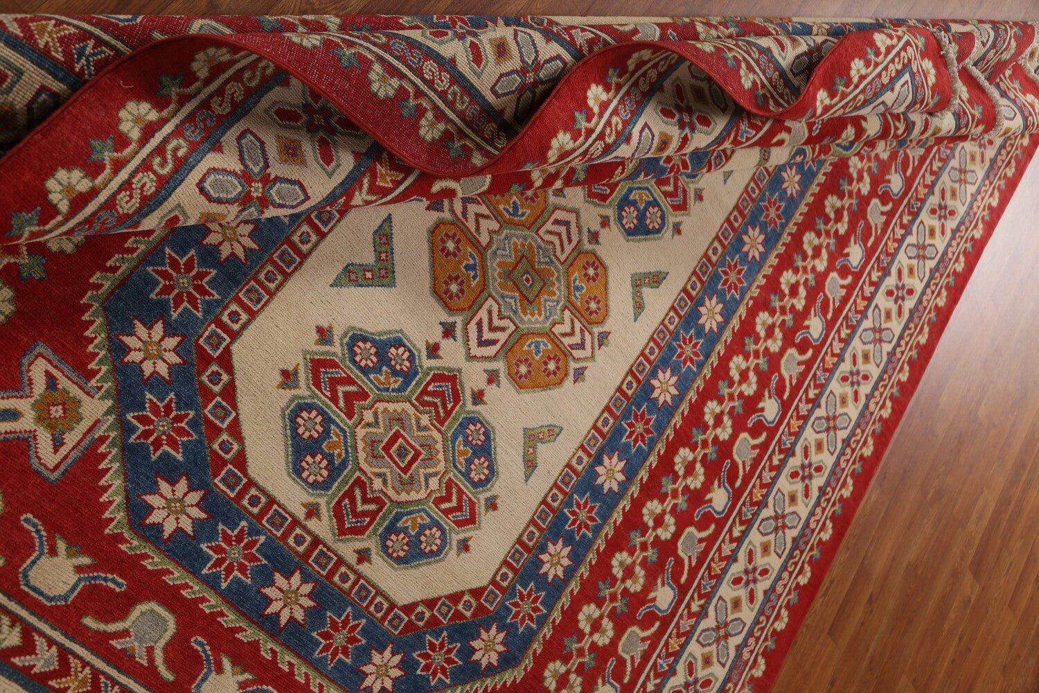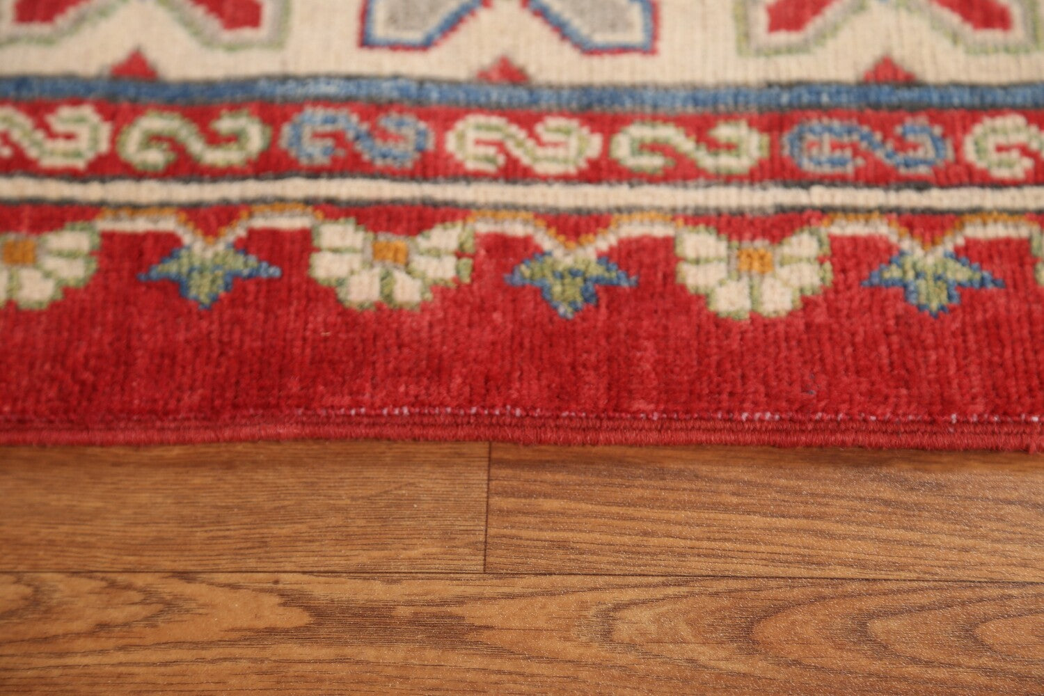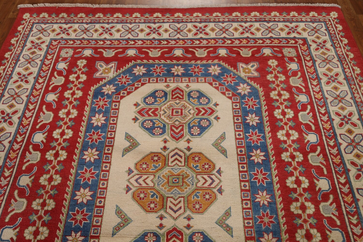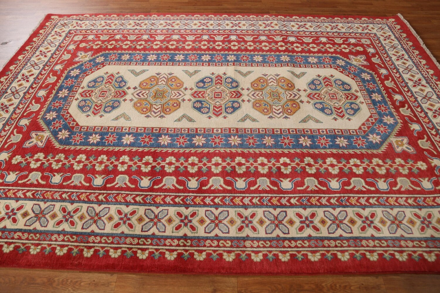 A Beautiful Genuine Pakistan Kazak rug is Hand Knotted by skillful weavers in Pakistan with 100% Wool Material. This rug is in condition. dimensions are 9' 8'' X 6' 11'' in foot and 295 X 211 in centimeter. the primary color is Red.