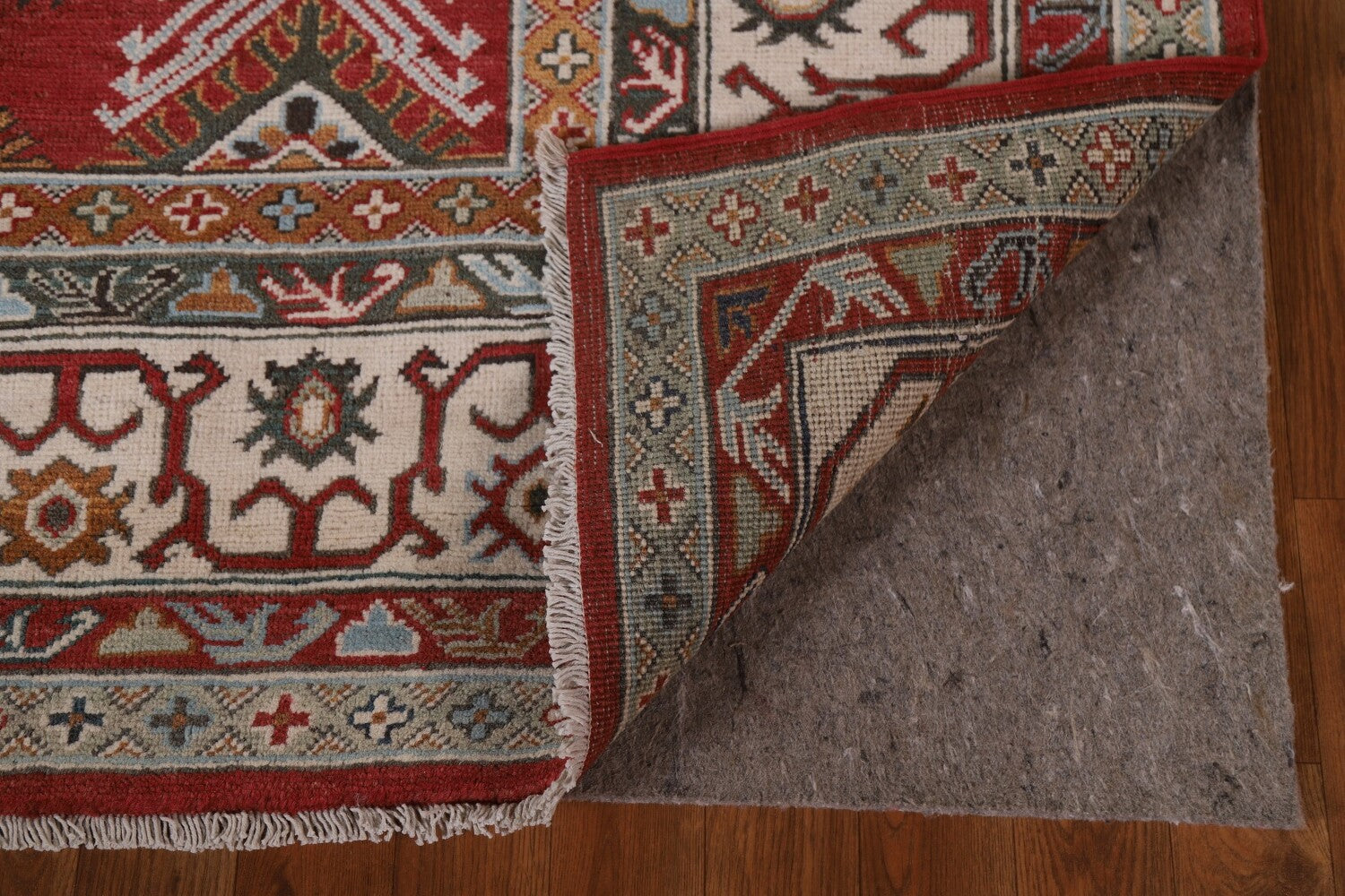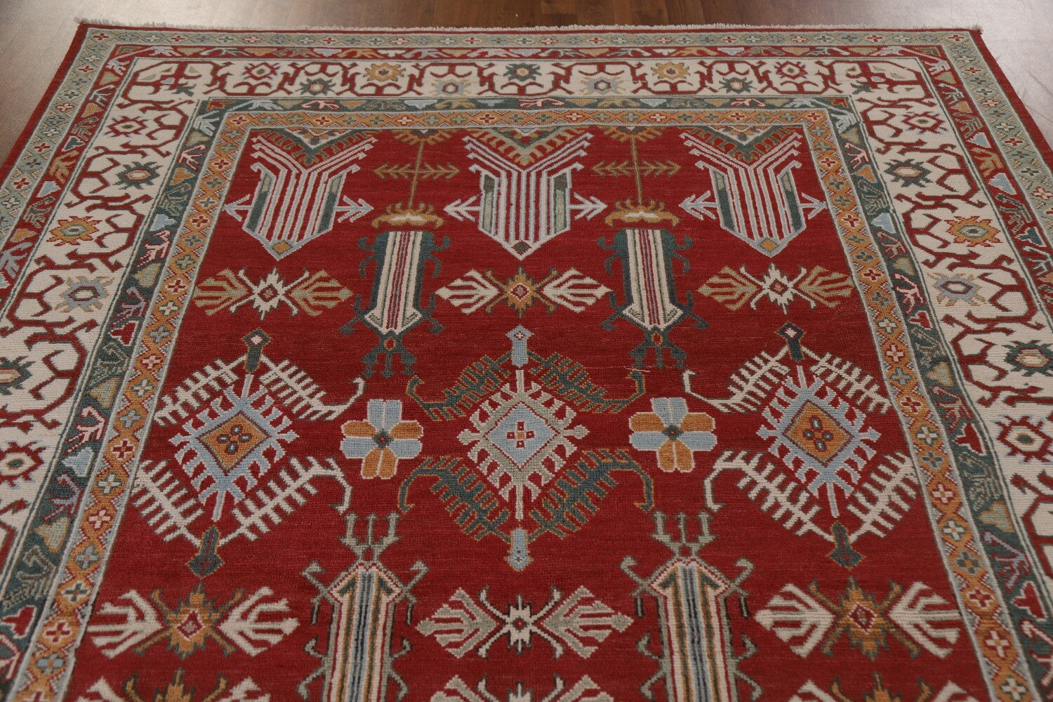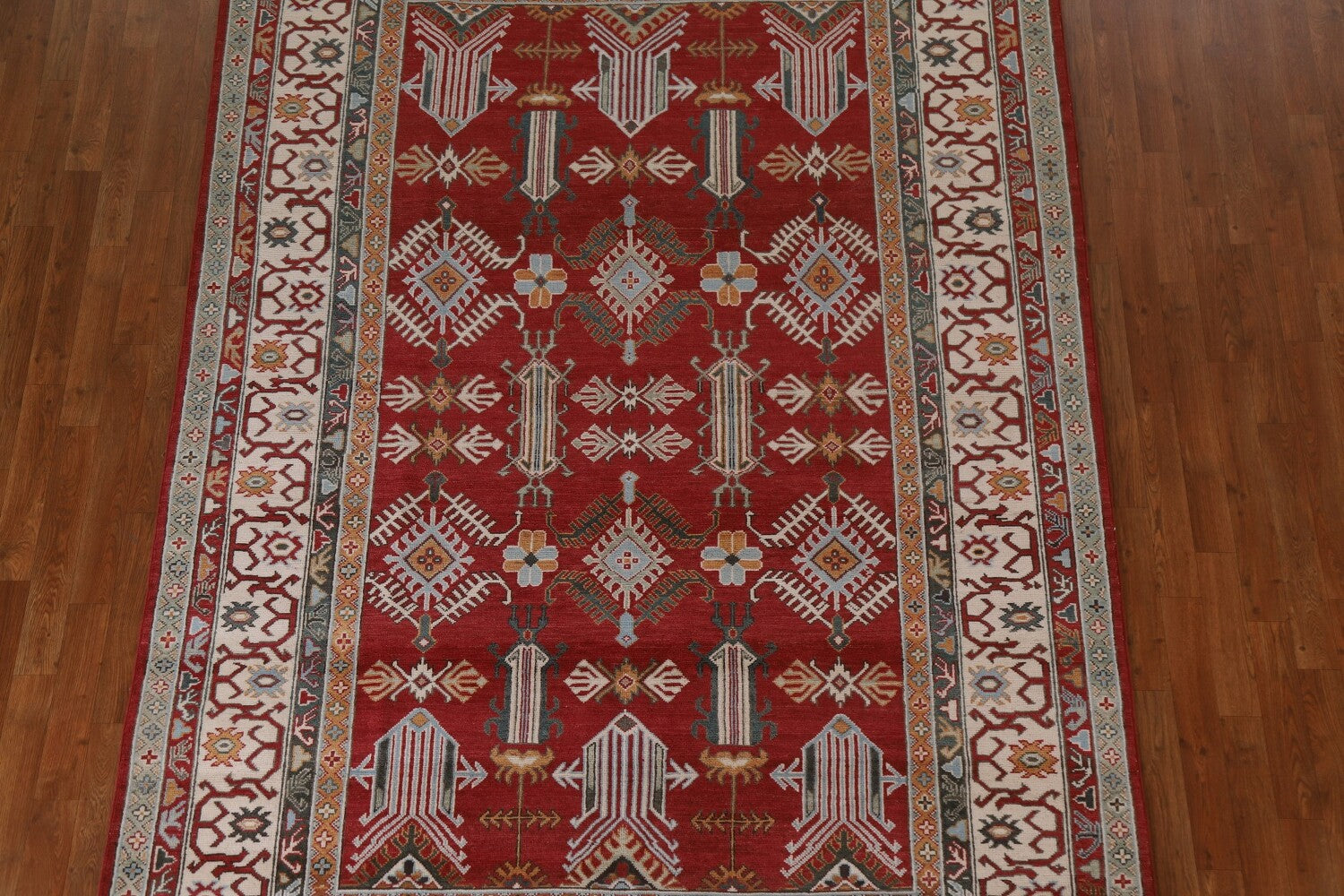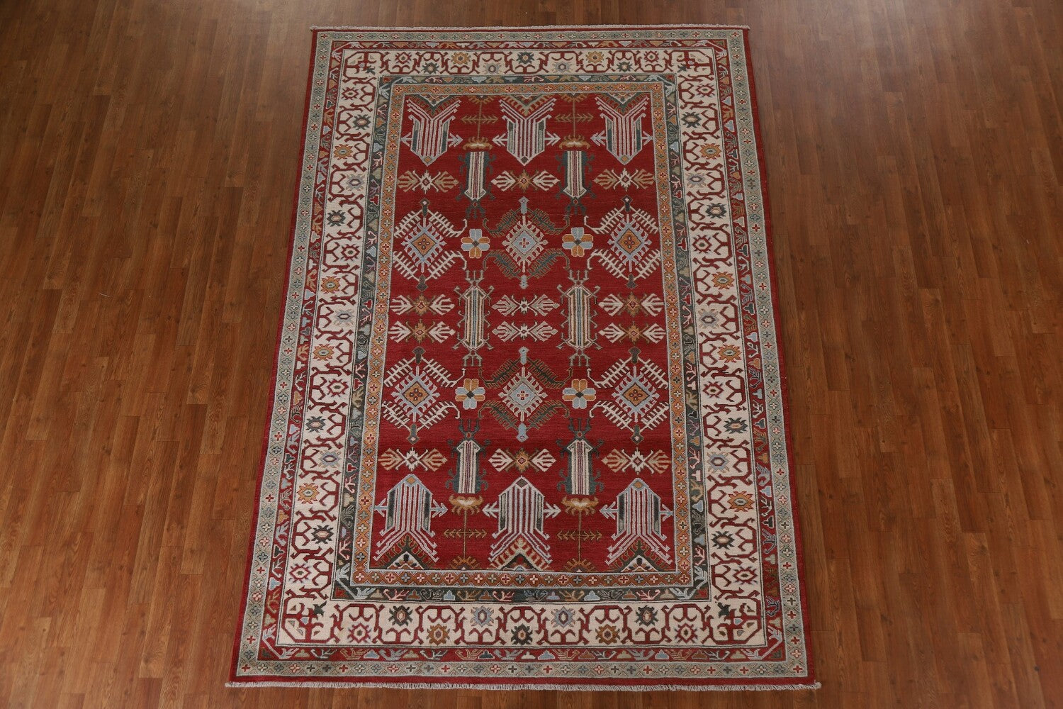 A Beautiful Genuine Pakistan Kazak rug is Hand Knotted by skillful weavers in Pakistan with 100% Wool Material. This rug is in condition. dimensions are 9' 6'' X 6' 6'' in foot and 290 X 198 in centimeter. the primary color is Red.