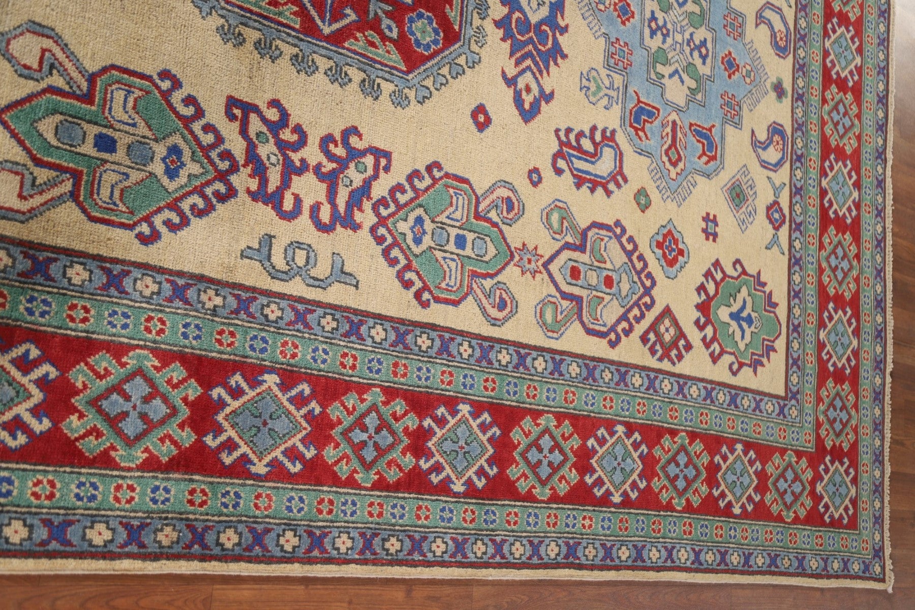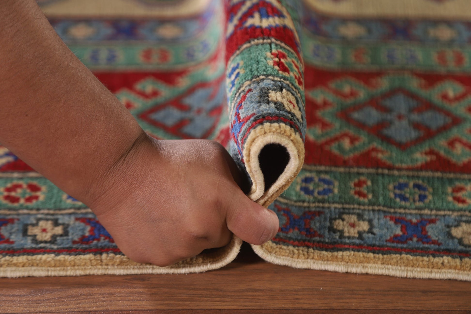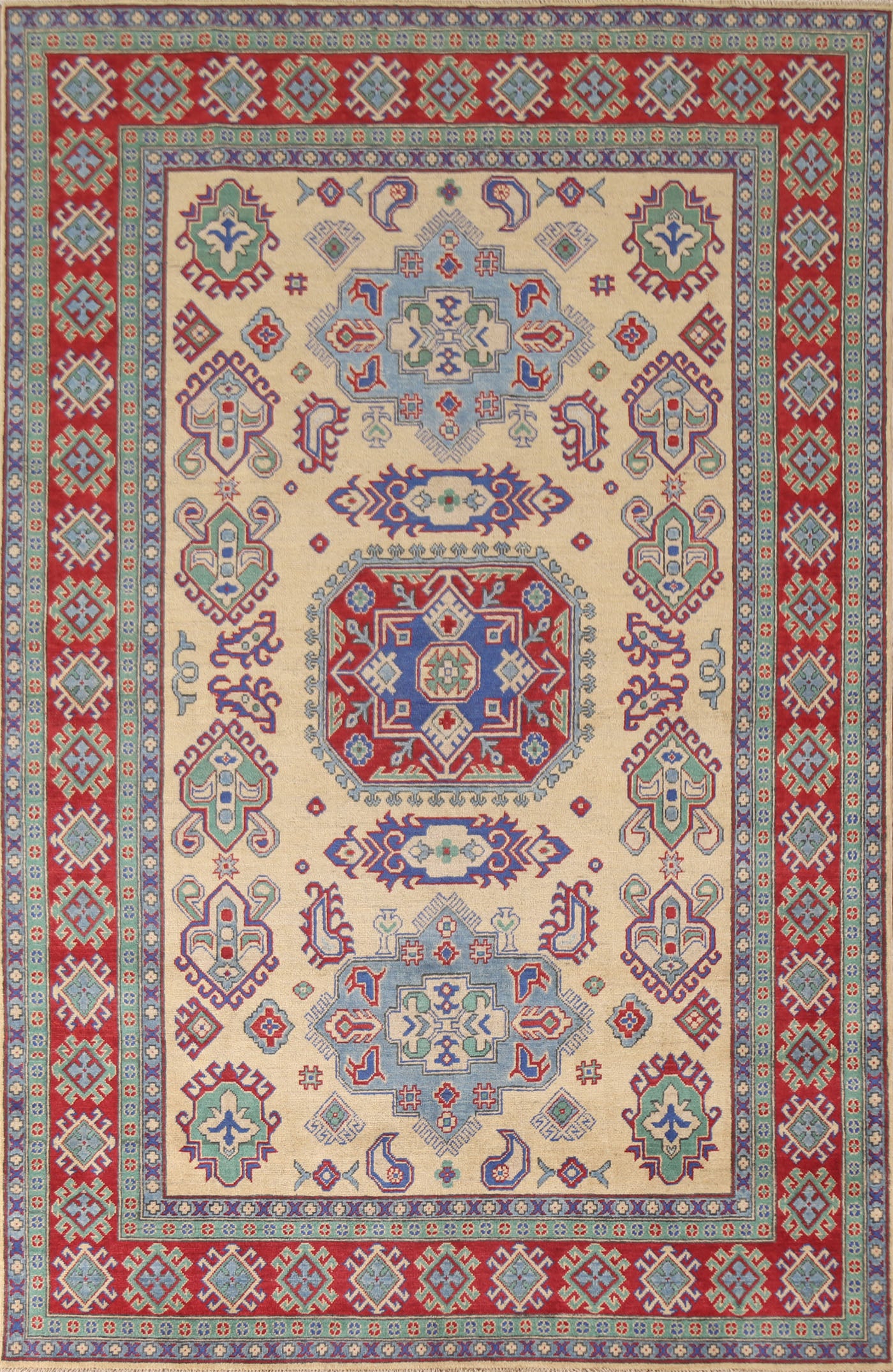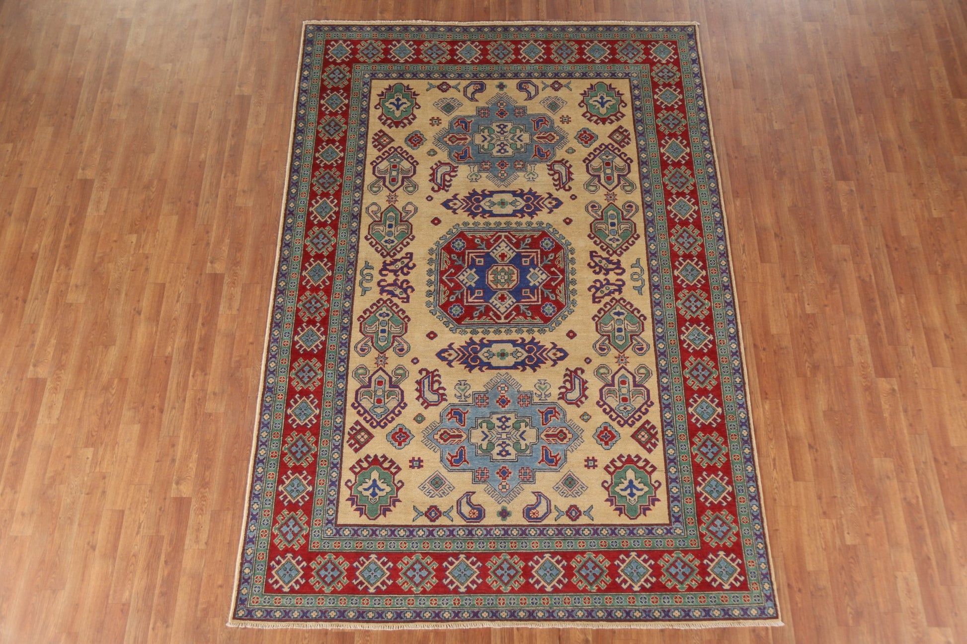 A Beautiful Genuine Pakistan Kazak rug is Hand Knotted by skillful weavers in Pakistan with 100% Wool Material. This rug is in New, First Quality condition. dimensions are 9' 9'' X 6' 8'' in foot and 297 X 203 in centimeter. the primary color is Peach.