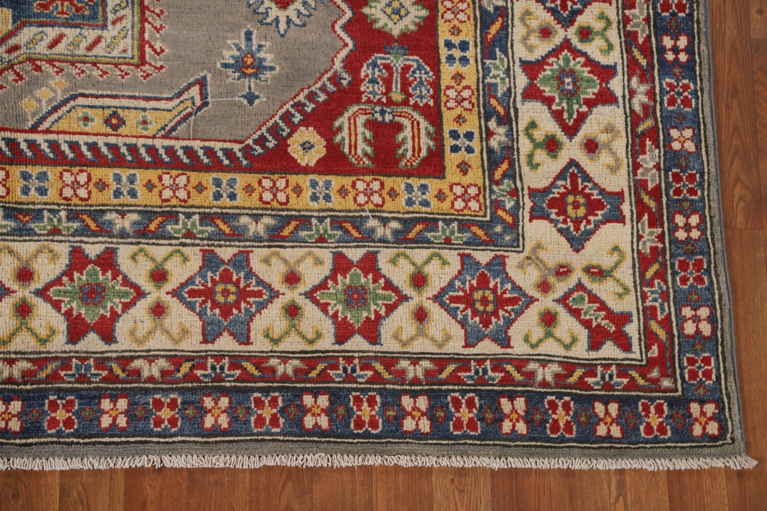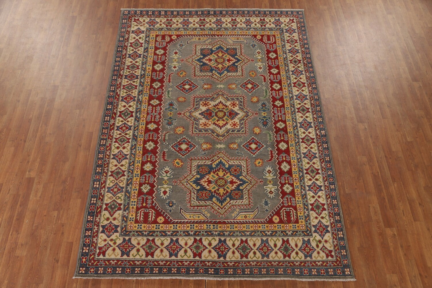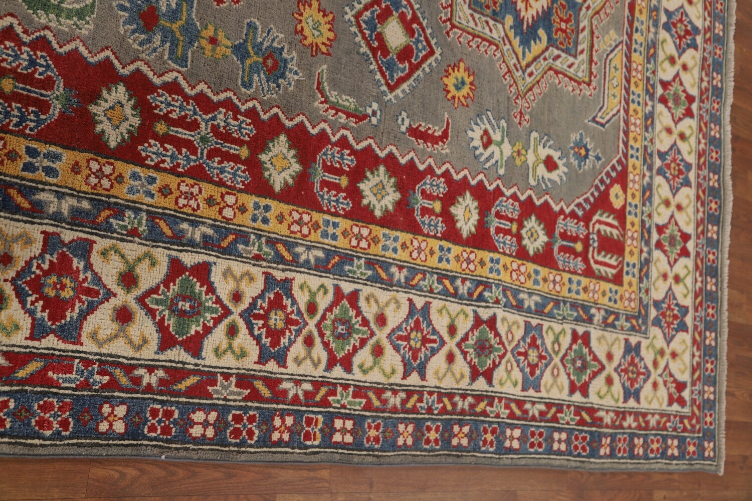 A Beautiful Genuine Pakistan Kazak rug is Hand Knotted by skillful weavers in Pakistan with 100% Wool Material. This rug is in New, First Quality condition. dimensions are 9' 7'' X 6' 8'' in foot and 292 X 203 in centimeter. the primary color is Greys & Charcoal.