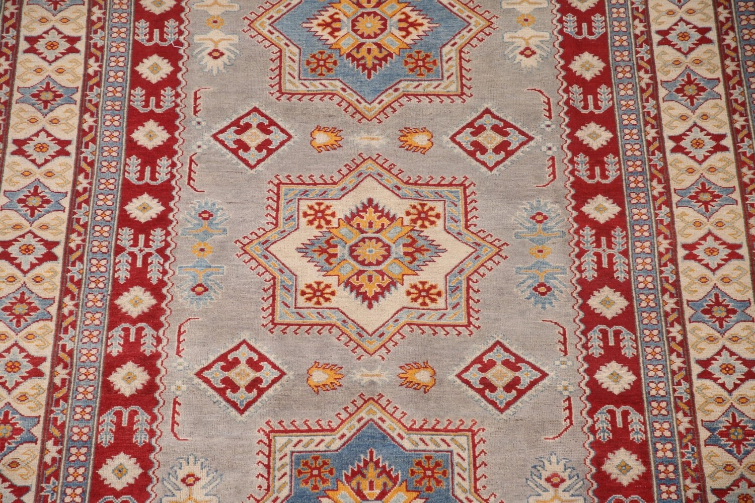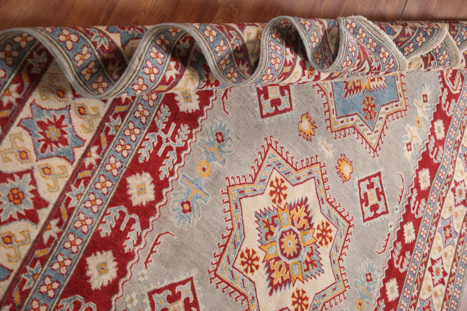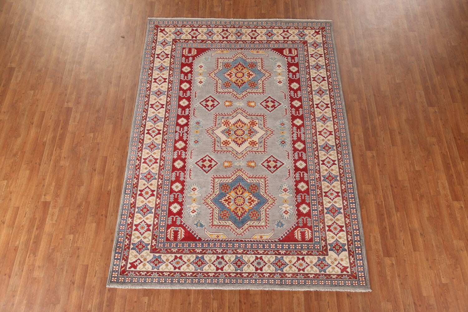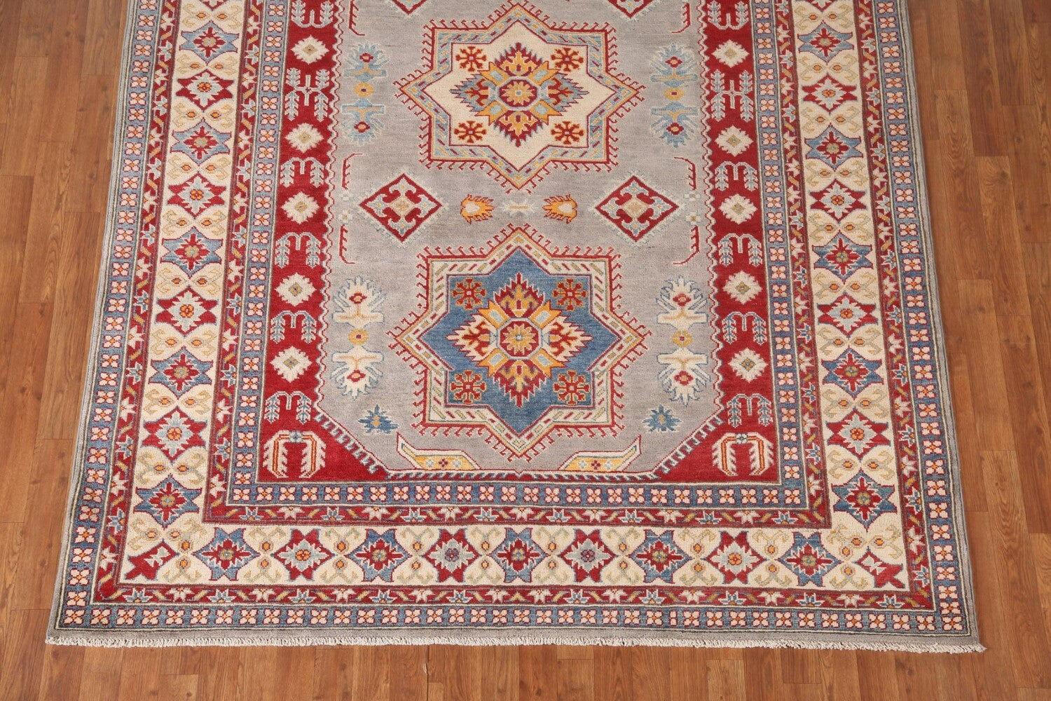 A Beautiful Genuine Pakistan Kazak rug is Hand Knotted by skillful weavers in Pakistan with 100% Wool Material. This rug is in New, First Quality condition. dimensions are 9' 8'' X 6' 9'' in foot and 295 X 206 in centimeter. the primary color is Greys & Charcoal.