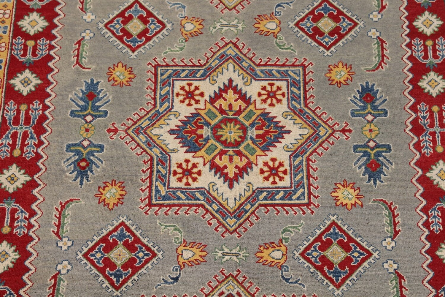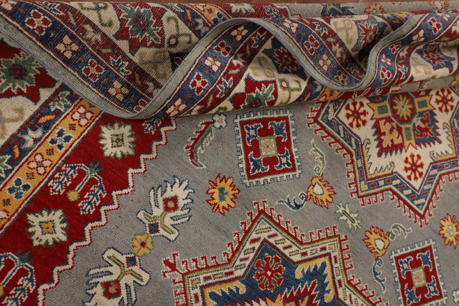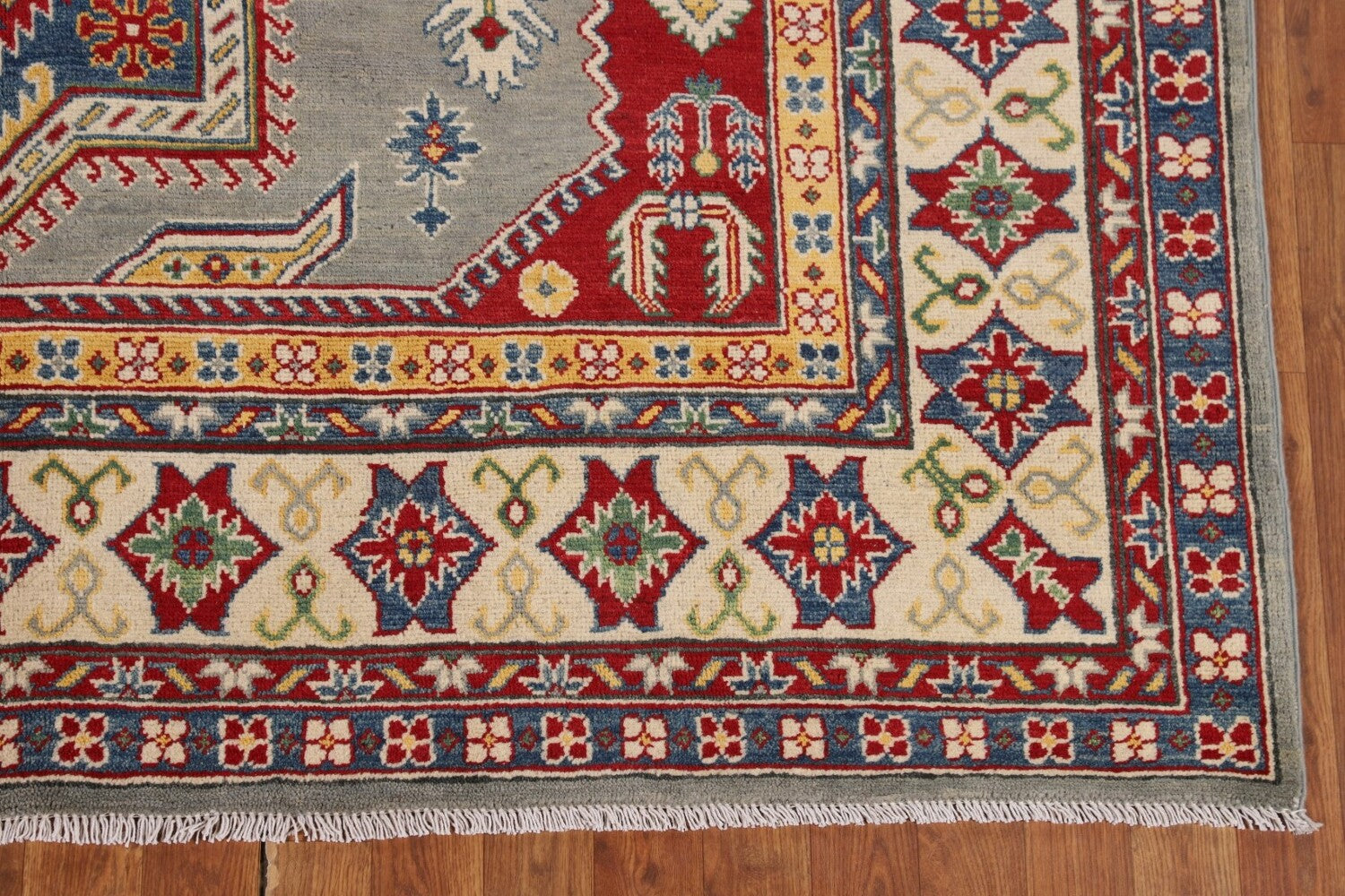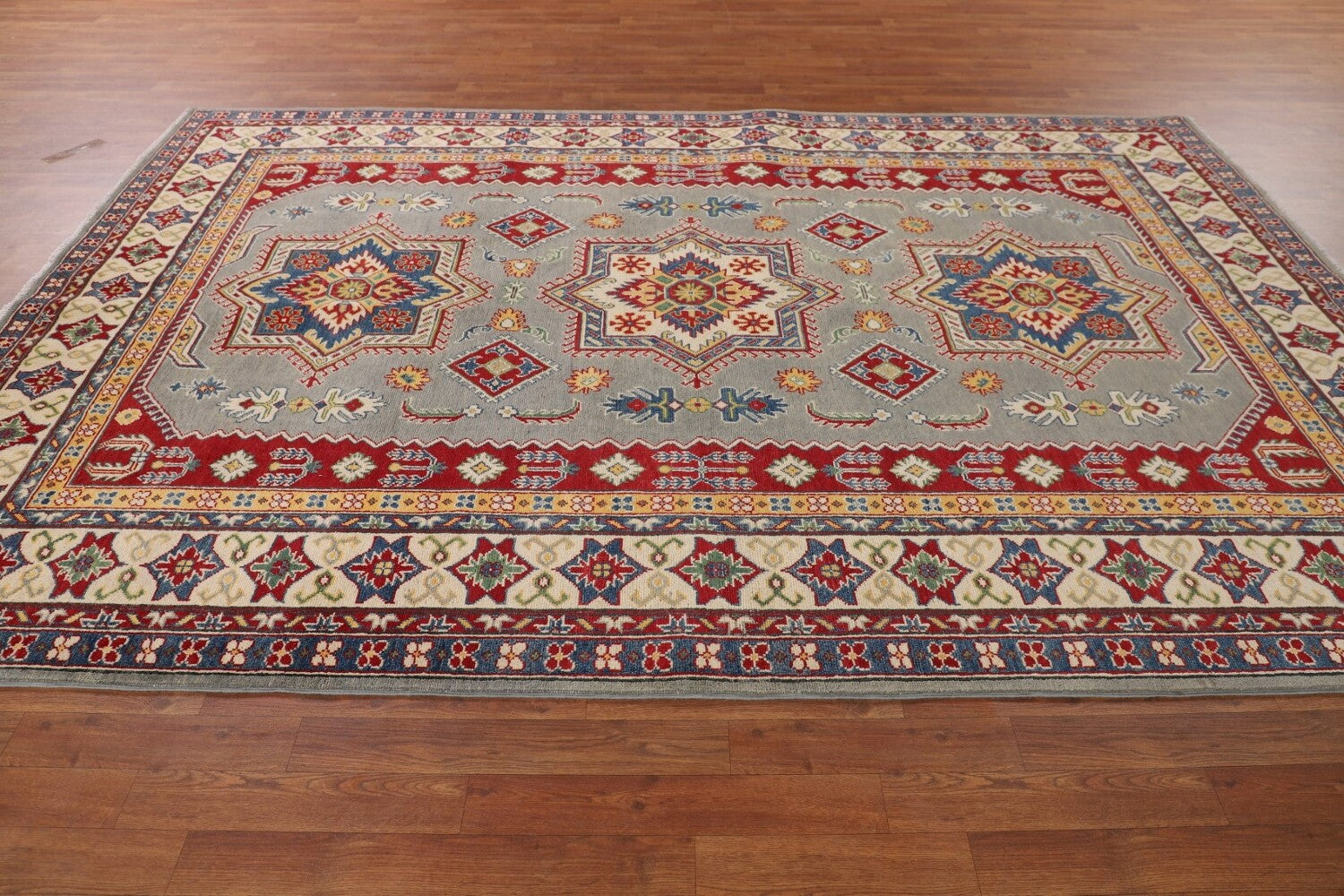 A Beautiful Genuine Pakistan Kazak rug is Hand Knotted by skillful weavers in Pakistan with 100% Wool Material. This rug is in New, First Quality condition. dimensions are 10' 3'' X 6' 10'' in foot and 312 X 208 in centimeter. the primary color is Greys & Charcoal.