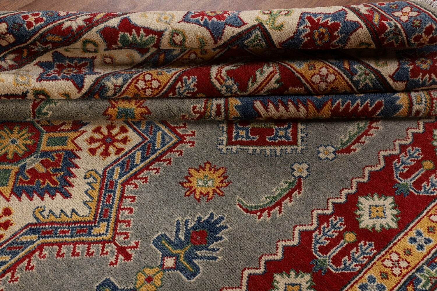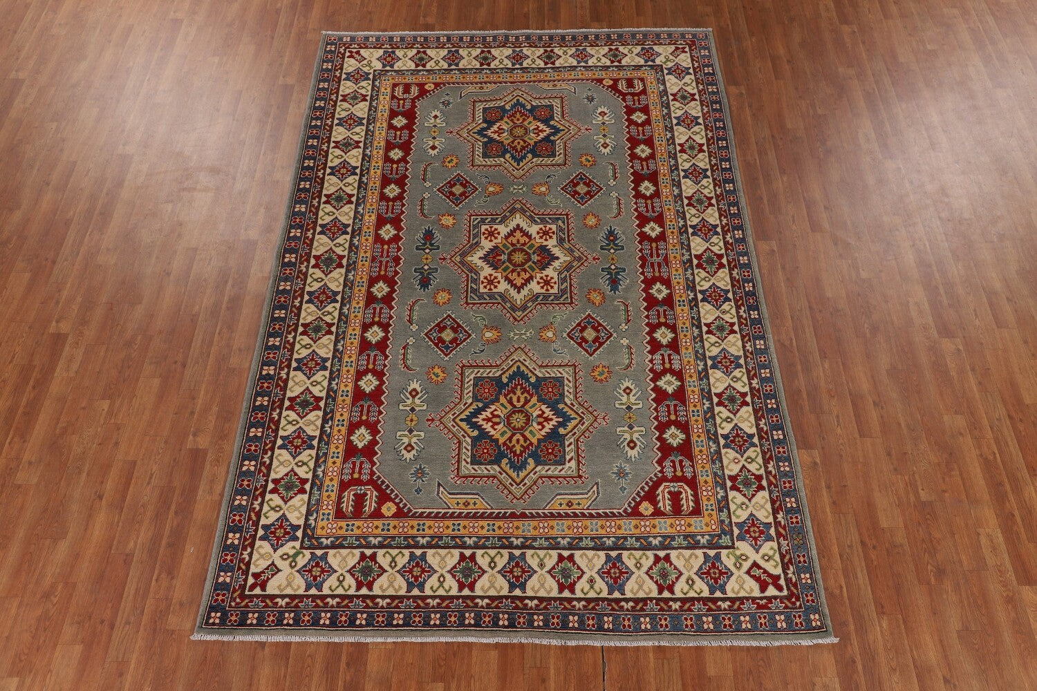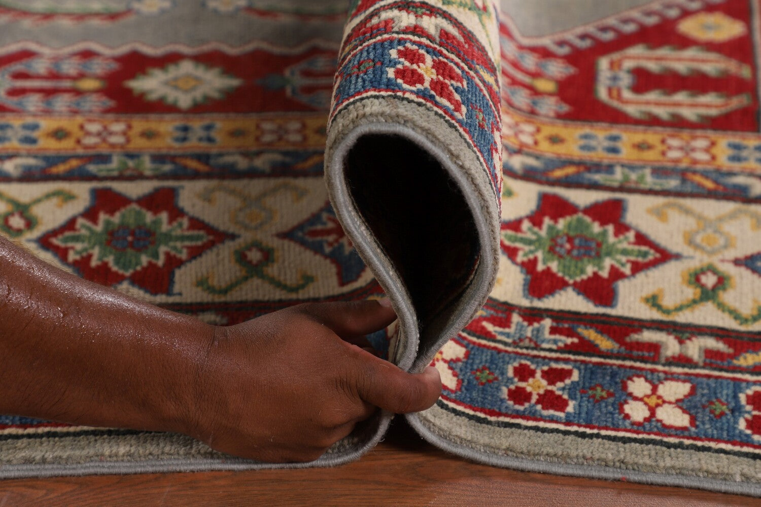 A Beautiful Genuine Pakistan Kazak rug is Hand Knotted by skillful weavers in Pakistan with 100% Wool Material. This rug is in New, First Quality condition. dimensions are 10' 3'' X 6' 10'' in foot and 312 X 208 in centimeter. the primary color is Greys & Charcoal.