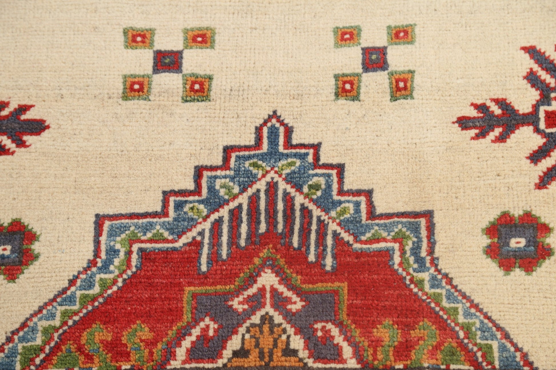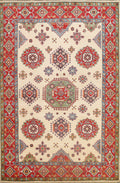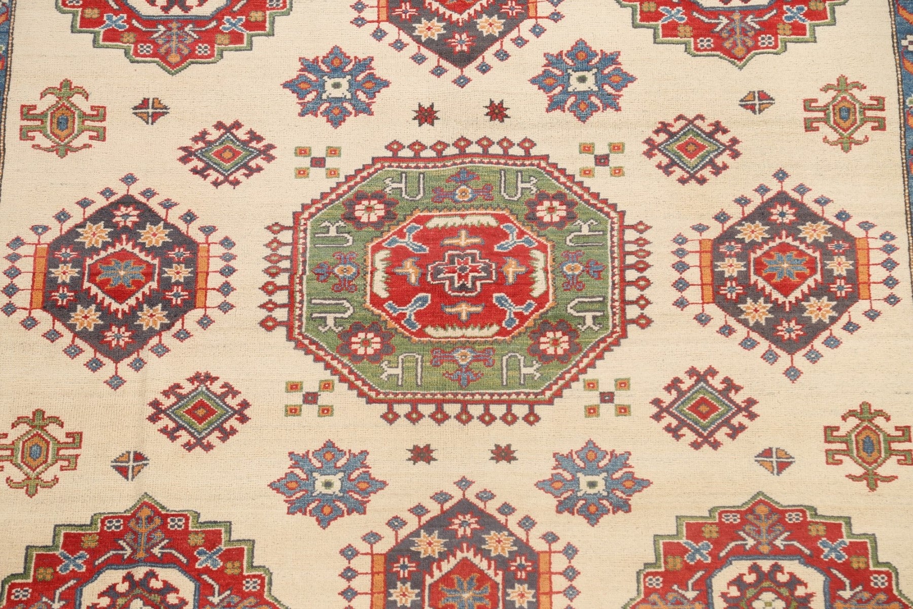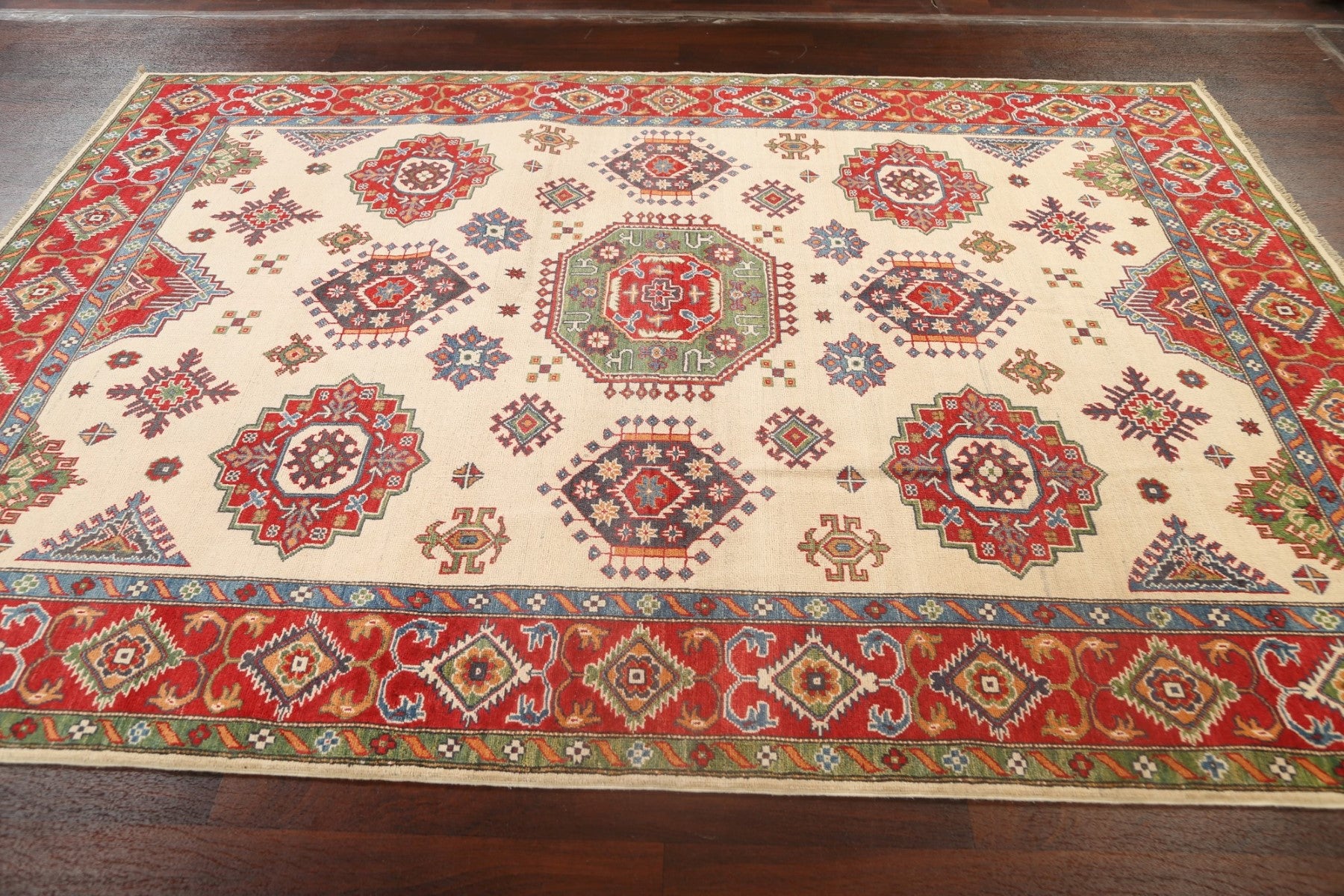 A Beautiful Genuine Pakistan Kazak rug is Hand Knotted by skillful weavers in Pakistan with 100% Wool Material. This rug is in New, First Quality condition. dimensions are 9' 8'' X 6' 11'' in foot and 295 X 211 in centimeter. the primary color is Beige & Ivories.