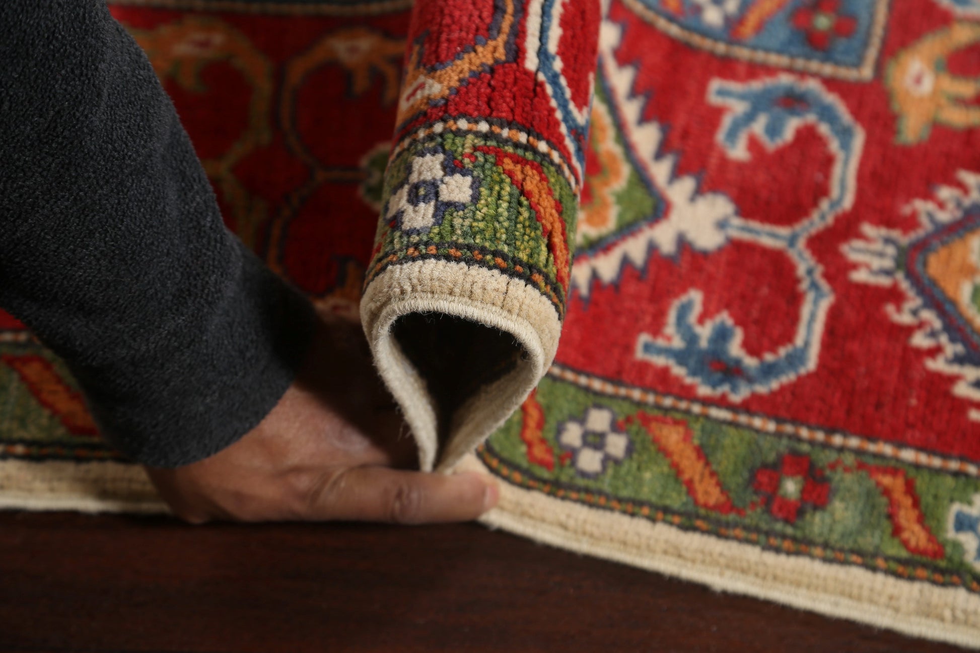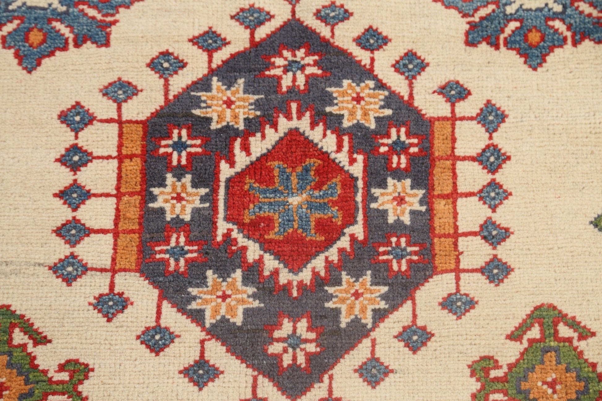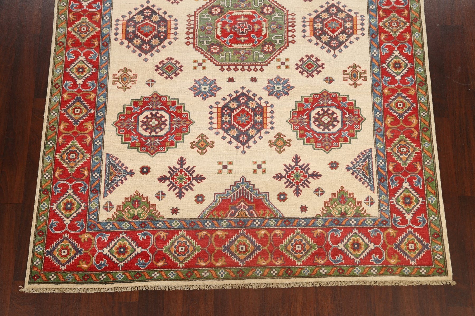 A Beautiful Genuine Pakistan Kazak rug is Hand Knotted by skillful weavers in Pakistan with 100% Wool Material. This rug is in New, First Quality condition. dimensions are 9' 8'' X 6' 11'' in foot and 295 X 211 in centimeter. the primary color is Beige & Ivories.