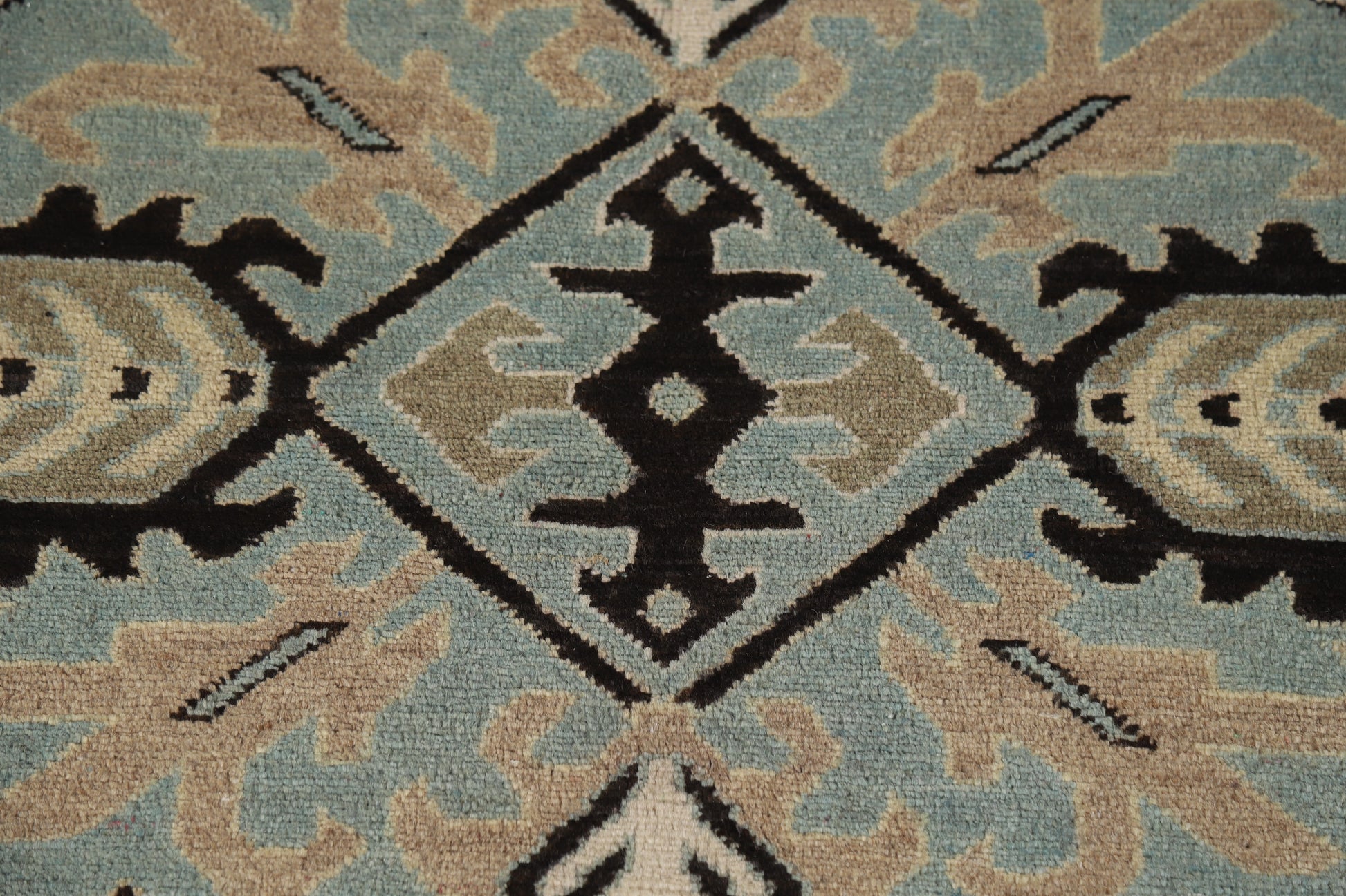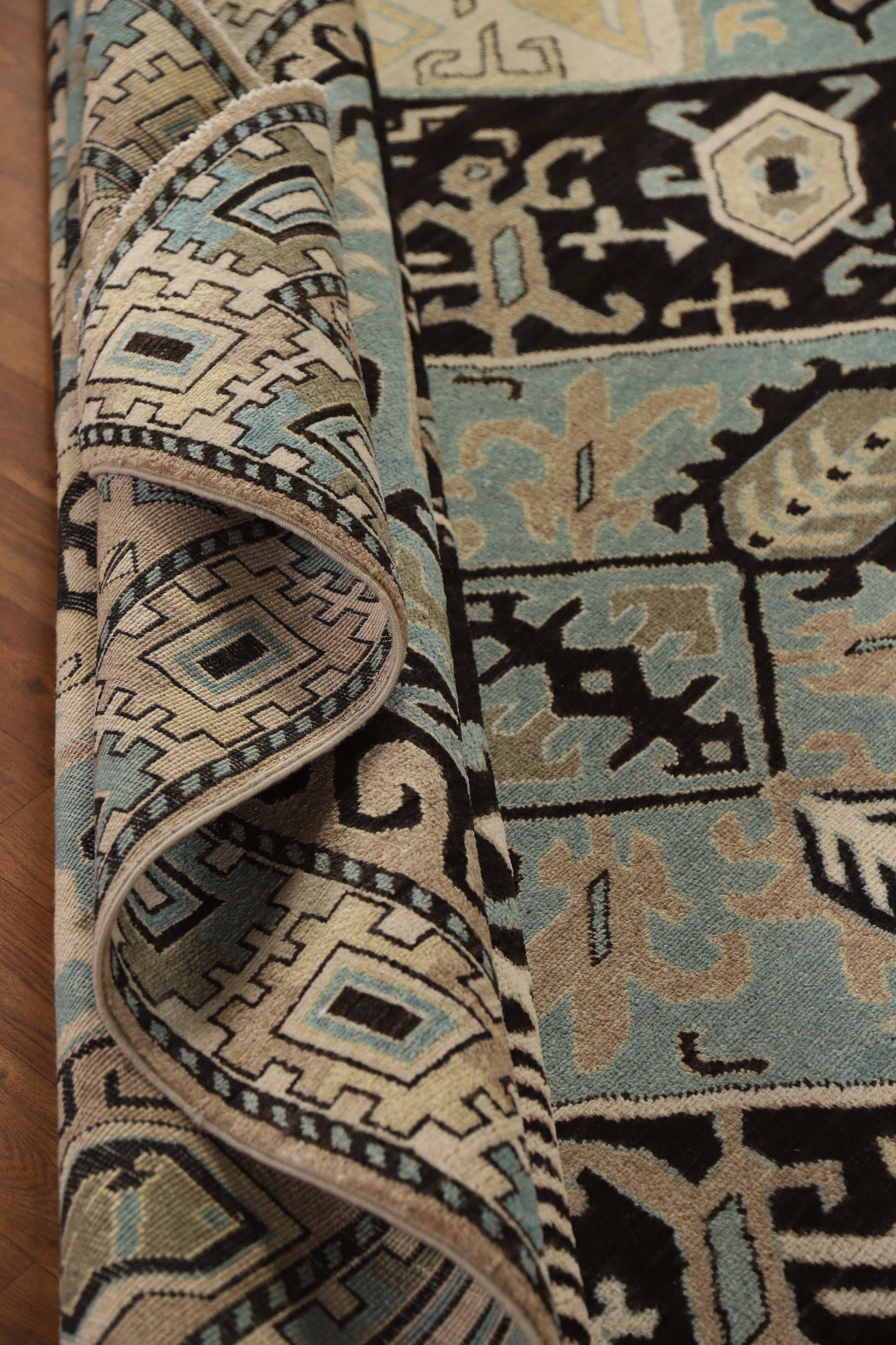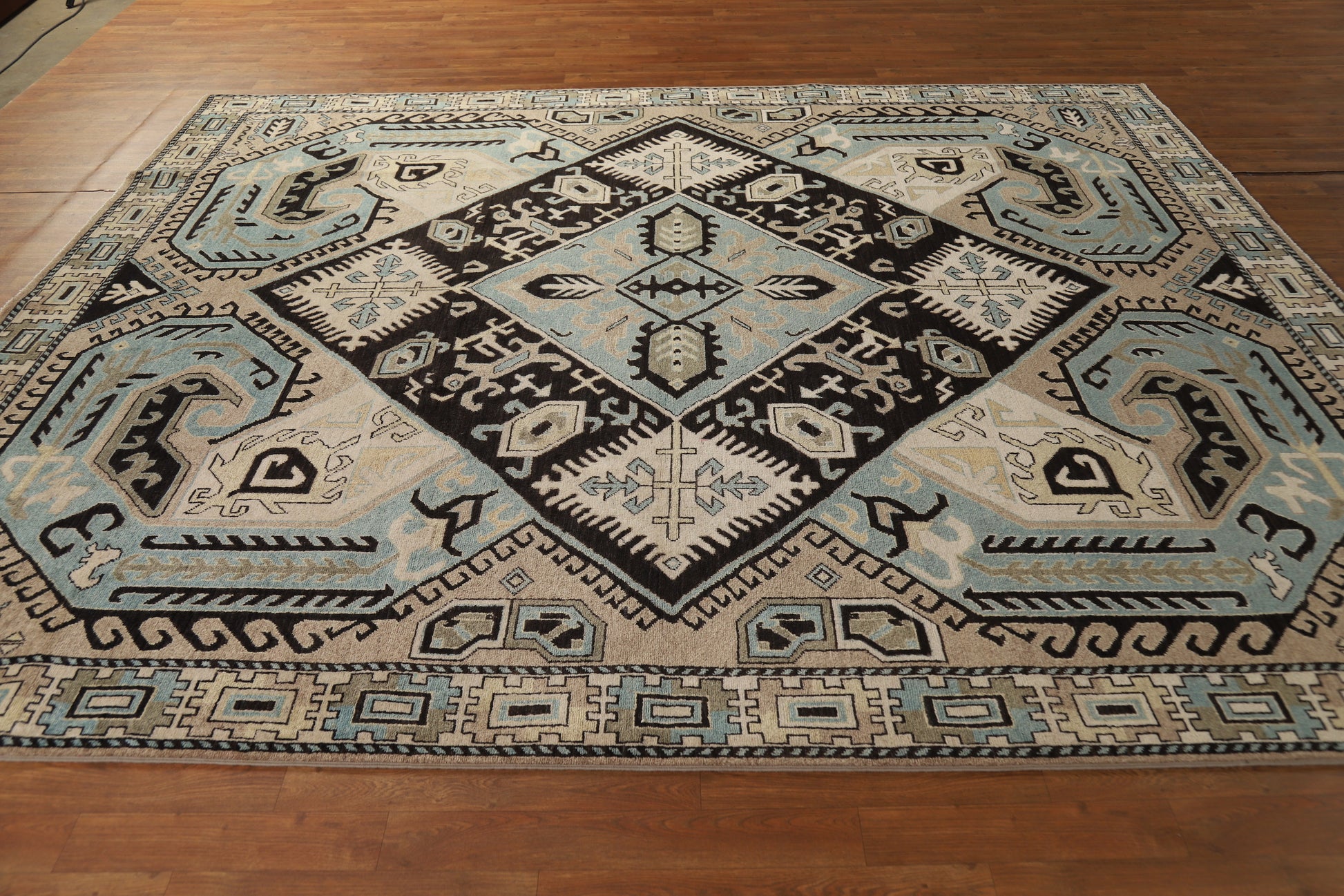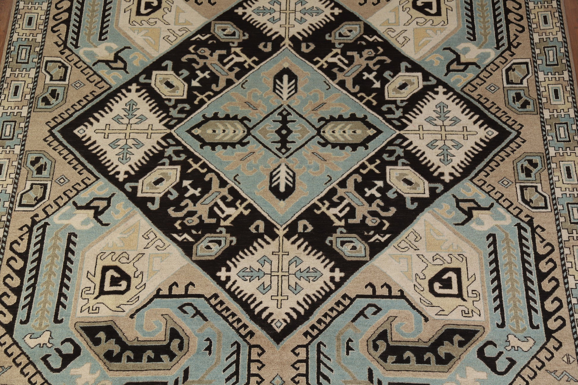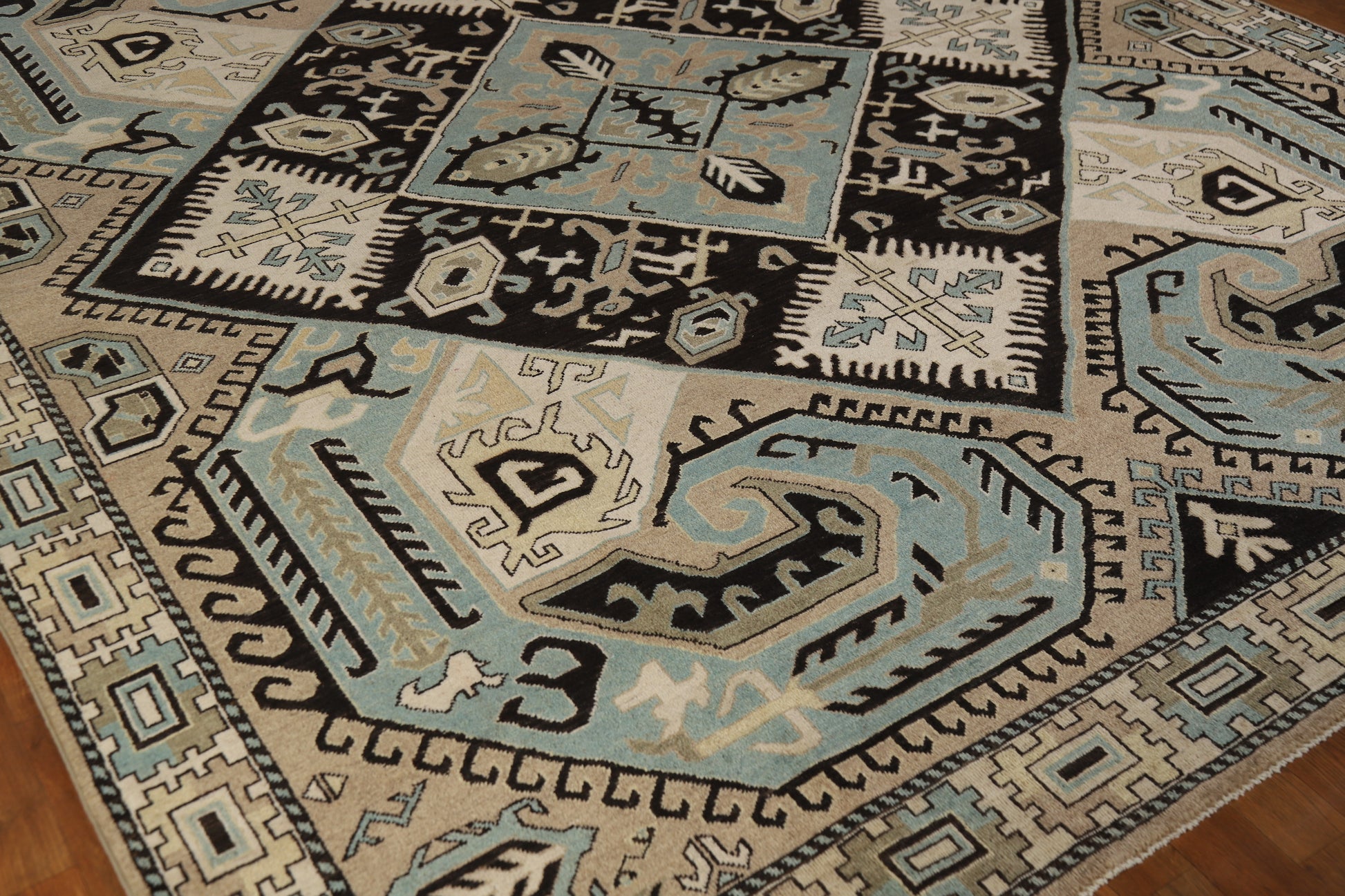 A Beautiful Genuine Pakistan Kazak rug is Hand Knotted by skillful weavers in Pakistan with 100% Wool Material. This rug is in New, First Quality condition. dimensions are 9' 7'' X 8' 2'' in foot and 292 X 249 in centimeter. the primary color is Black.