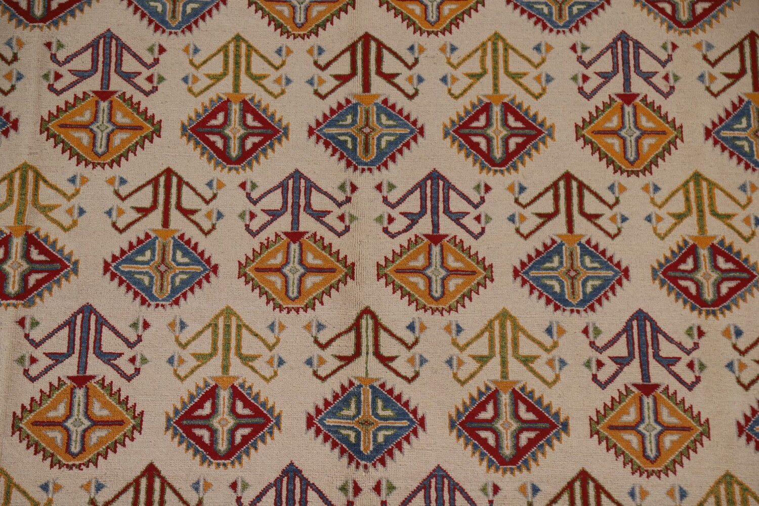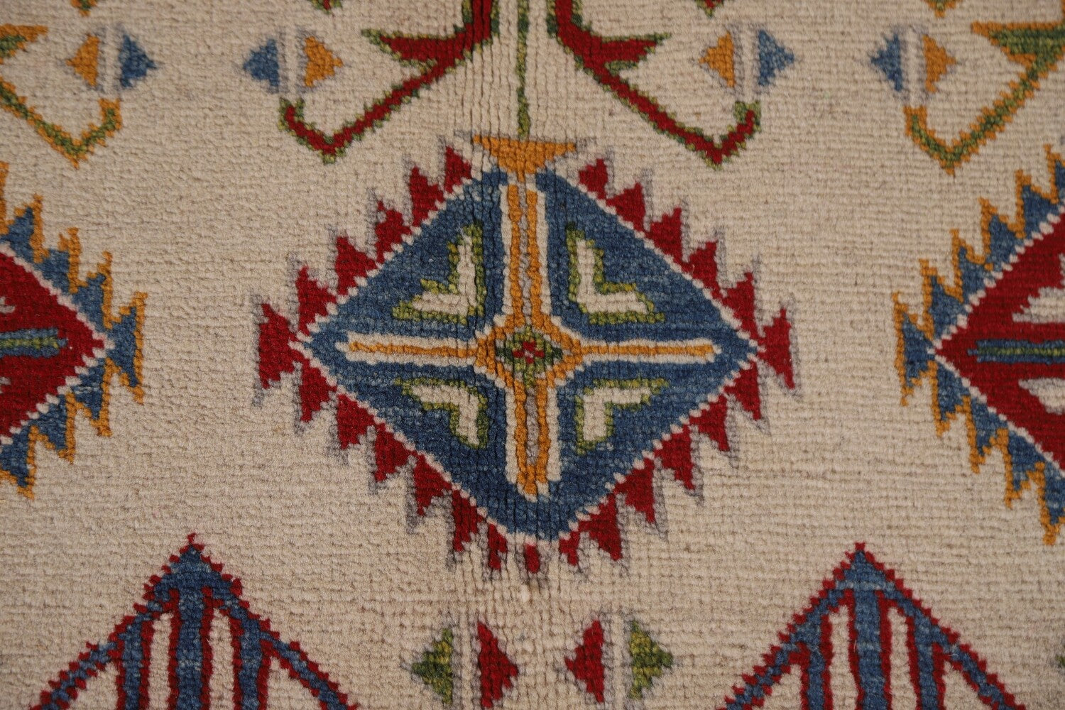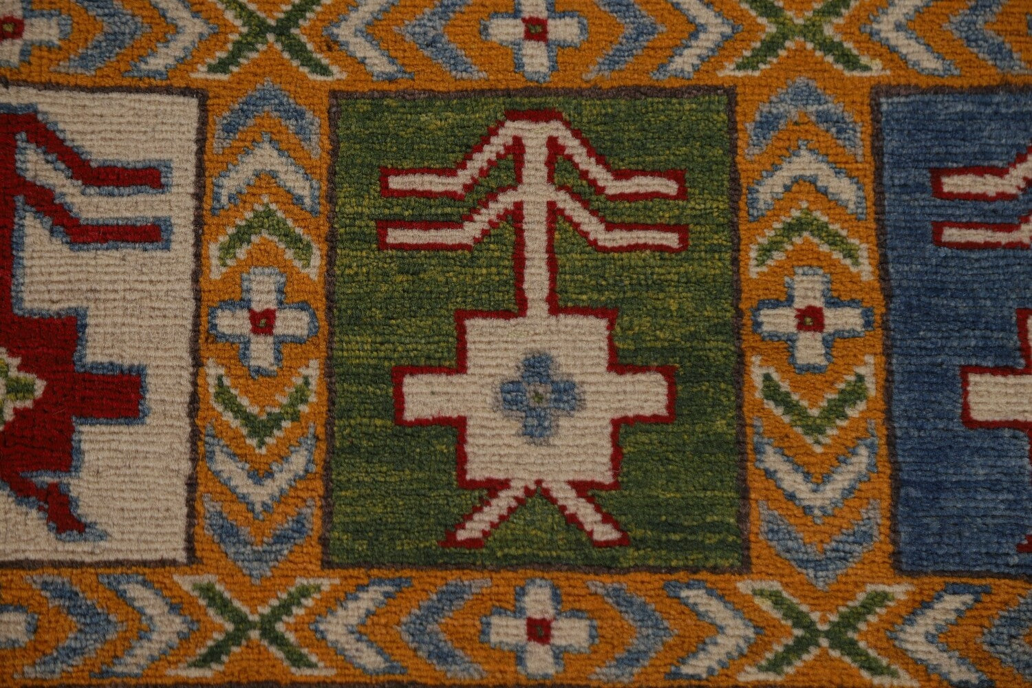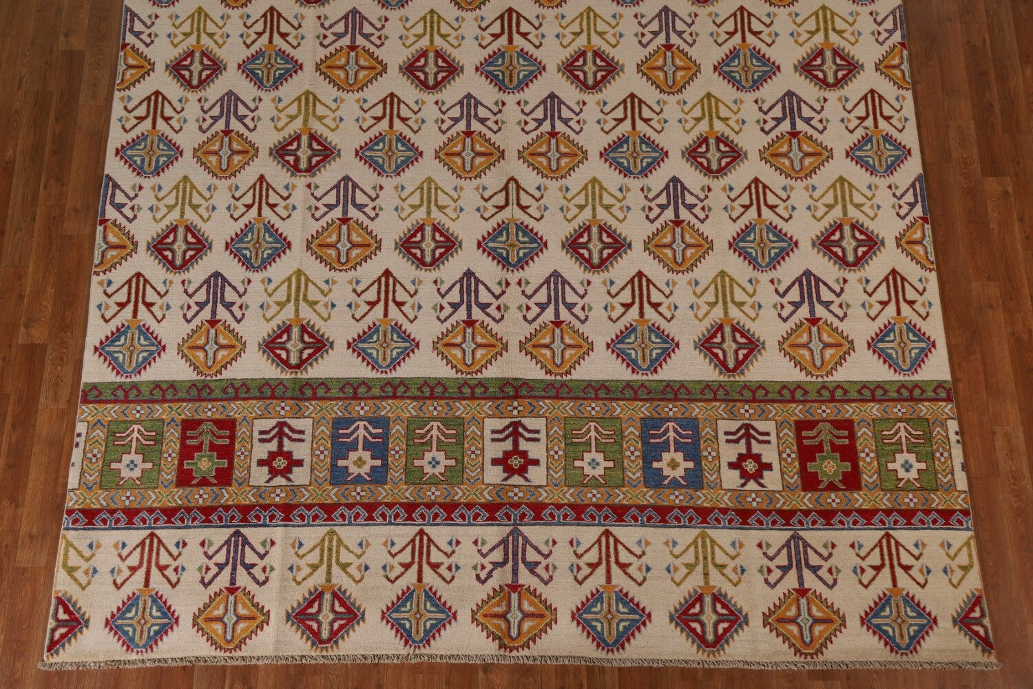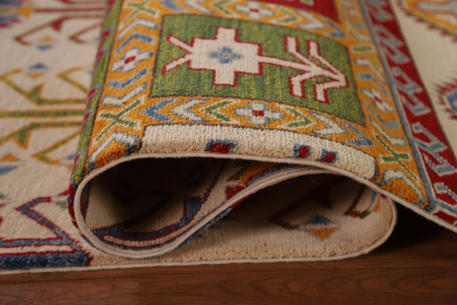 A Beautiful Genuine Pakistan Kazak rug is Hand Knotted by skillful weavers in Pakistan with 100% Wool Material. This rug is in New, First Quality condition. dimensions are 11' 5'' X 8' 2'' in foot and 348 X 249 in centimeter. the primary color is Beige & Ivories.