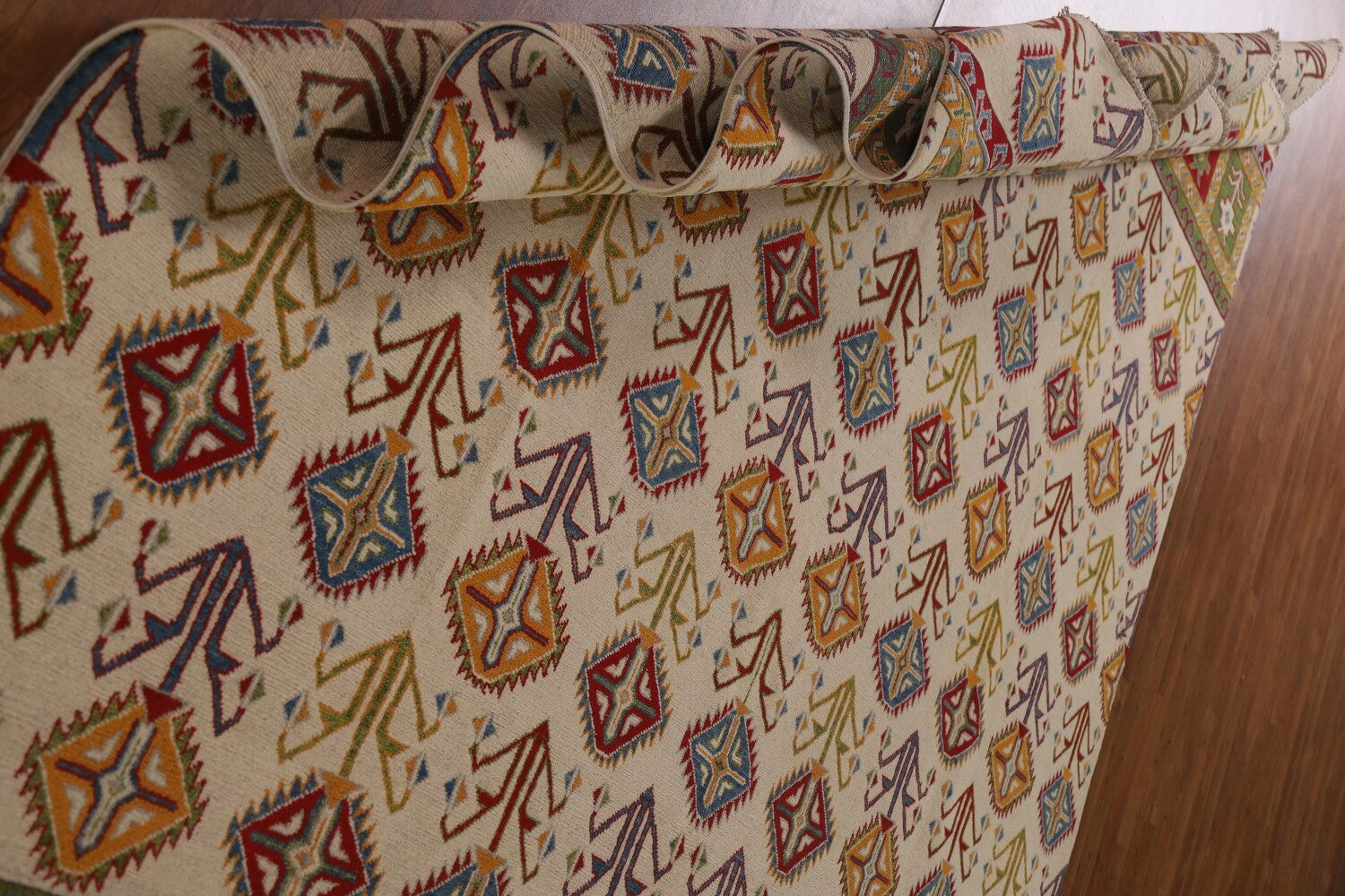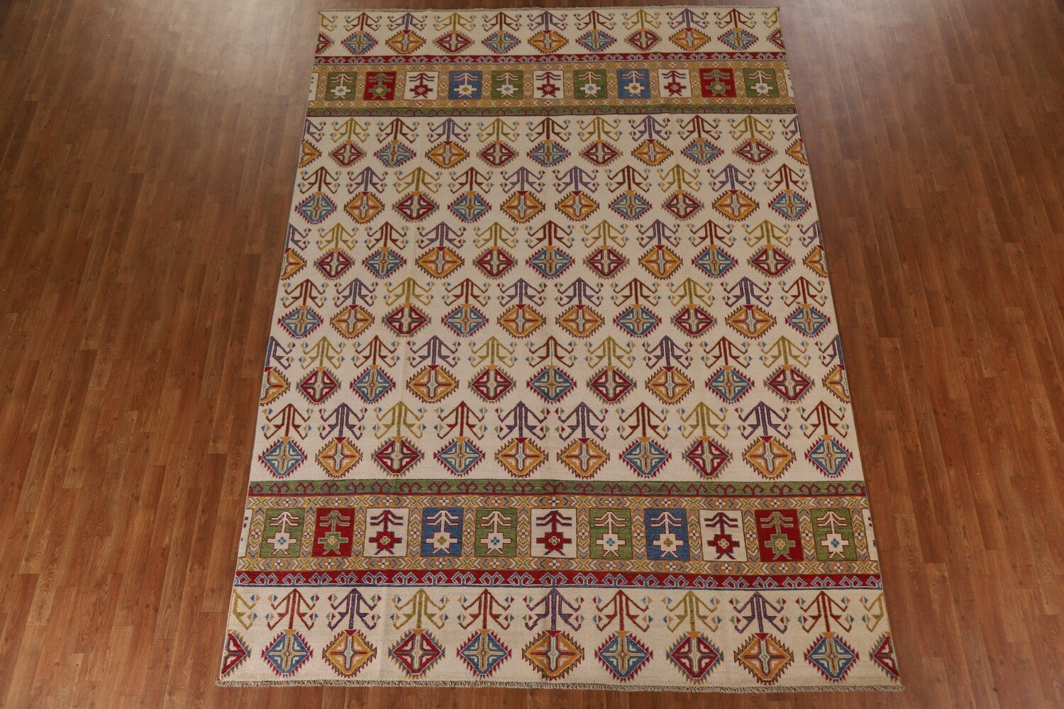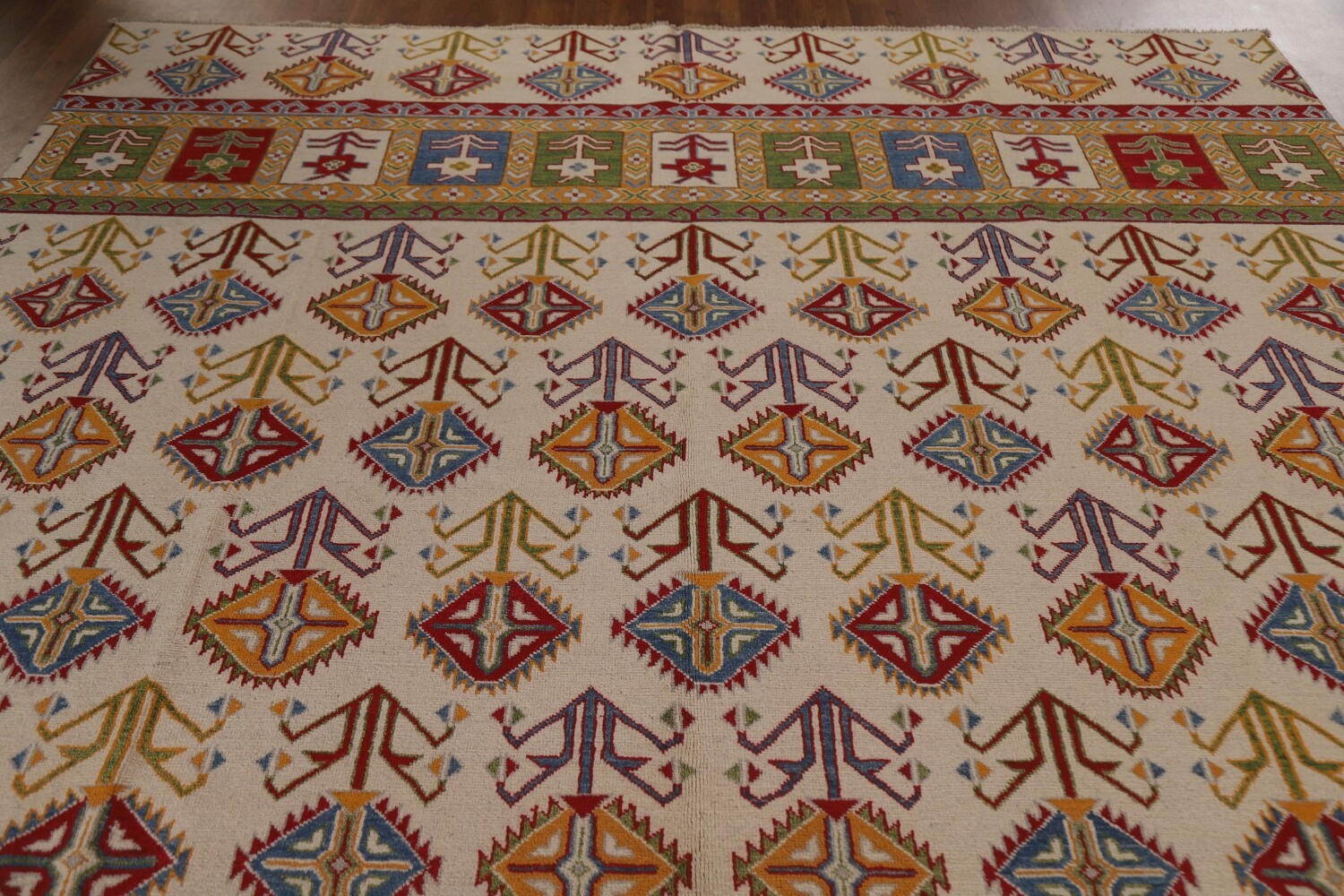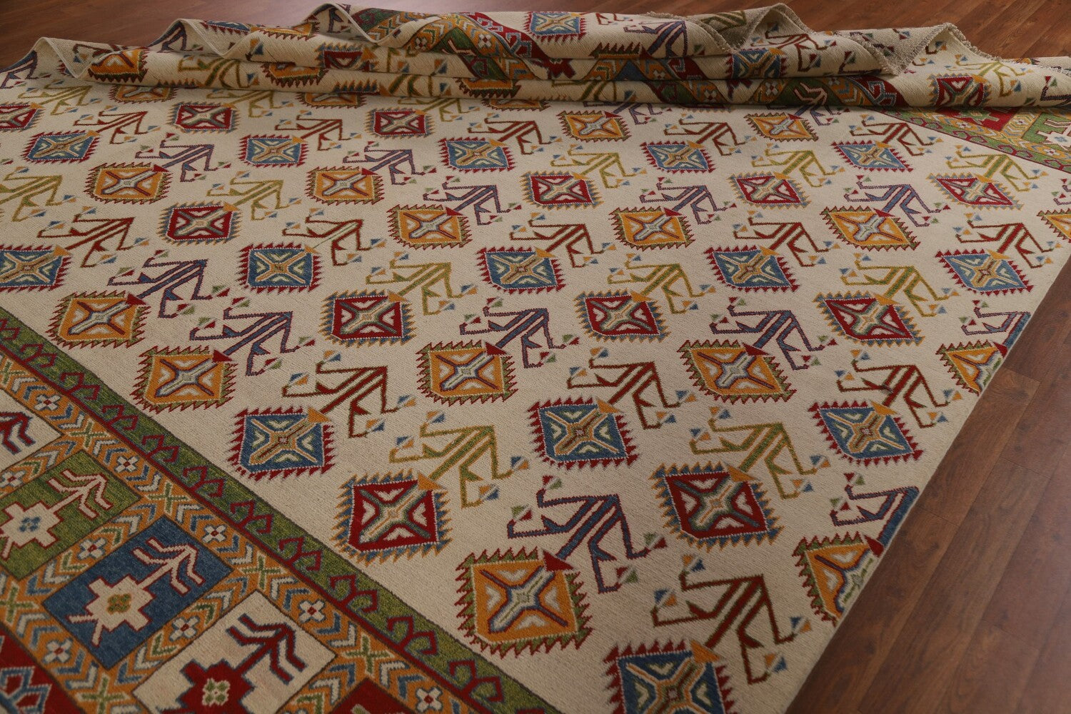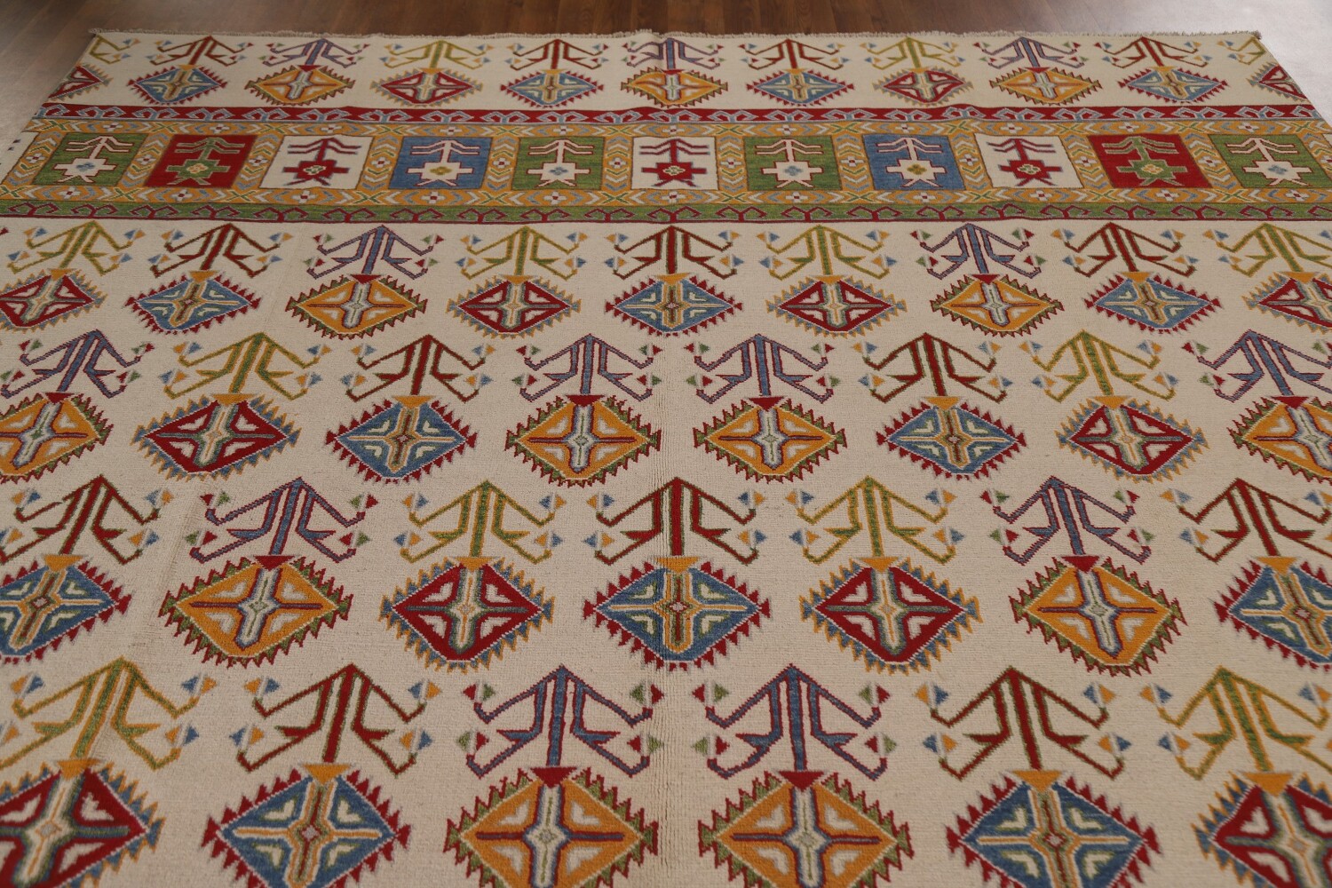 A Beautiful Genuine Pakistan Kazak rug is Hand Knotted by skillful weavers in Pakistan with 100% Wool Material. This rug is in New, First Quality condition. dimensions are 11' 5'' X 8' 2'' in foot and 348 X 249 in centimeter. the primary color is Beige & Ivories.