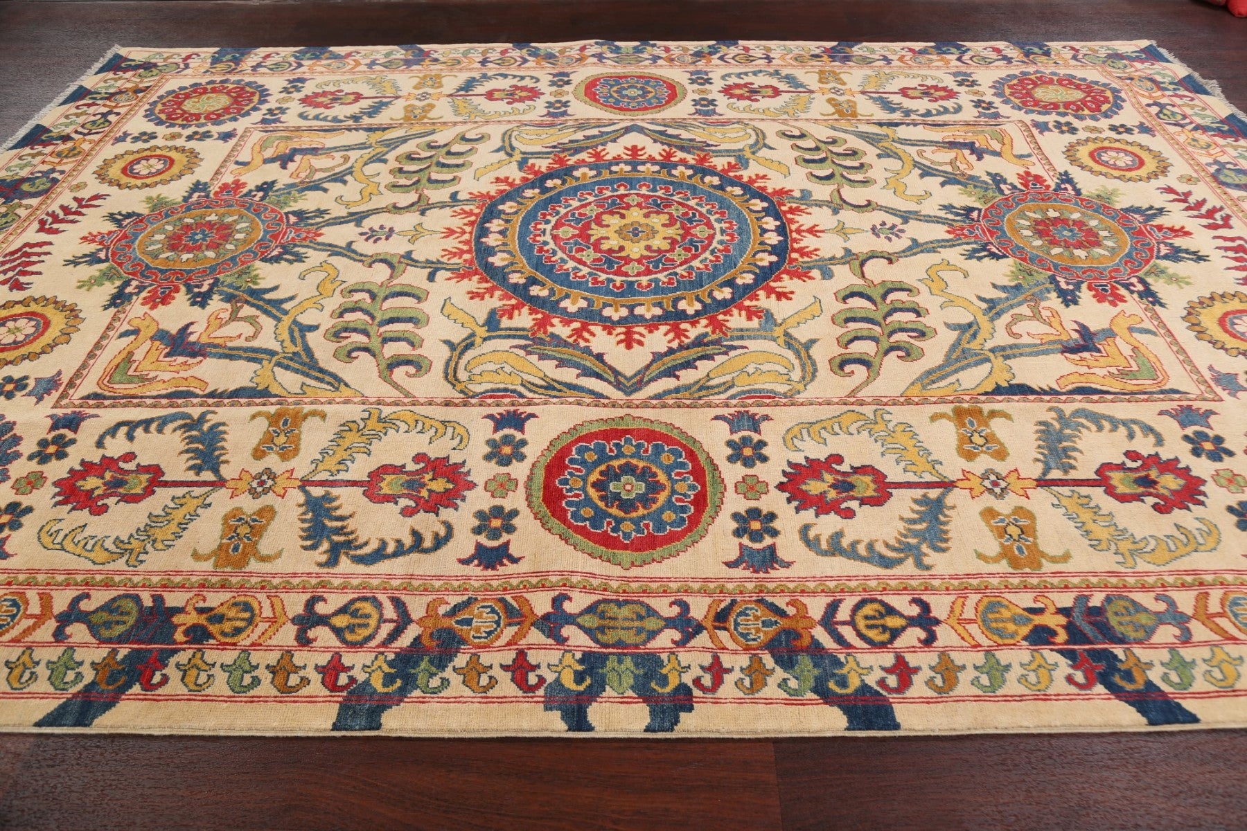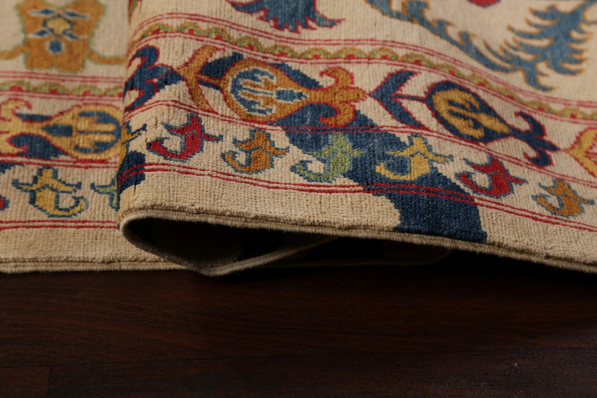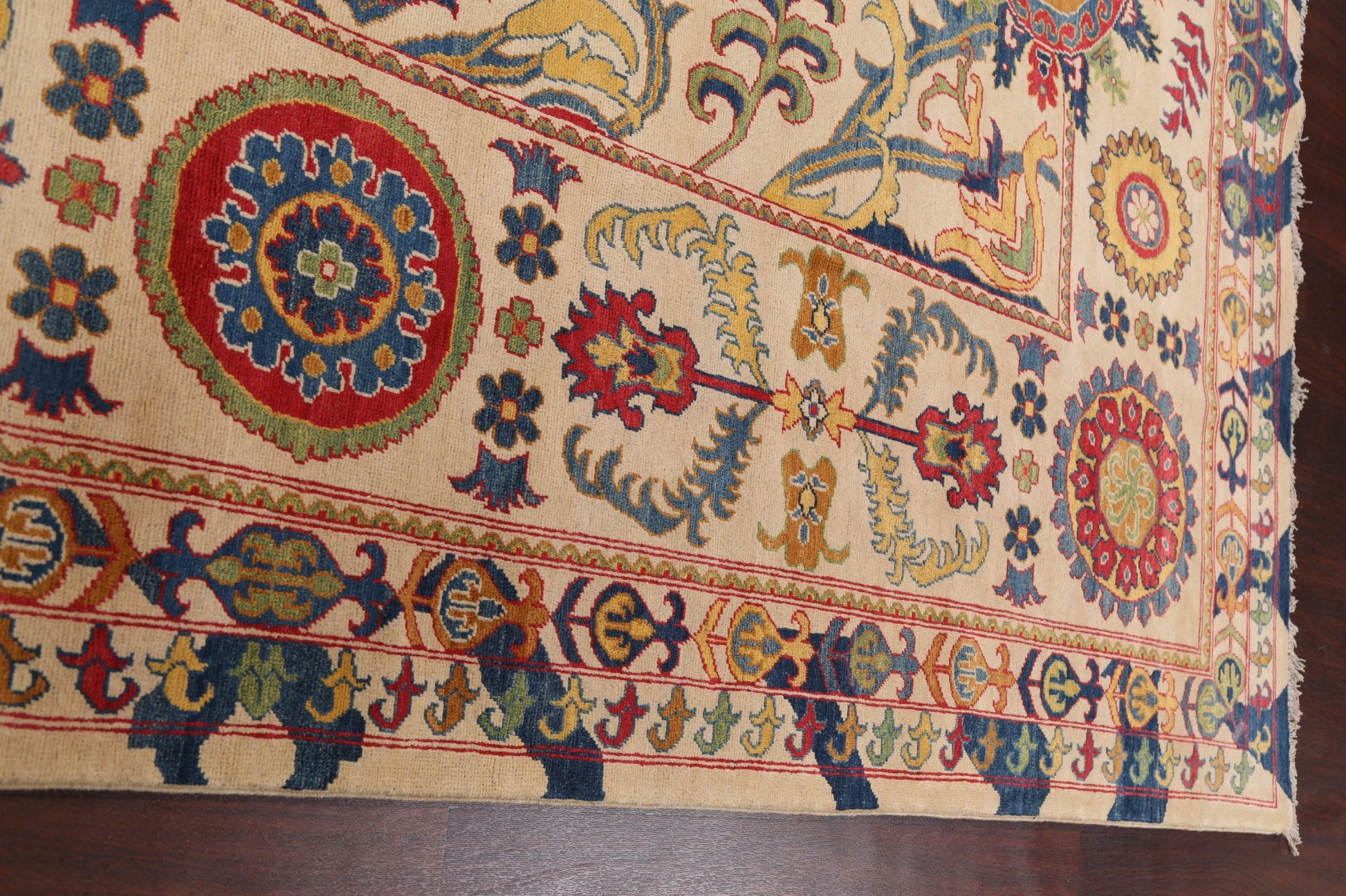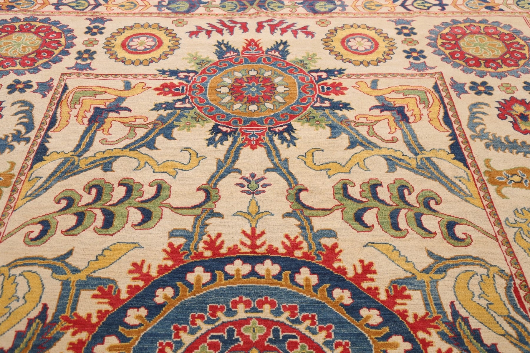 A Beautiful Genuine Pakistan Kazak rug is Hand Knotted by skillful weavers in Pakistan with 100% Wool Material. This rug is in New, First Quality condition. dimensions are 11' 6'' X 8' 4'' in foot and 351 X 254 in centimeter. the primary color is Beige & Ivories.