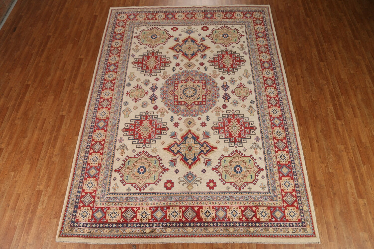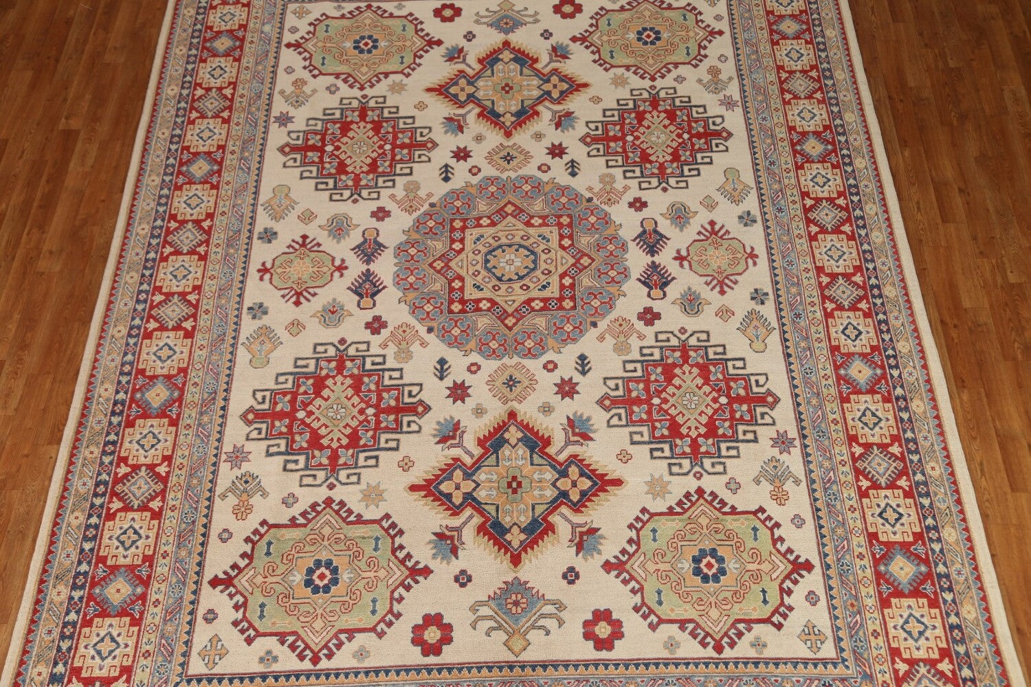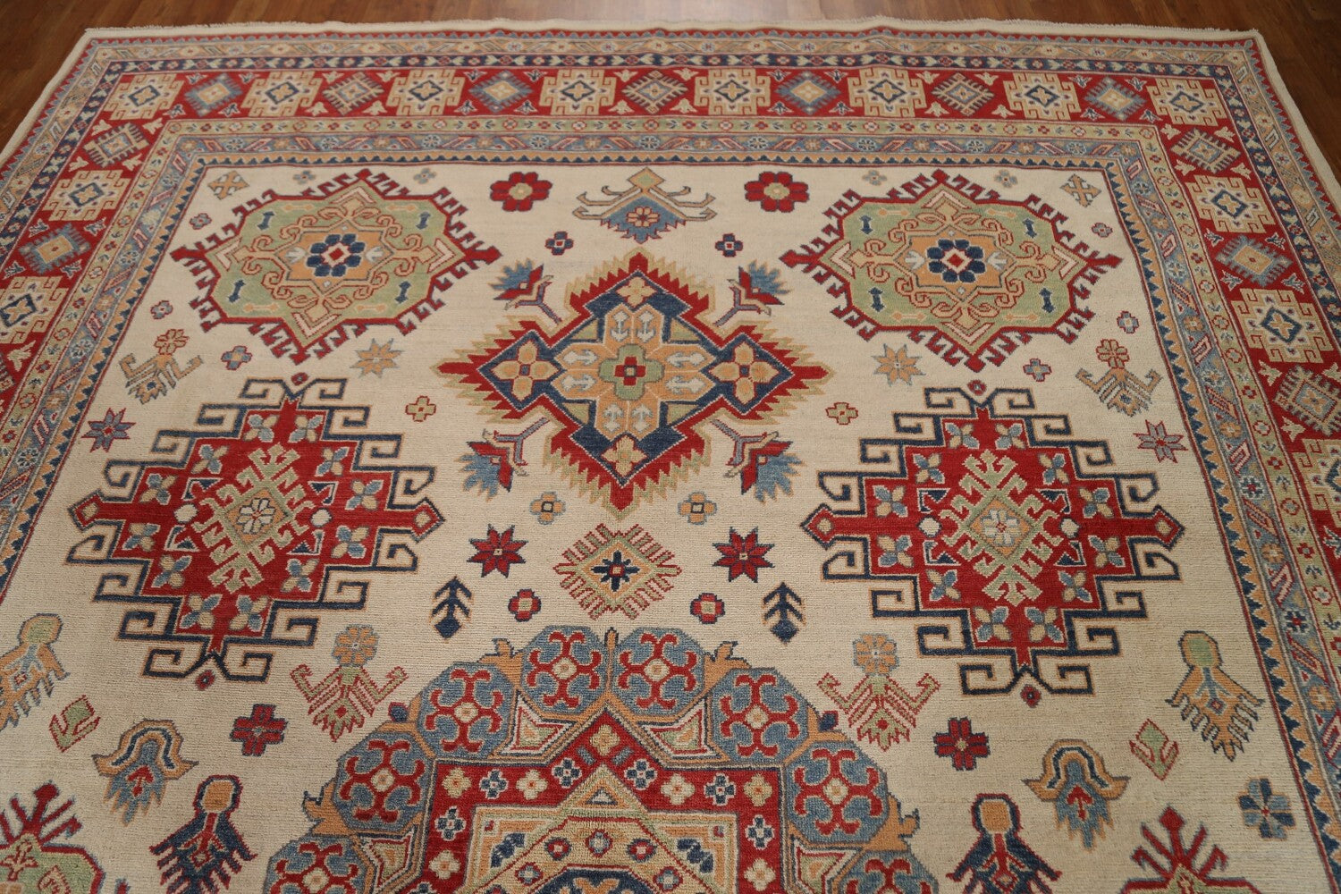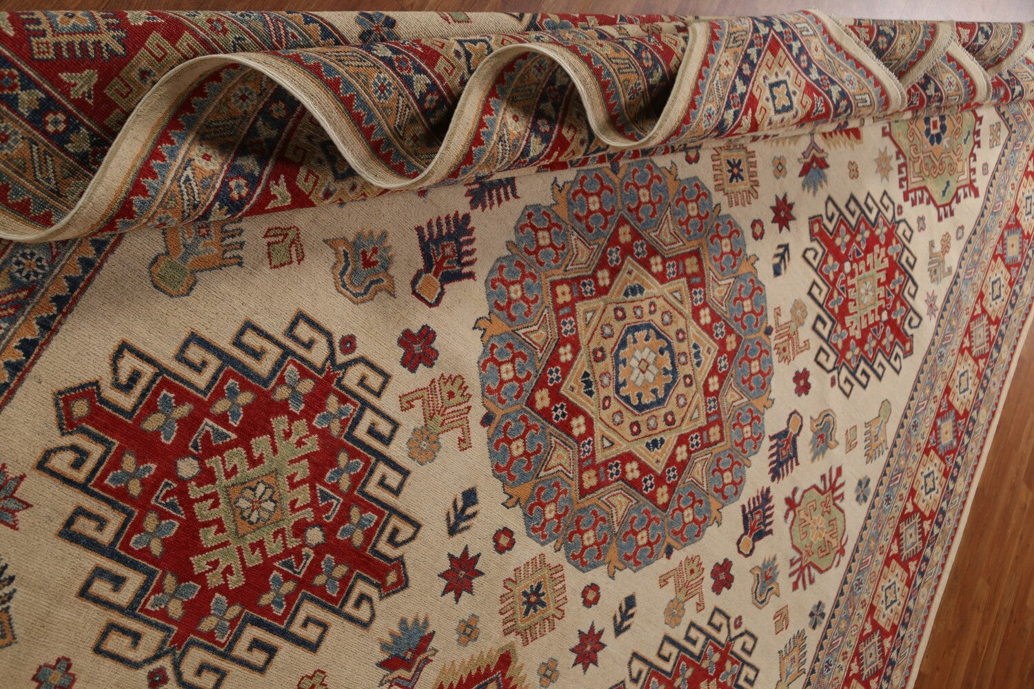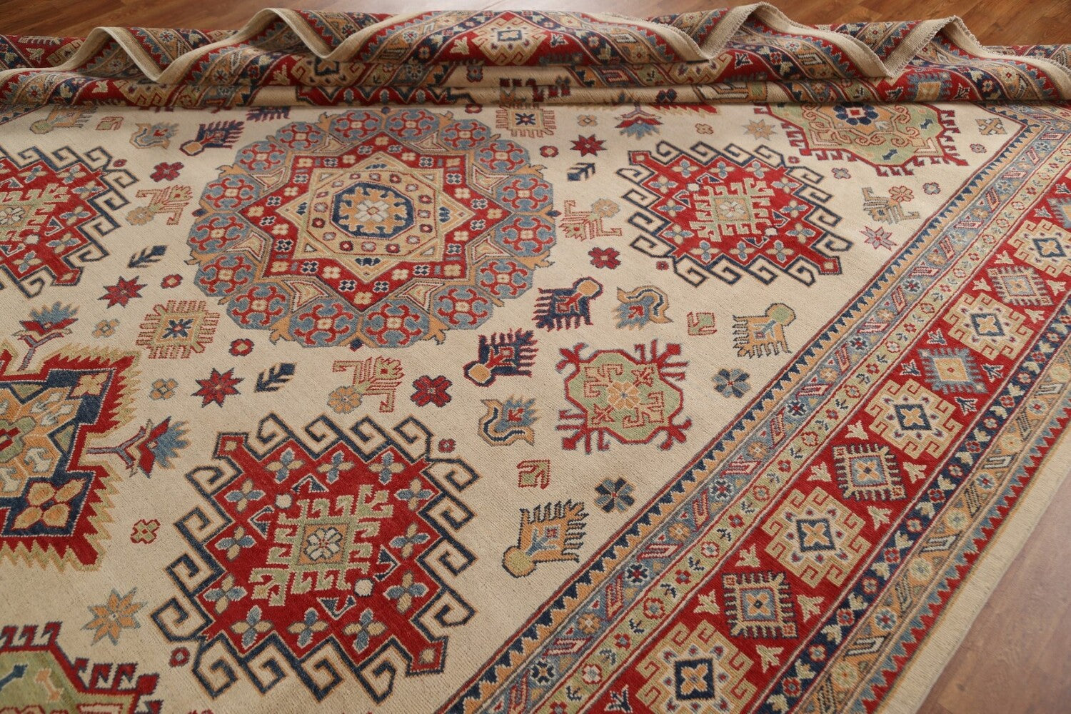 A Beautiful Genuine Pakistan Kazak rug is Hand Knotted by skillful weavers in Pakistan with 100% Wool Material. This rug is in condition. dimensions are 12' 2'' X 8' 11'' in foot and 371 X 272 in centimeter. the primary color is Beige & Ivories.